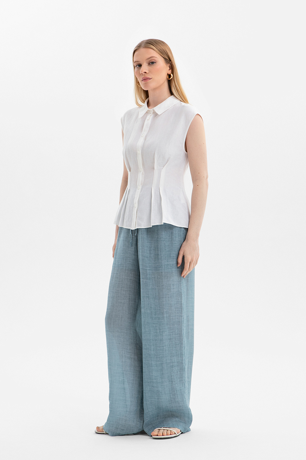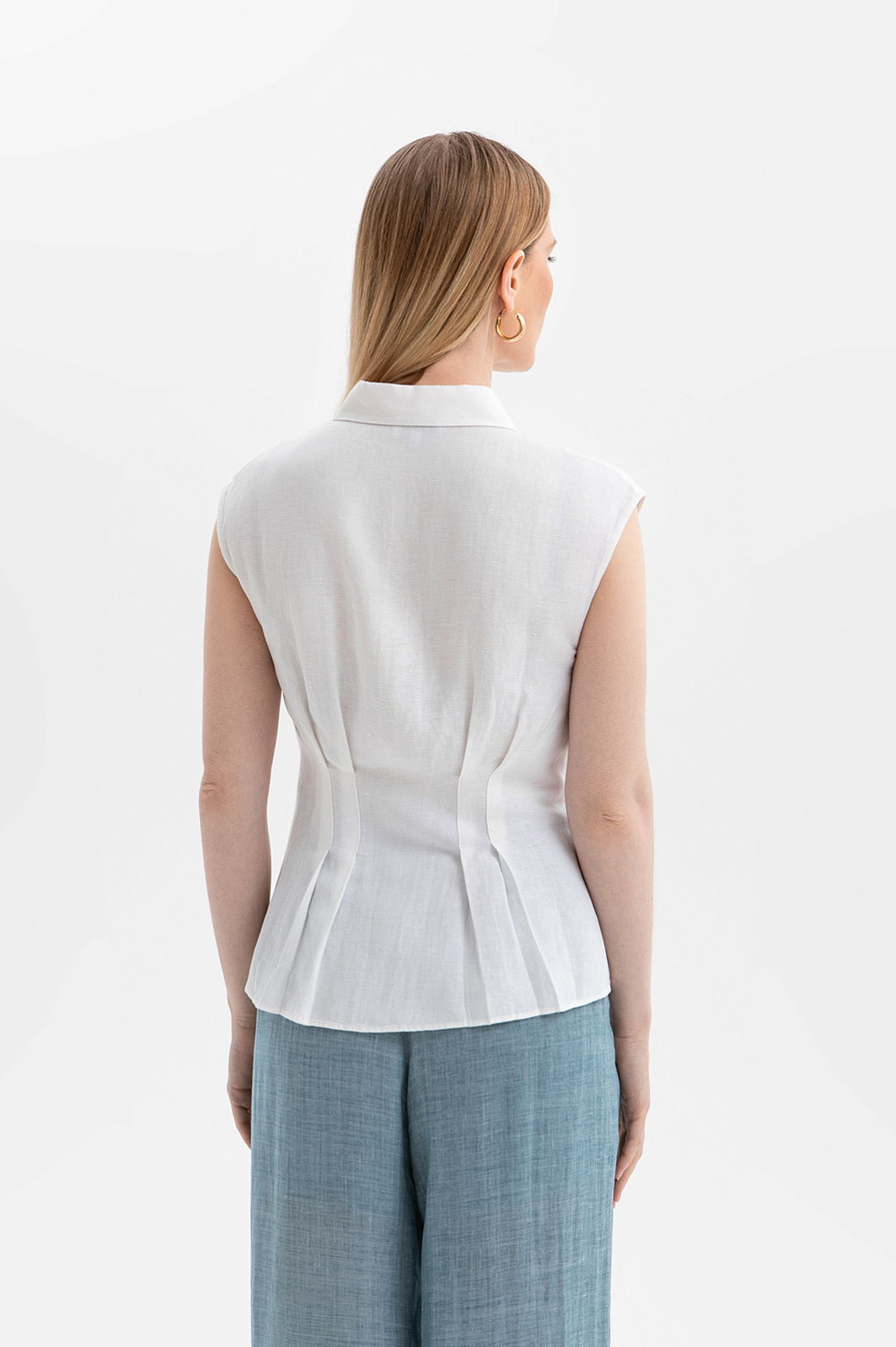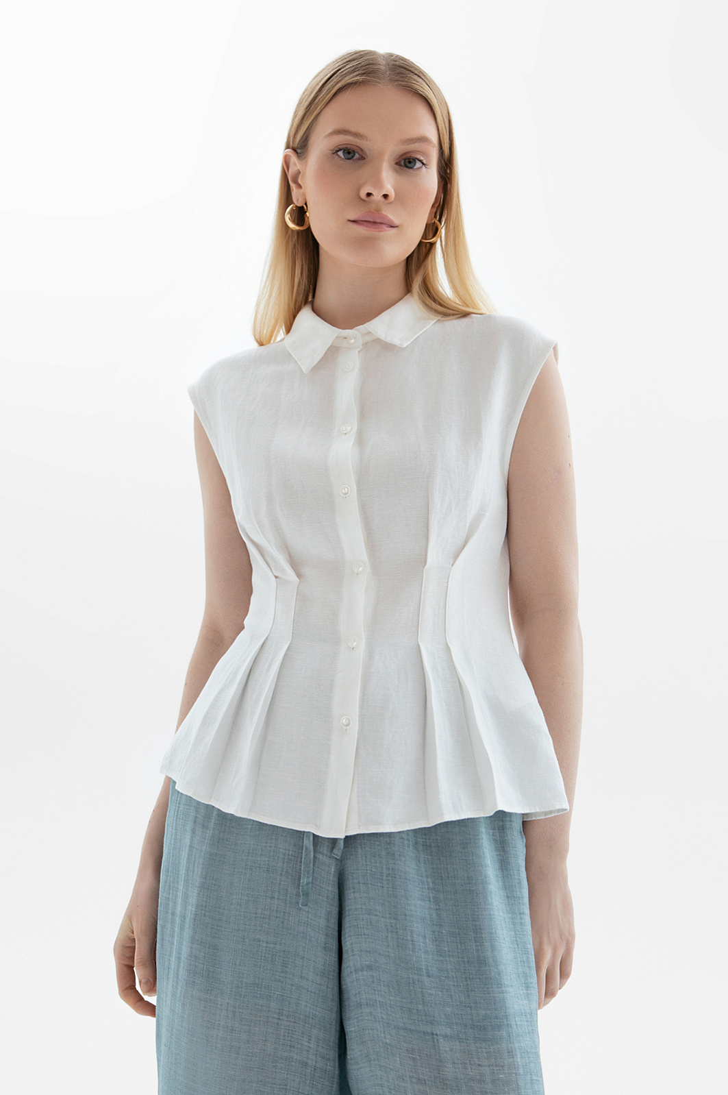 Лёгкая, скульптурная и сдержанно эффектная белая блузка KANZLER без рукавов изо льна и вискозы — нарядная вещь для тёплых дней. Особенно изысканно она смотрится в дуэте со свободными брюками и струящимися юбками. Приталенный крой в сочетании с широкой, слегка структурированной драпировкой призван подчеркнуть женственность и нежность образа. Блузка выполнена из дышащей ткани, которая сочетает прочность и благородную фактуру натурального льна с мягкостью и пластичностью вискозных волокон. Такой материал отлично сохраняет форму и обеспечивает ощущение лёгкости и свежести в течение всего дня.