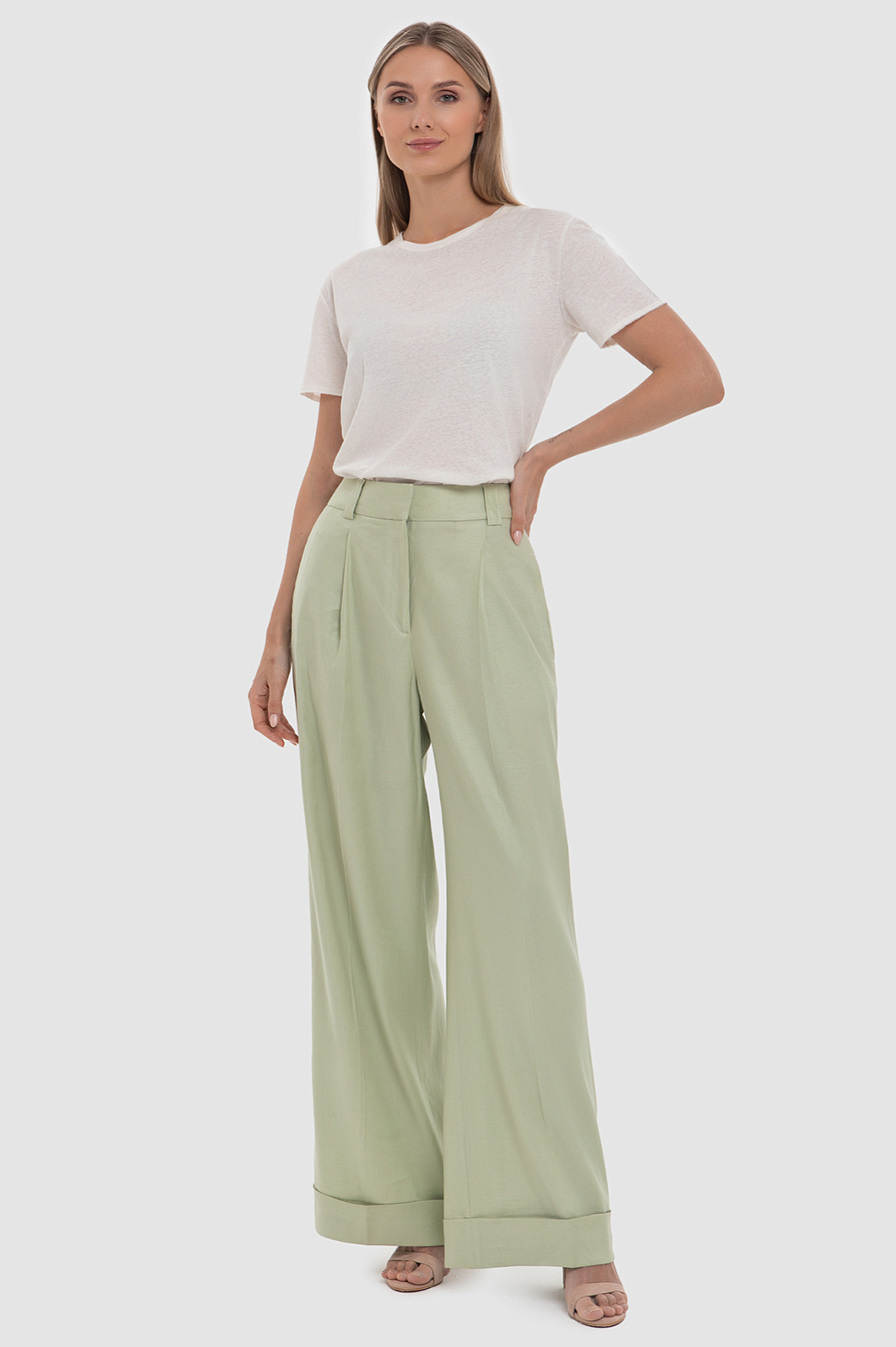 Роскошные брюки палаццо KANZLER изо льна с вискозой нежного светло-оливкового оттенка — современная версия широких брюк 1930-х годов, которые также называют «Марлен», в честь ослепительной актрисы Марлен Дитрих. Высокая посадка, классические складки от пояса, свободные широкие брючины с манжетами-отворотами создают расслабленный женственный силуэт с акцентом на линии талии. Натуральный лен сохраняет комфортную для тела температуру и окутывает тело приятной прохладой. Волокна вискозы делают ткань более прочной, износоустойчивой и долговечной. Небольшое добавление спандекса поддерживает форму, не давая материалу сминаться. Параметры модели: рост 180, 87-61-91 Размер на модели: S