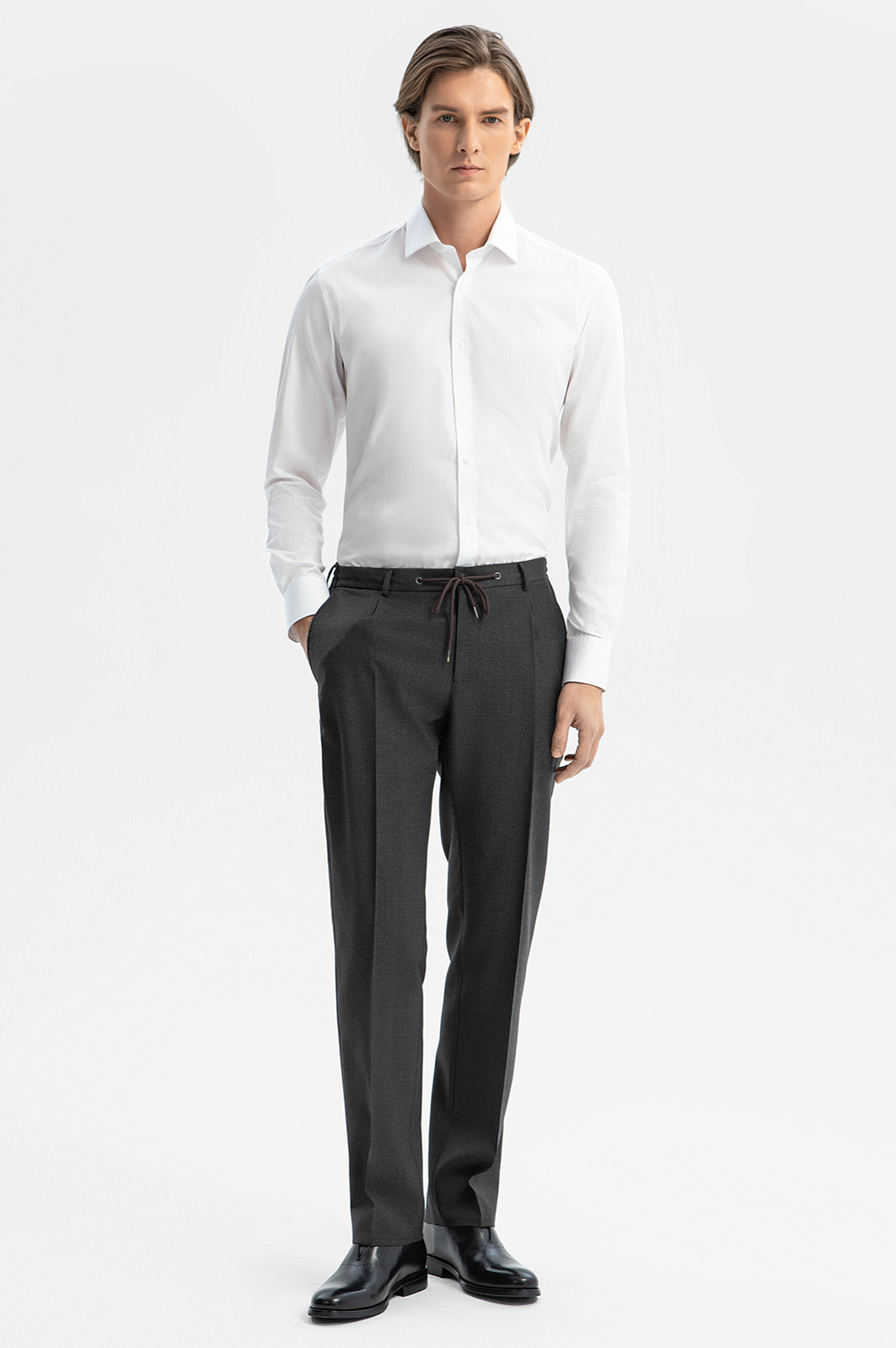 Серо-коричневые брюки KANZLER из немнущейся шерсти на кулиске — удобный вариант для офиса и менее официальный выходов, требующих элегантного вида. Приталенный силуэт и стрелки задают вертикальное направление, визуально вытягивая силуэт. Кулиска позволяет регулировать объем талии. Подкладка из гладкого прочного материала облегчает надевание. Брюки сшиты из премиальной тончайшей сертифицированной шерсти Супер 120 S (100%), которая сохраняет естественное тепло и отличается непревзойденной износоустойчивостью и способностью восстанавливать форму. Параметры модели: рост 191, 97-77-99 Размер на модели: 50