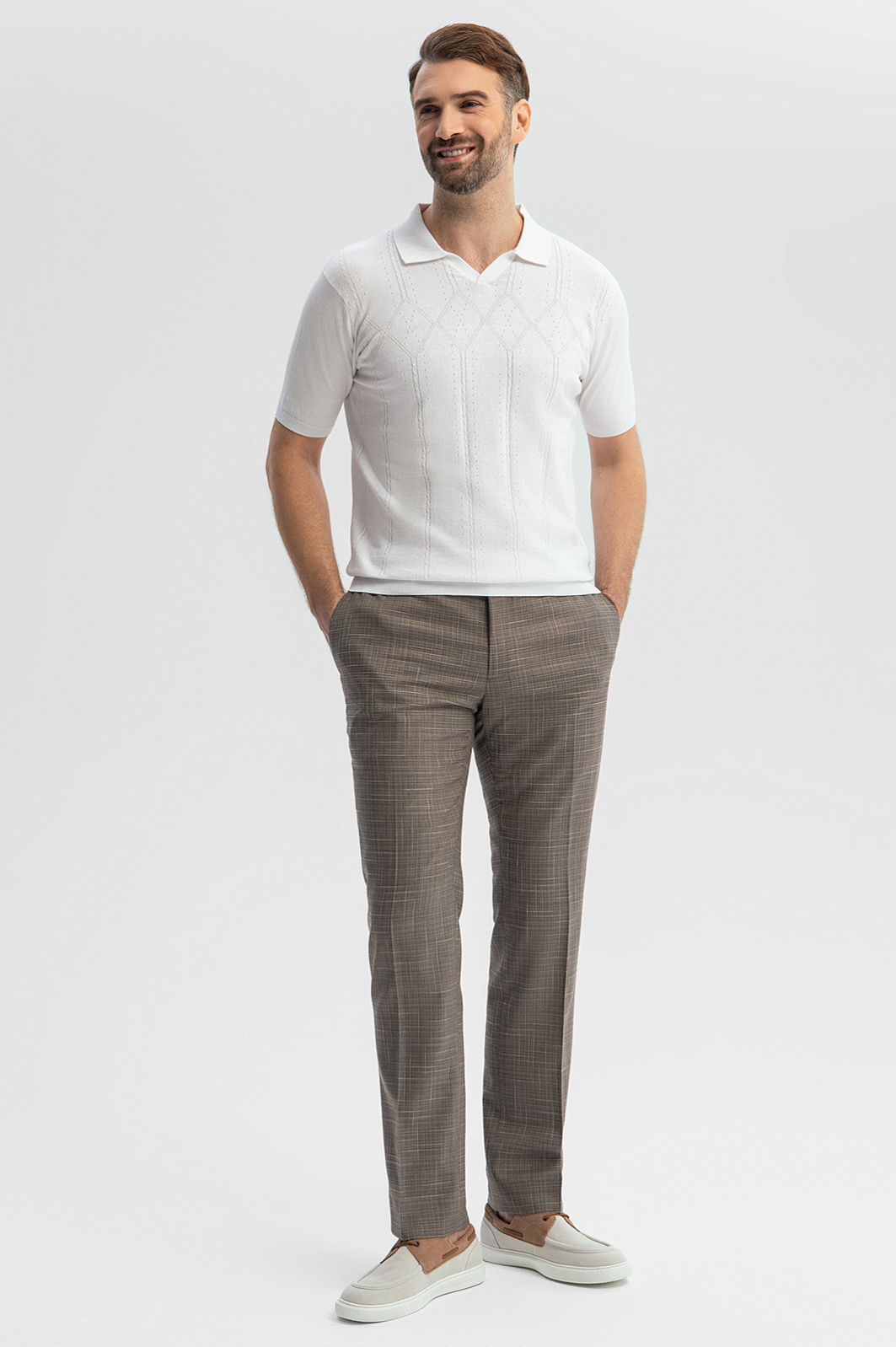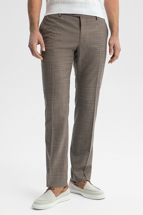 Светло-коричневые брюки KANZLER из шерсти, хлопка и льна с водоотталкивающей обработкой сделают повседневный офисный образ индивидуальным и элегантным. Они гармонично сочетаются с классическим пиджаком и трикотажем — джемпером, поло. Тонкая клетка на ткани придает классической модели легкость. Приталенный крой и стрелки устремляют силуэт вверх. Благородная костюмная ткань с водоотталкивающей обработкой защищена от капризов погоды и загрязнений. Тонкие волокна шерсти Супер 120S (90%) сохраняют естественное тепло. Воздухопроницаемые хлопок и лен обеспечивают терморегуляцию, комфорт и свежесть тела. Параметры модели: рост 189, 102-80-99 Размер на модели: 50