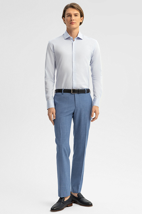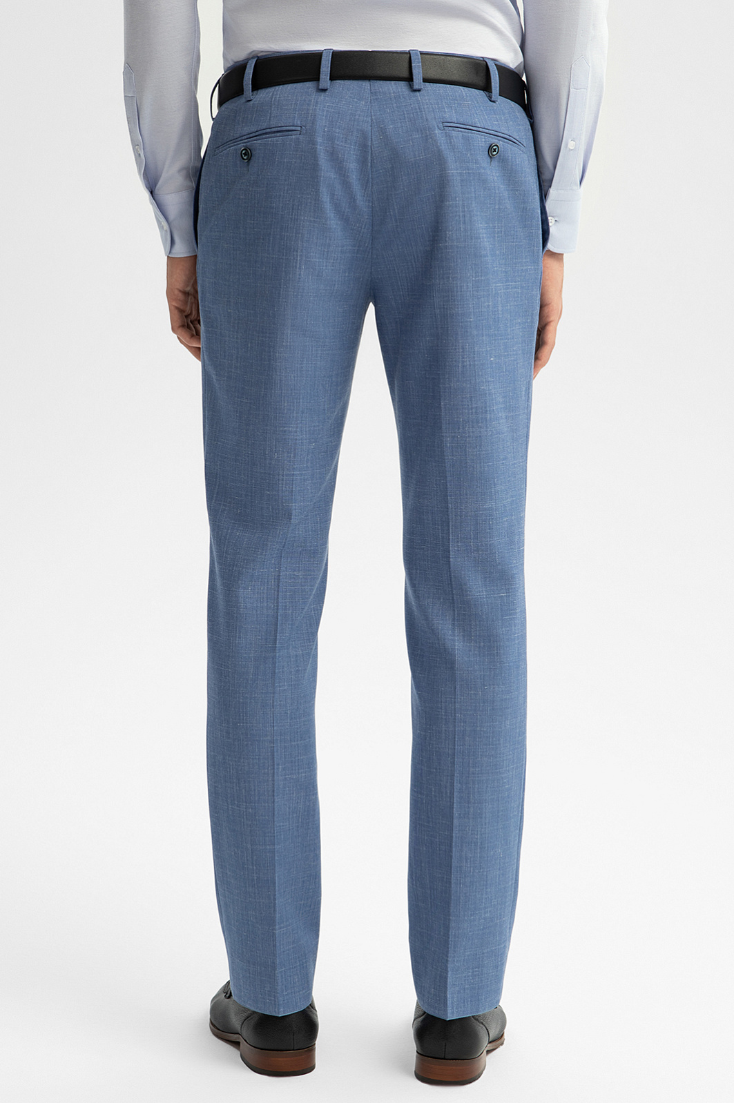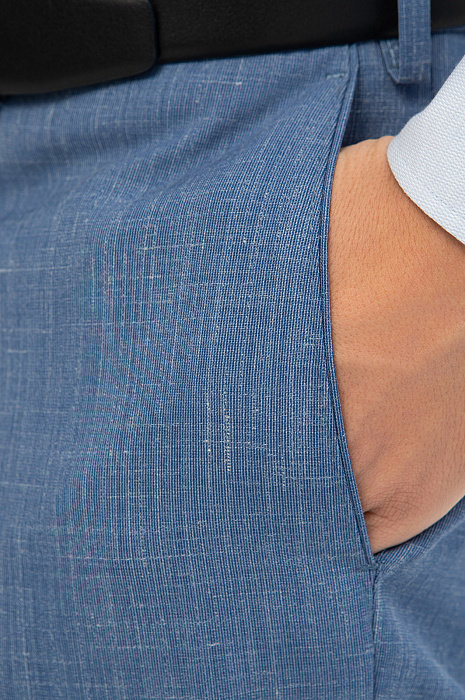 Классические брюки KANZLER василькового оттенка из шерсти, льна и шелка — элегантный вариант для офиса и неофициальных поводов. Строгий, слегка зауженный силуэт в сочетании со стрелками задает вертикальное направление и вытягивает фигуру. Ткань с красивым полотняным переплетением сделана из тонкой овечьей шерсти Супер 120S (82%), льна и шелка. Шерсть хорошо держит форму, благодаря чему брюки легко перенесут поездку в машине и рабочий день в офисе. Лен обеспечивает циркуляцию воздуха. Шелк придает материалу благородный лоск. Параметры модели: рост 191, 97-77-99 Размер на модели: 50