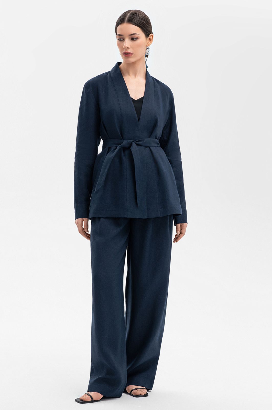 Темно-синие широкие брюки KANZLER, выполненные изо льна, делают ноги визуально длиннее и добавляют облику женственности и шарма. Модель отличают чистые линии, умеренно широкий крой, универсальная средняя посадка, подчеркнутая линия талии и мягкие защипы спереди. Сзади, на поясе, брюки украшены фирменной вышивкой в тон — летящими журавлями. Для создания костюма их можно дополнить свободным льняным темно-синим жакетом KANZLER. Роскошная натуральная ткань из 100-процентного льна практически не нагревается в жаркие дни — гипоаллергенные волокна создают ощущение прохлады и отводят влагу, поддерживая свежесть тела.