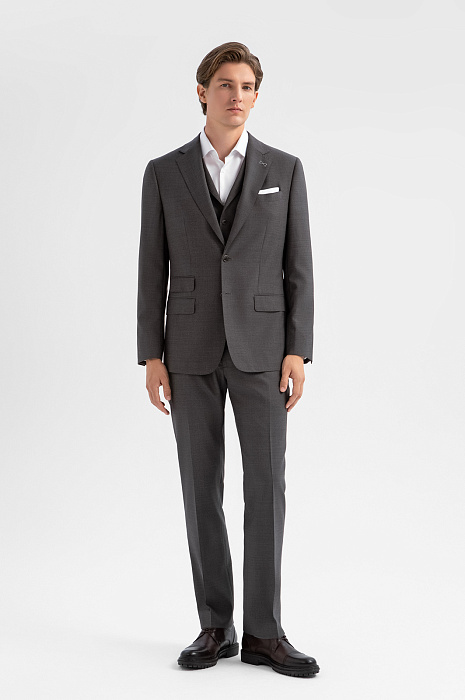 Классические брюки KANZLER из шерсти и шелка с водоотталкивающей обработкой спокойного серого оттенка созданы для тех, кто ценит чёткость линий и безупречную геометрию силуэта. Строгий слегка зауженный крой со стрелками и мягкими защипами на поясе делает брюки универсальной основой для делового образа. Декоративный клапан на пуговице — продуманная деталь, выполняющая роль сдержанного акцента в ретро-стиле. Тончайшая костюмная шерсть Супер 120S, дополненная шёлком, дарит ткани благородный блеск и мягкость. Водоотталкивающая обработка защищает брюки от капризов погоды. Прочная гладкая подкладка из полиэстера облегчает надевание. Параметры модели: рост 191, 97-77-99 Размер на модели: 50