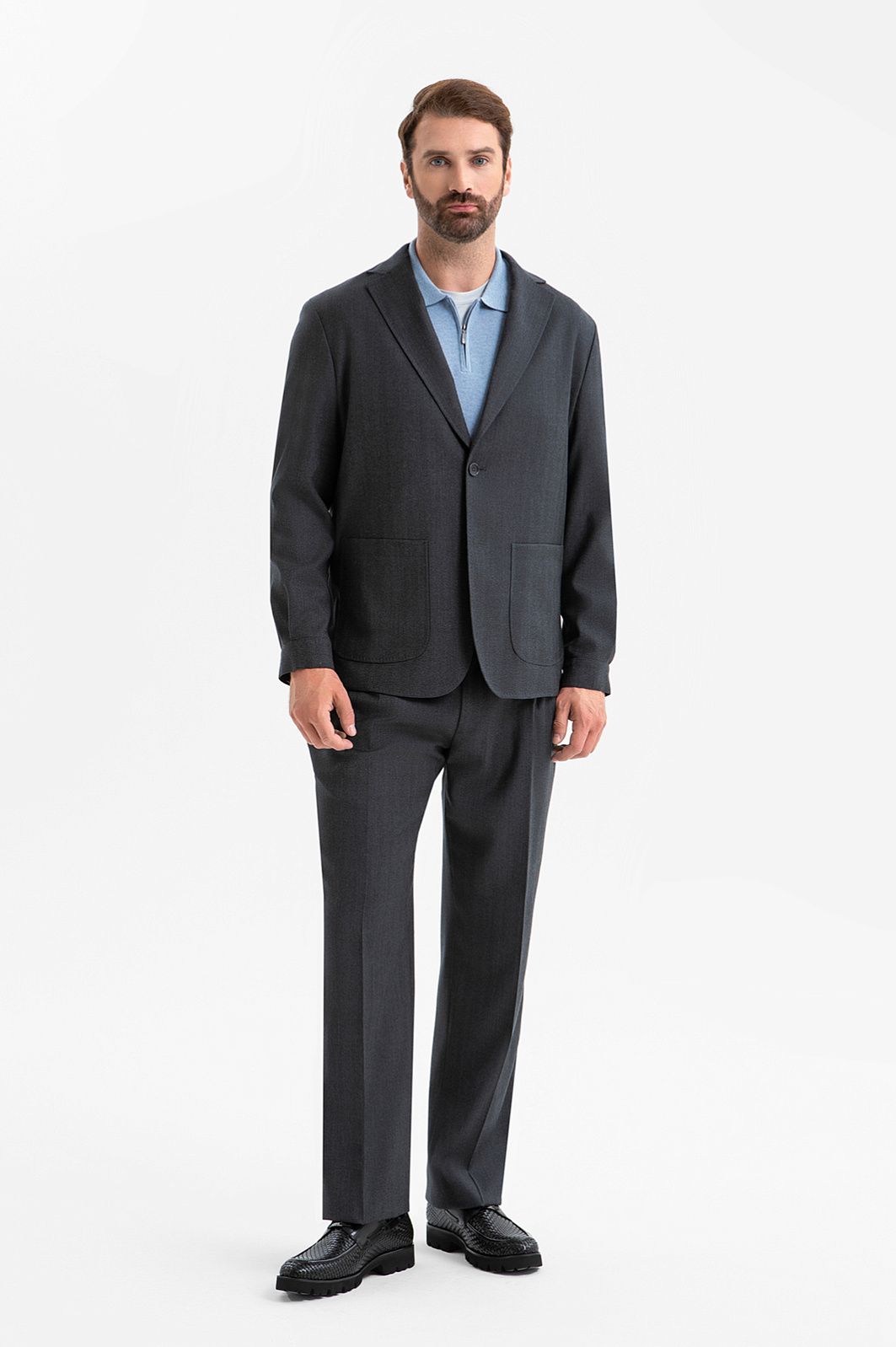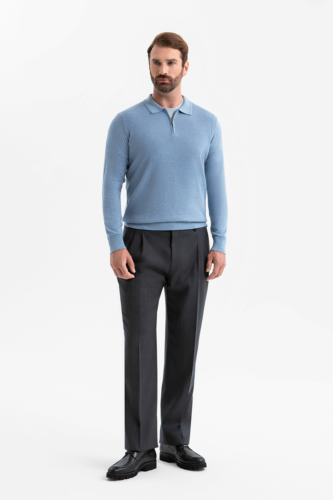Брюки KANZLER спокойного синего цвета из тончайшей шерсти Супер 120S — выбор ценителей классики и премиальных материалов. Инновационная ткань устойчива к сминанию и загрязнениям, благодаря чему вещь остаётся безупречной в течение долгого дня. Чёткие стрелки и лёгкие защипы создают элегантный силуэт. Строгий универсальный крой органично сочетается как с классическим пиджаком, так и с трикотажным верхом — джемпером поло, водолазкой. Дорогая костюмная шерсть восхищает своей лёгкостью и совершенством. Упругие волокна шерсти поддерживают оптимальную температуру тела и сохраняют форму брюк. Добавление эластана (2%) помогает материалу адаптироваться под индивидуальные особенности фигуры. Прочная гладкая подкладка из полиэстера облегчает надевание. Параметры модели: рост 189, 102-80-99 Размер на модели: 50