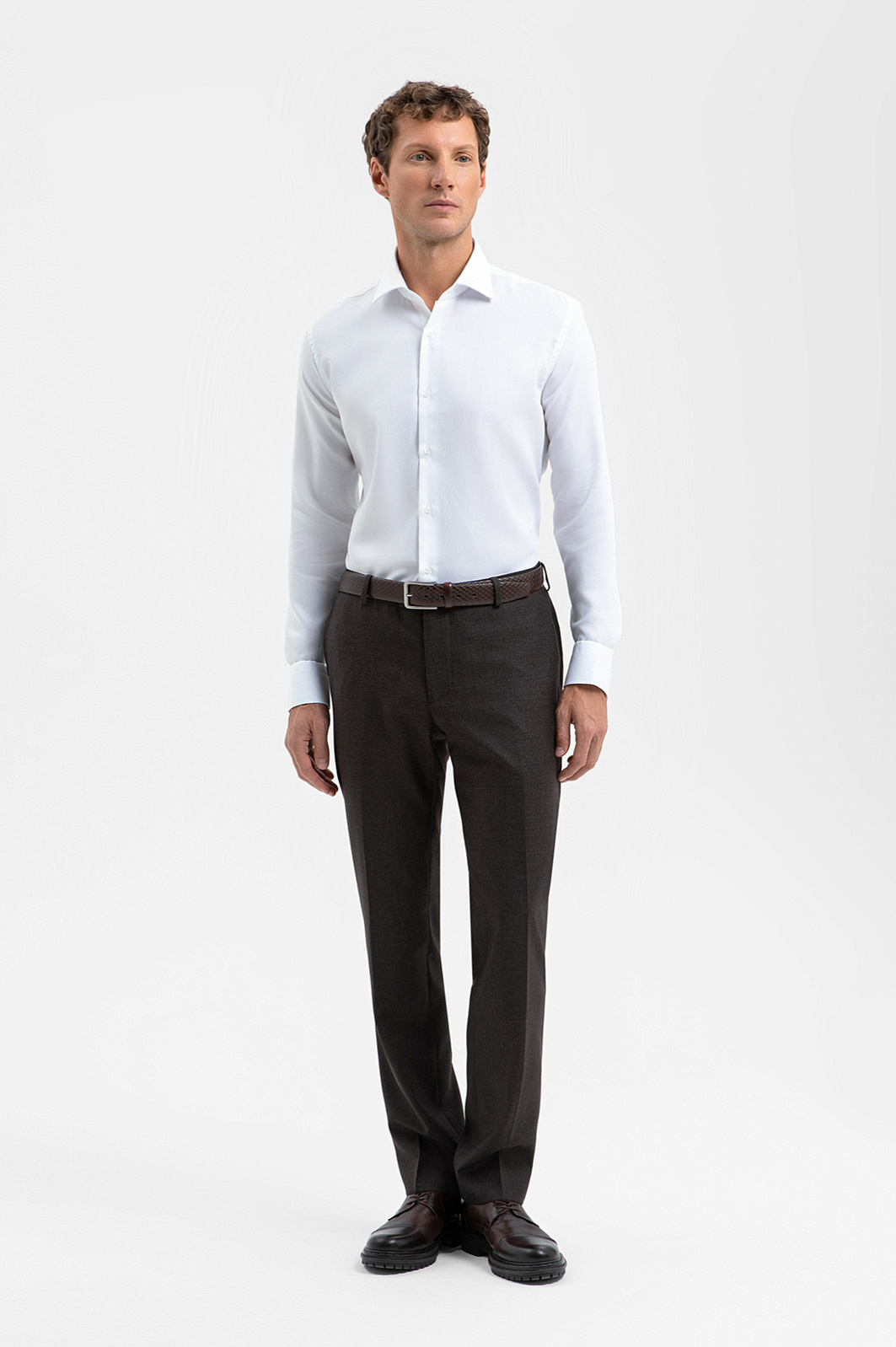 Брюки KANZLER оттенка горького шоколада из тонкой костюмной шерсти созданы для тех, кто ценит элегантность и современный комфорт. За первое отвечает изящный крой с аккуратными стрелками, которые задают вертикальные линии и облегчают силуэт. За второе — лёгкий немнущийся материал. Ткань из шерсти Супер 100S мягко ложится по ноге, сохраняя форму даже после долгого дня. Подкладка из гладкой прочной ткани обеспечивает движениям комфорт и непринуждённость. В официальной обстановке брюки можно носить с классическим однобортным пиджаком KANZLER из костюмной шерсти такого же оттенка. Параметры модели: рост 188, 97-82-92 Размер на модели: 50