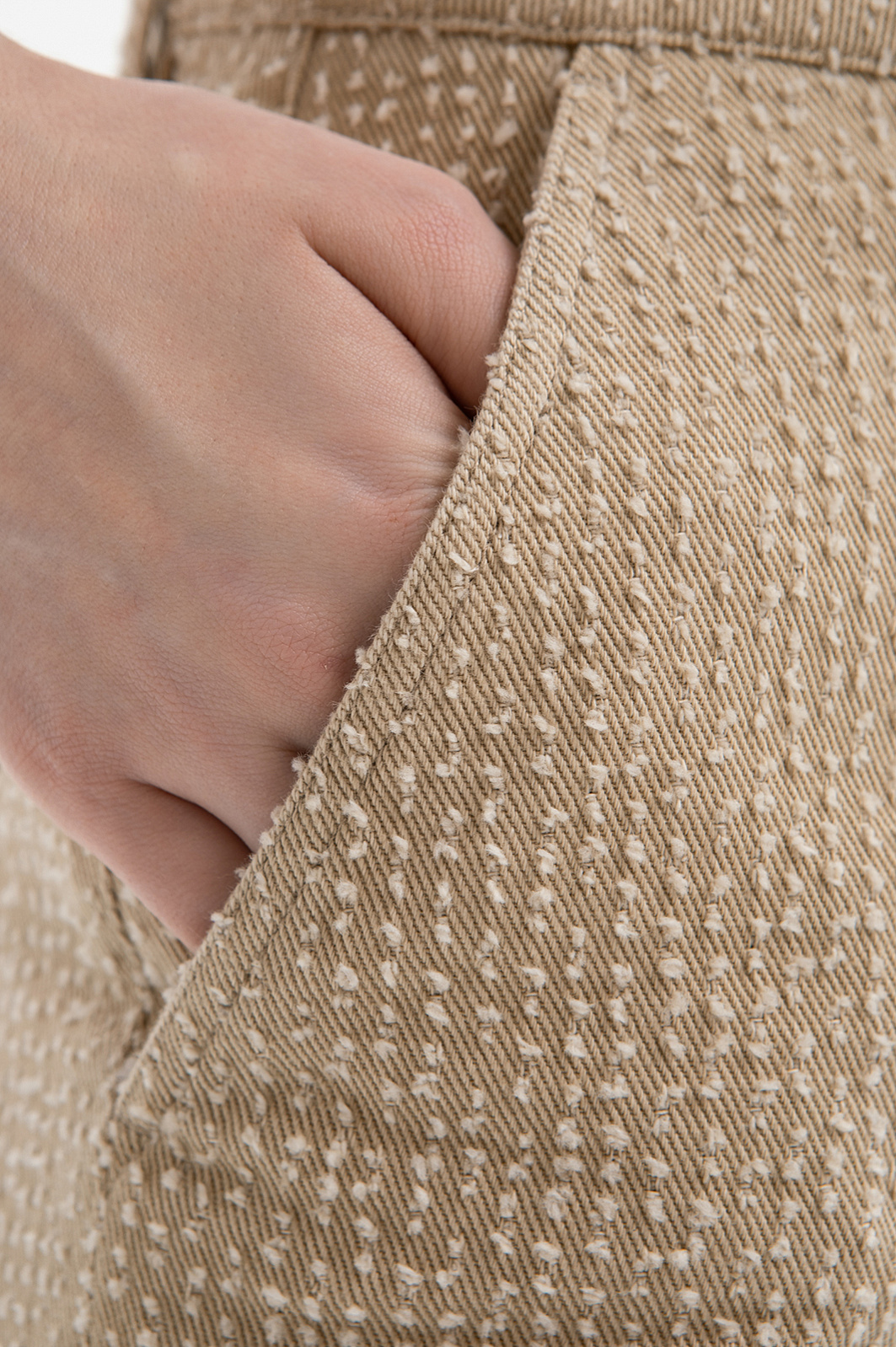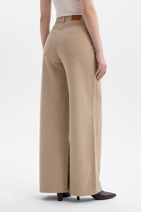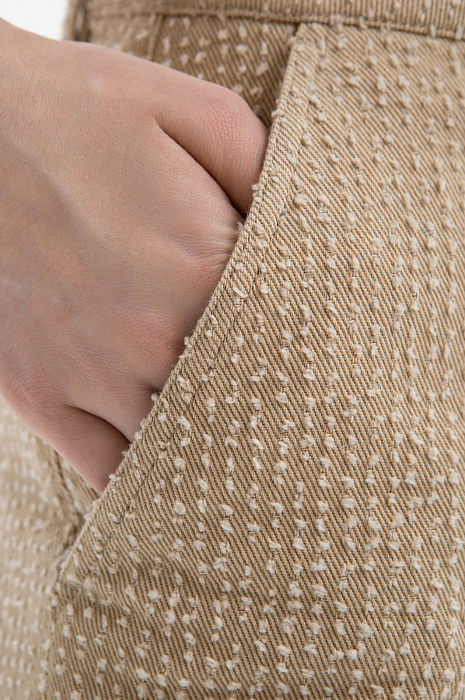 Брюки KANZLER из чистого хлопка — воплощение городского шика и комфорта. Тёплый карамельный оттенок легко сочетается с естественными оттенками, добавляя образу нарядность и изысканность. Расклешённый от бедра крой создаёт женственный силуэт, который подчёркивает линию талии и визуально удлиняет ноги. Особое внимание привлекает ткань. Белый ворс создаёт выразительный текстурный узор, придающим модели очарование. В составе материала — чистый гипоаллергенный хлопок, который обеспечивает ощущение свежести даже в жаркие дни. Саржевое плетение формирует плотную диагональную структуру, благодаря которой ткань хорошо держит форму и сохраняет аккуратный внешний вид.