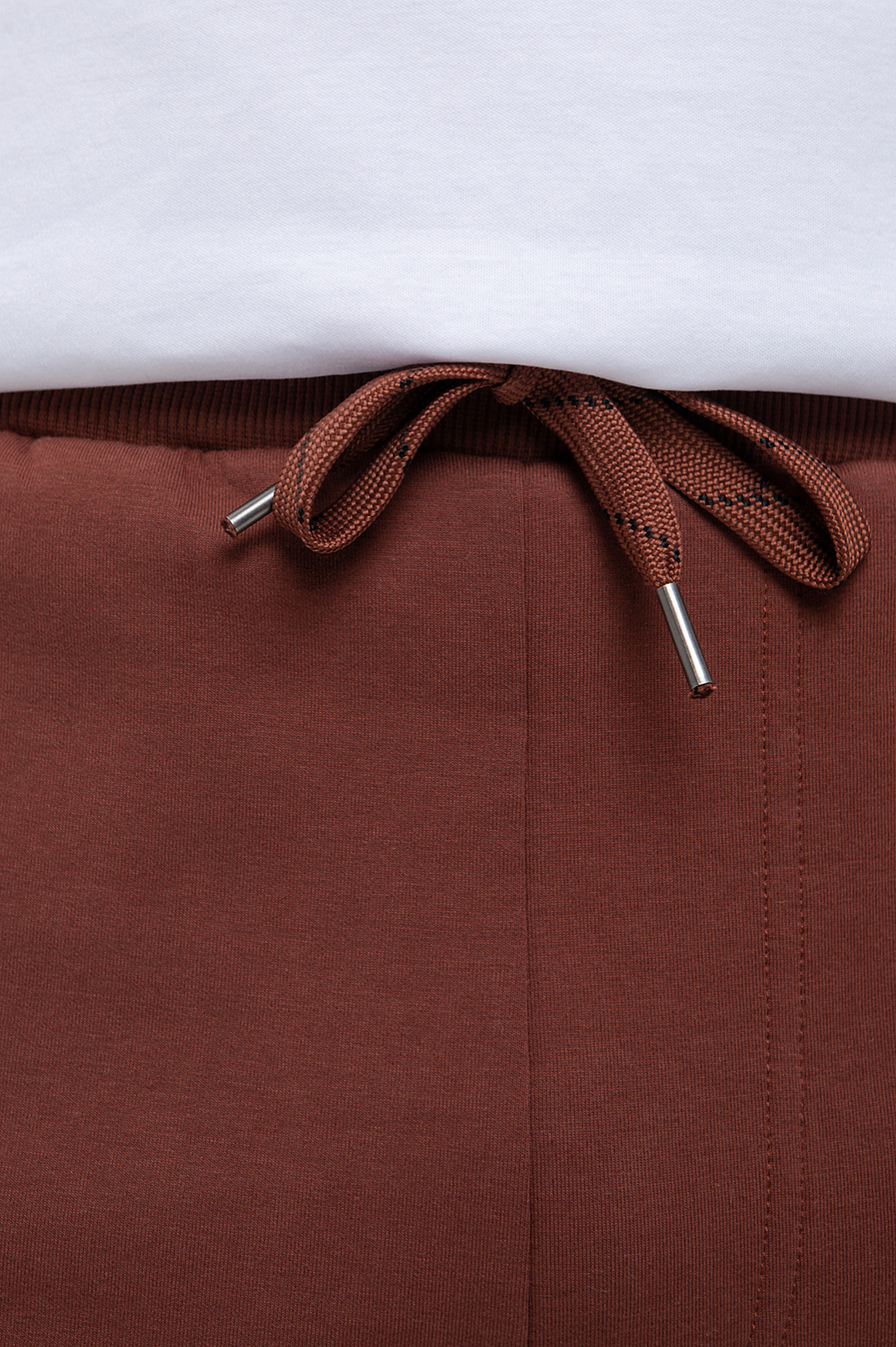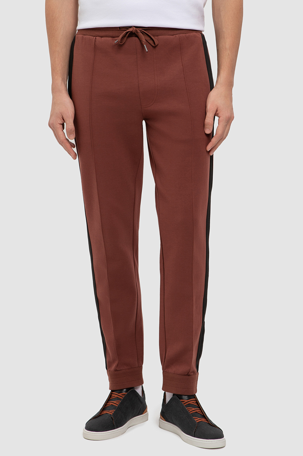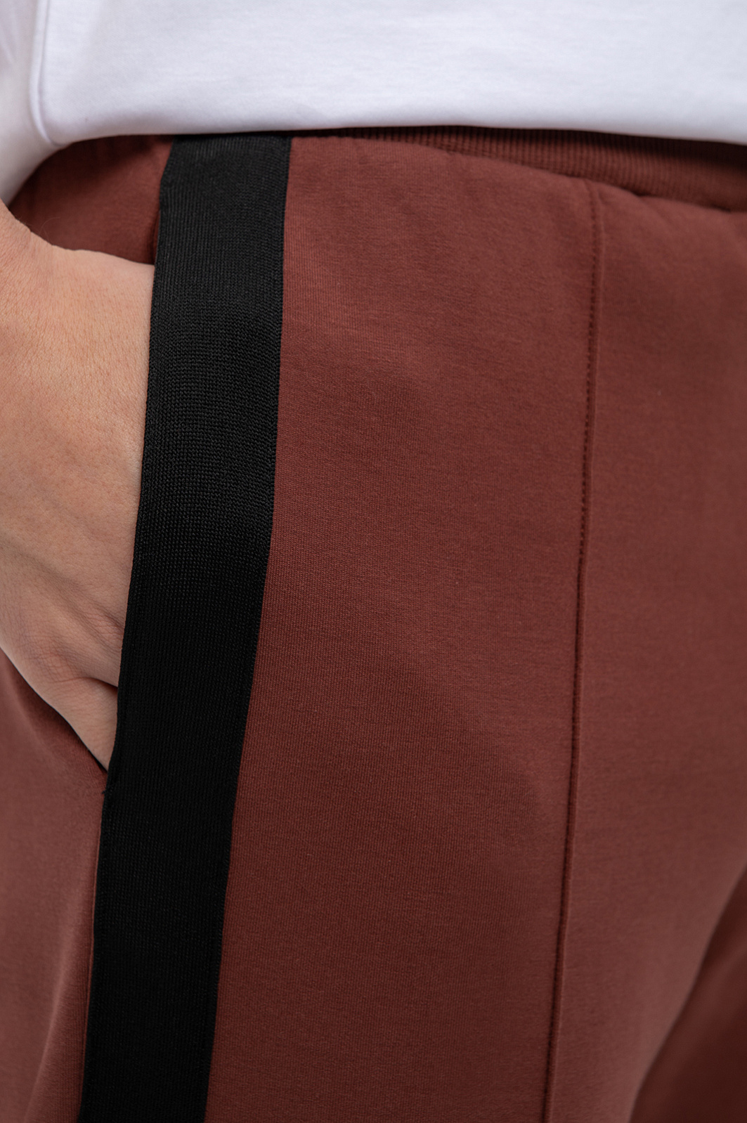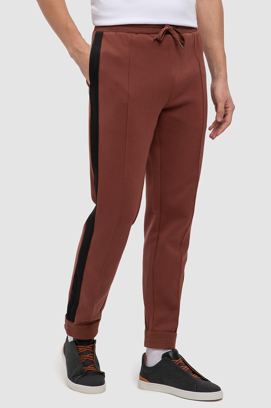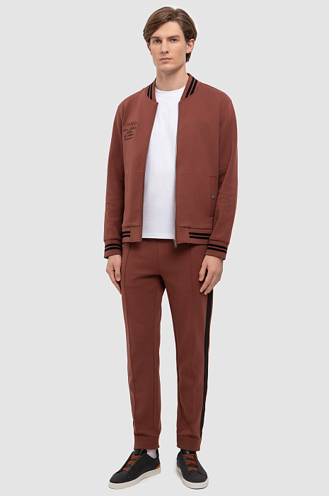 Коллекция спортивной одежды в новой интерпретации от дизайнеров KANZLER. Представляем трикотажные брюки в терракотовом оттенке. Практичный, но благородный оттенок в тренде в текущем сезоне. Дизайнеры уделили особое внимание комфорту и продуманным деталям: расслабленная посадка на кулиске, контрастные лампасы и простроченные стрелки, которые создают дополнительные вертикальные линии, широкие манжеты, застегивающиеся на молнию и брендированные кнопки. Модель с двумя боковыми карманами дополнили функциональным карманом сзади. Для пошива использовали мягкий, дышащий хлопковый трикотаж с добавлением прочных волокон полиэстера и эластана для лучшей износостойкости и посадки по фигуре. Толстовка на молнии и белая футболка гармонично дополнит образ с зауженными брюками. Параметры модели: рост 191, 97-77-99 Размер на модели: M