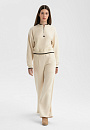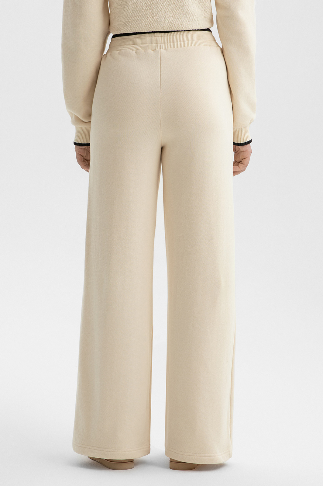 Удобные стильные брюки KANZLER кремового цвета из чистого хлопка с расслабленном силуэтом обеспечивает комфорт и свободу движений. Это нарядный и эффектный вариант для уикенда, прогулки, похода в спортивный клуб или спа. Пояс с широкой трикотажной резинкой дополнен кулиской с шнурком, которая позволяет регулировать посадку. Плавный клёш от бедра и мягкие защипы спереди формируют женственный силуэт, визуально удлиняя ноги и придавая образу непринуждённость. Материал брюк — мягкий приятный к телу натуральный трикотаж из дышащего гипоаллергенного хлопка (100%), который поддерживает комфорт тела весь день.