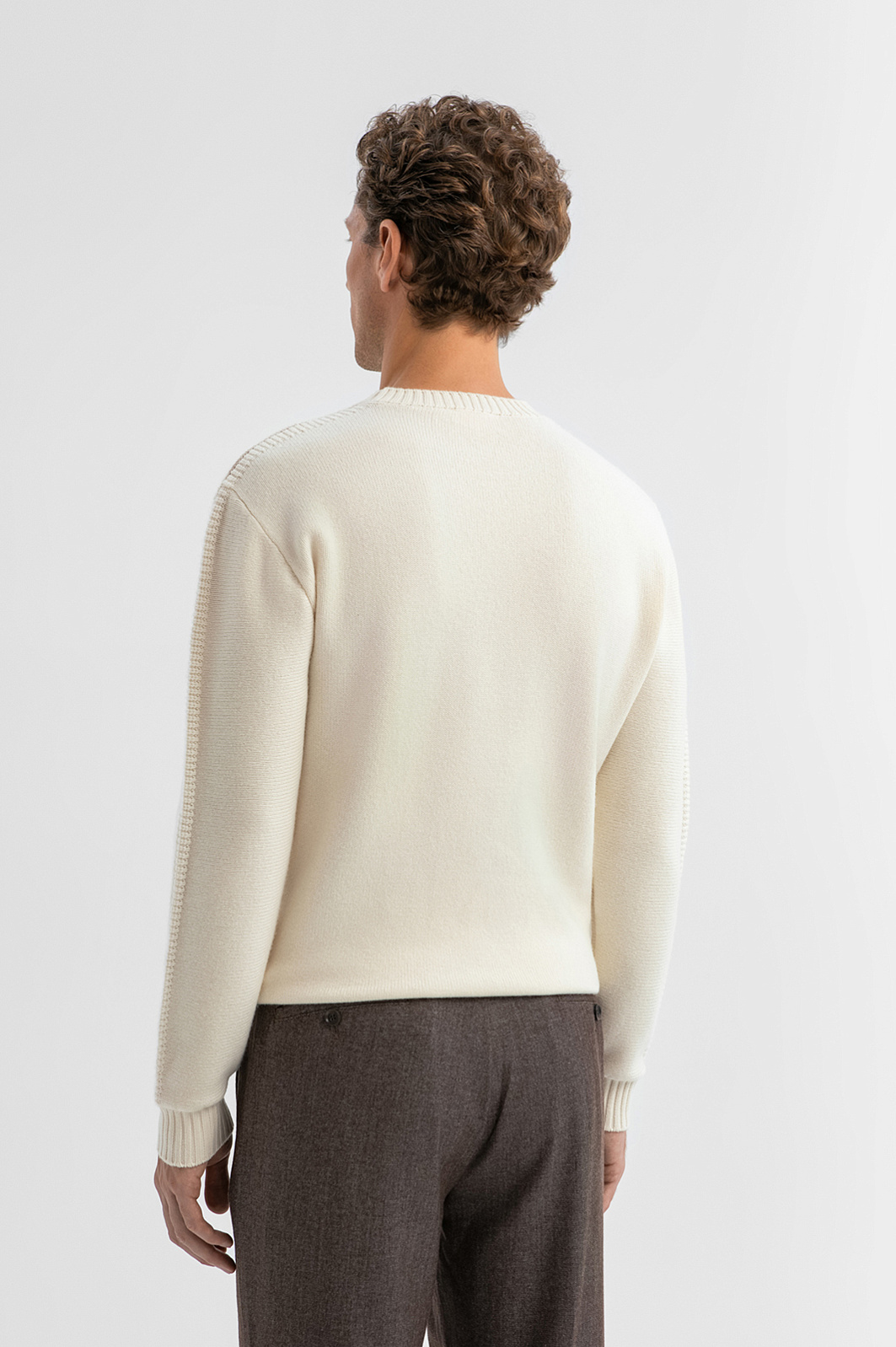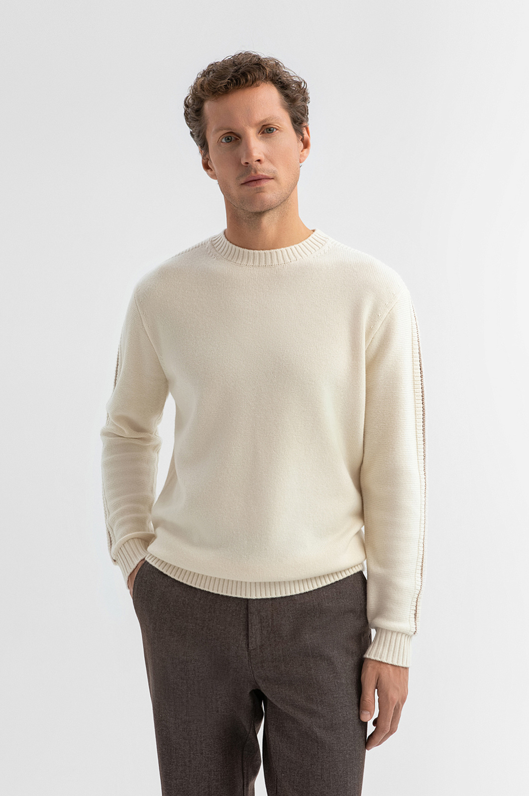 Светло-бежевый джемпер KANZLER из шерсти с кашемиром — воплощение сдержанной элегантности и комфорта. Модель легко сочетается с брюками, джинсами или классическим пальто и служит универсальным вариантом для повседневных и умеренно нарядных аутфитов. Гладкая вязка подчёркивает чистоту линий и минималистичный стиль. Фактурная полоска, дополненная тонкой коричневой линией, на рукавах — деликатный акцент, который придаёт модели индивидуальность. Плотный вязаный трикотаж выполнен из роскошной шерстяной пряжи с добавлением кашемира, которая приятно ощущается на теле, сохраняет тепло и позволяет коже дышать. Параметры модели: рост 188, 97-82-92 Размер на модели: M