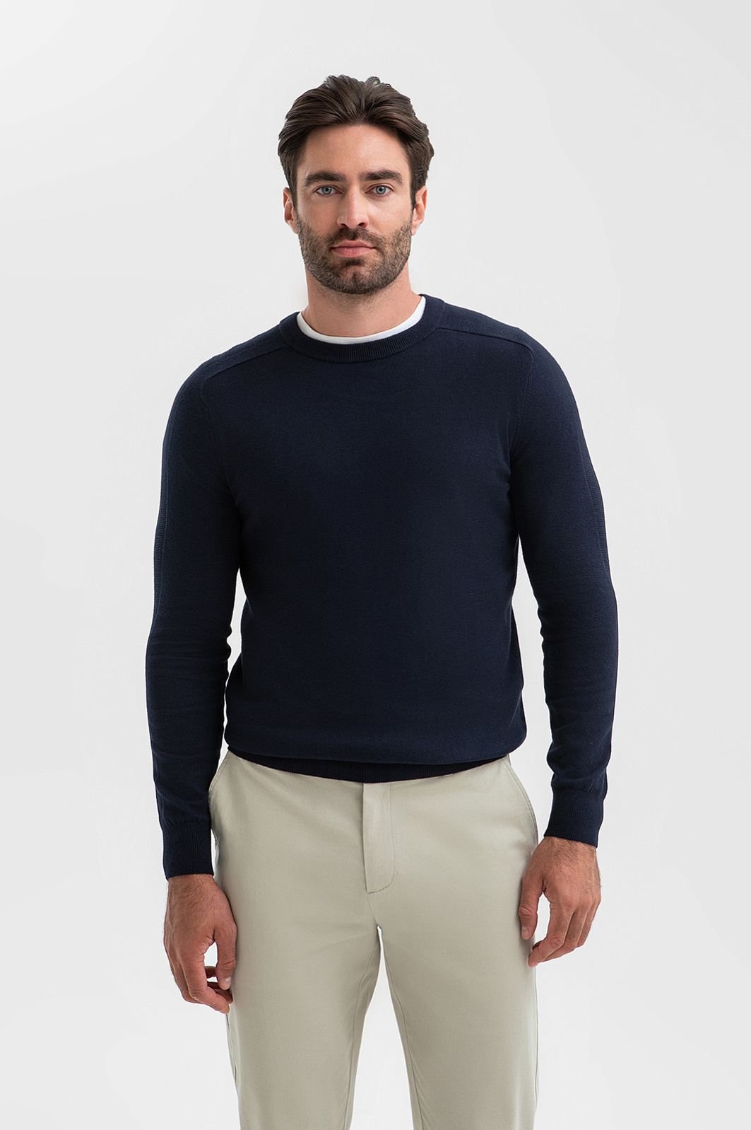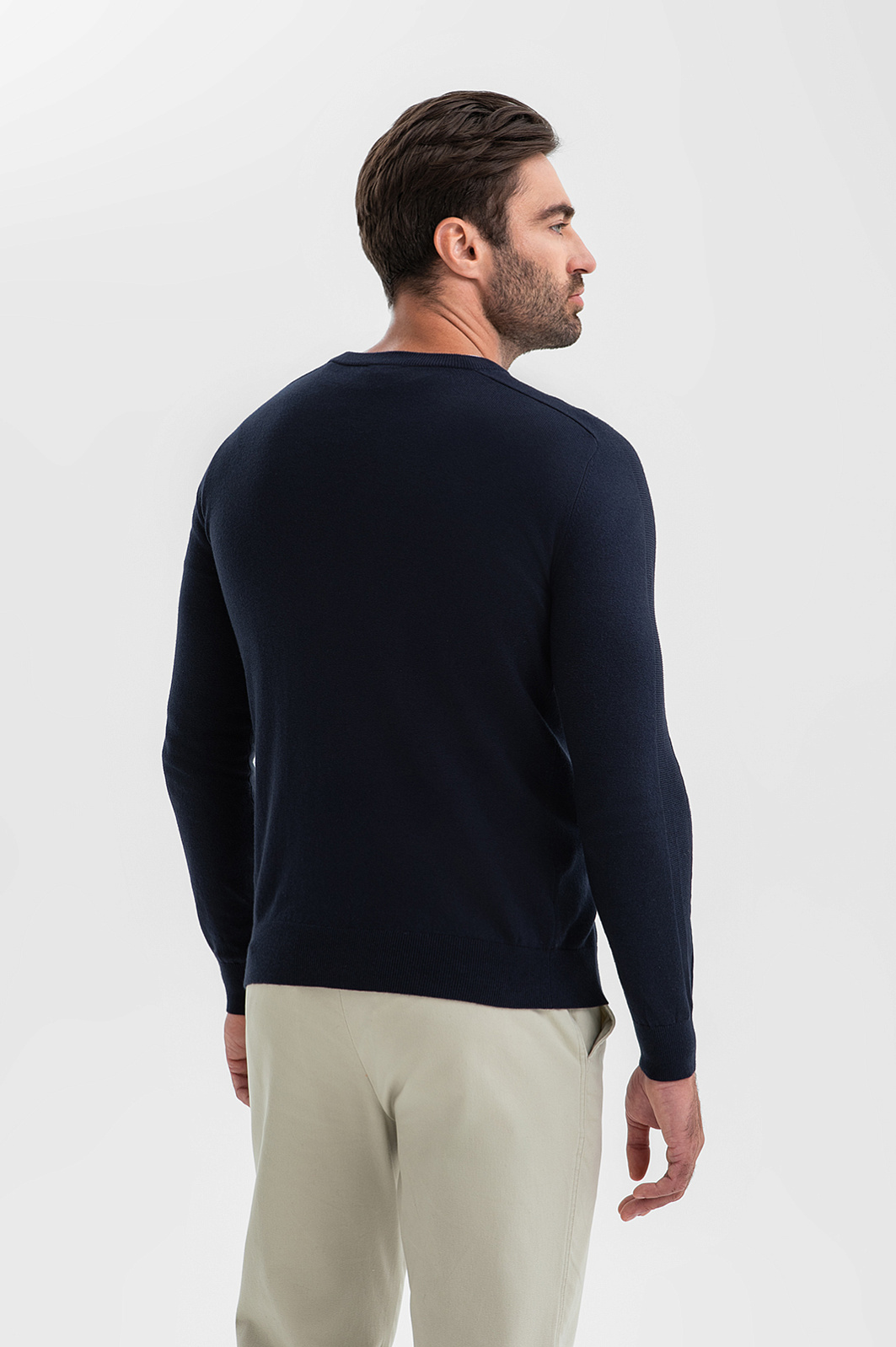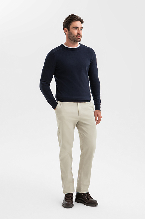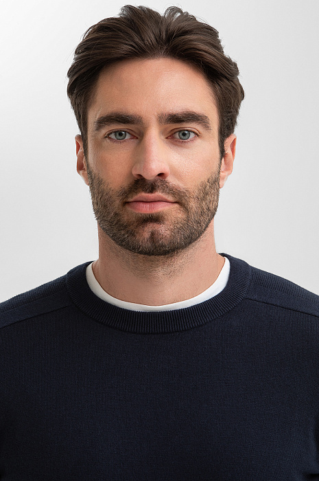 Темно-синий джемпер KANZLER – инвестиция в качественную базу мужского гардероба. Классический крой с круглым воротом – универсальный выбор для сочетаний как со строгим костюмом, так и с расслабленными джинсами или брюками. Материал – микс натуральных волокон: мягкий гипоаллергенный хлопок (95%) обеспечивает идеальный воздухообмен, а добавка кашемира (5%) дарит тактильный комфорт и тепло, не перегревая тело. Эластичная резинка на манжетах и по низу изделия служит сохранению формы и аккуратной посадке. Параметры модели: рост 192, 108-83-102 Размер на модели: M