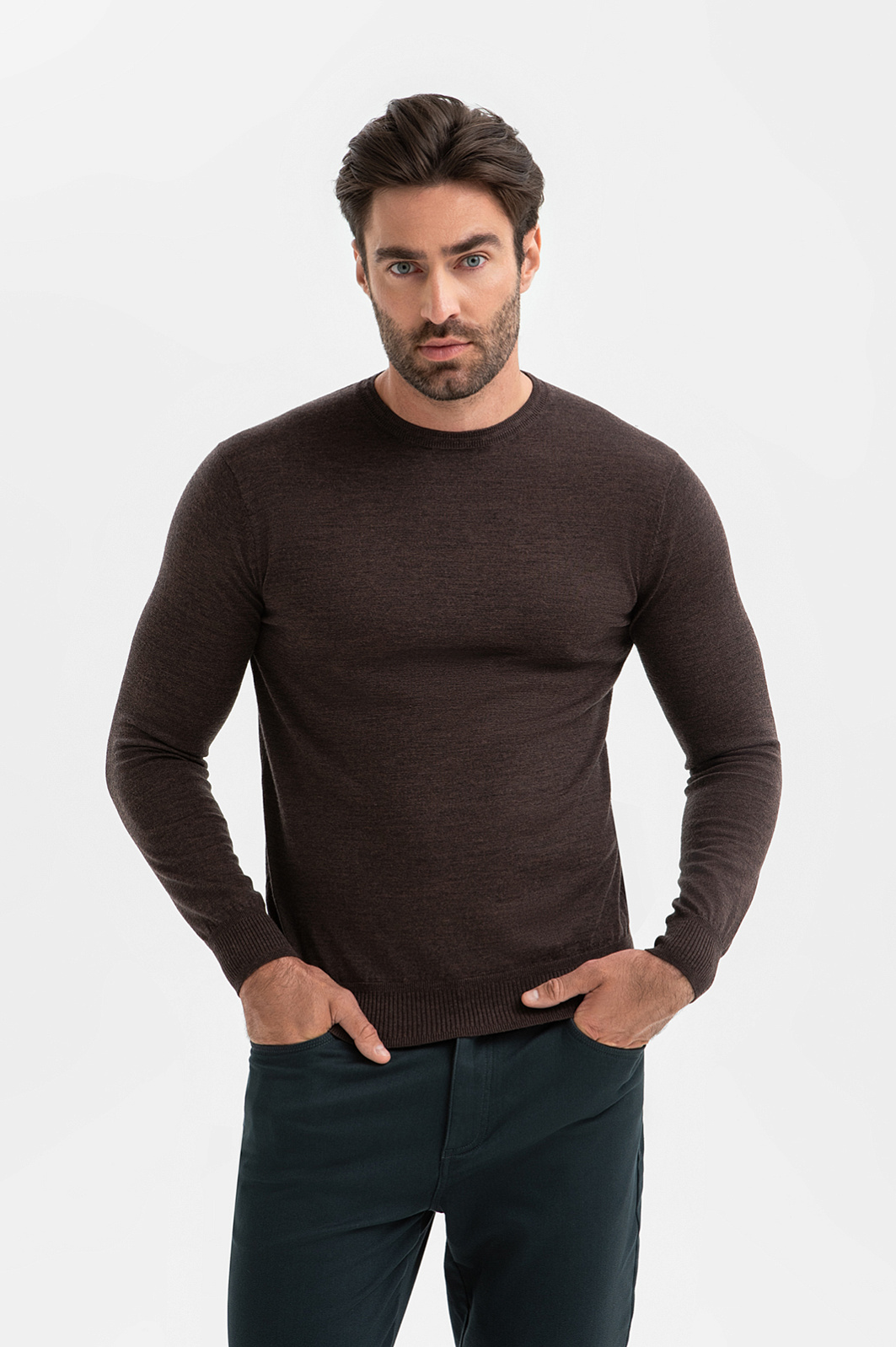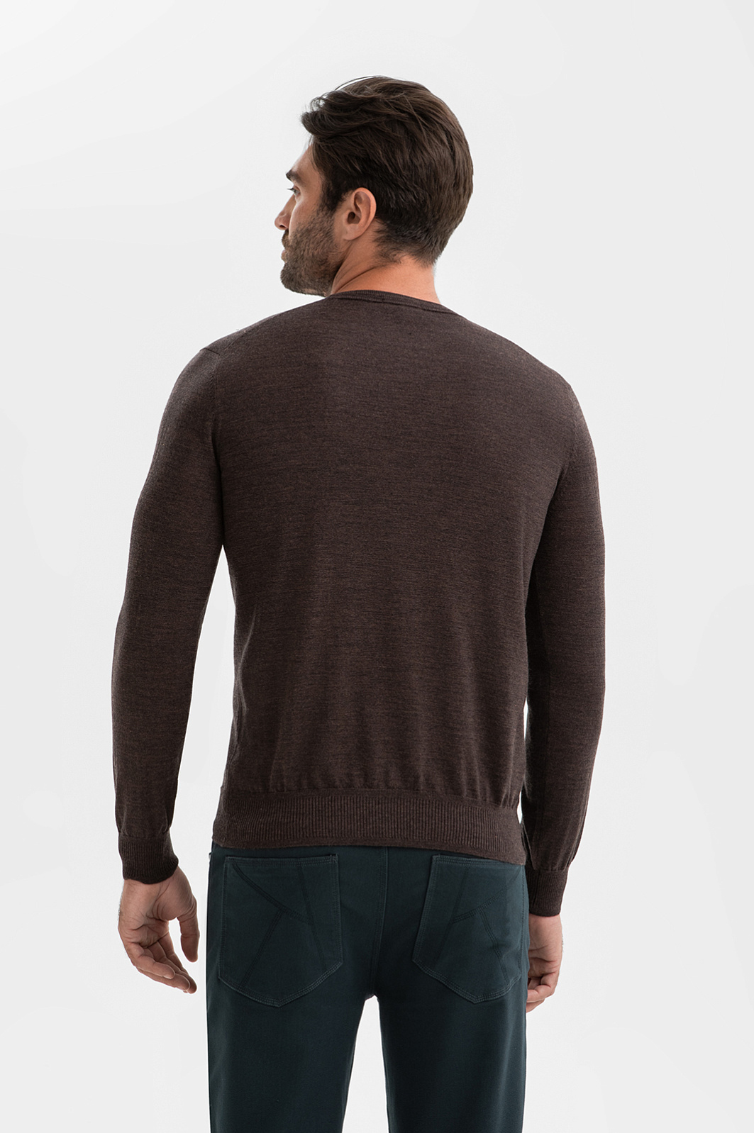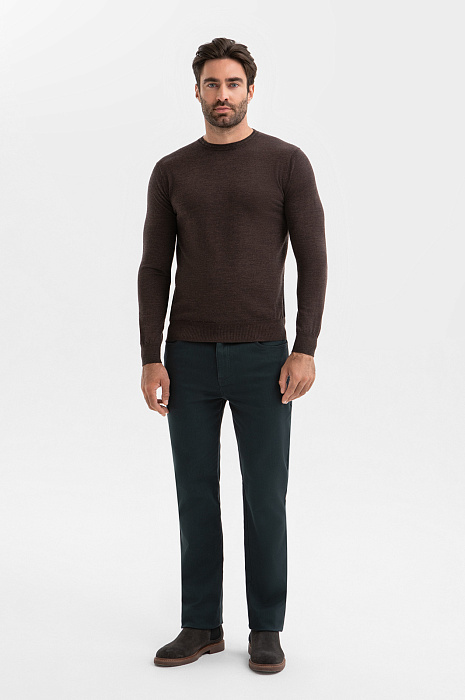 Коричневый джемпер KANZLER сочетает в себе элегантность и практичность. Глубокий теплый цвет подчеркивает статусность и отлично сочетается с различными стилями – от строгого делового до повседневного. Классический крой с круглым воротником сохраняет чистоту линий, а эластичная резинка на манжетах и по низу изделия обеспечивает аккуратную посадку. 100-процентная шерсть плотной вязки держит форму, создавая аккуратный силуэт без стеснения движений. Легкий натуральный материал обеспечивает терморегуляцию, воздухопроницаемость и тактильный комфорт в течение всего дня. Параметры модели: рост 192, 108-83-102 Размер на модели: M