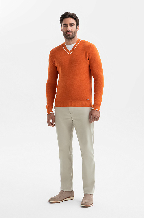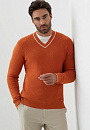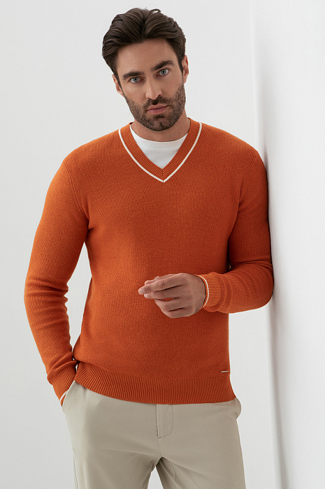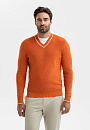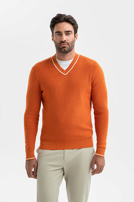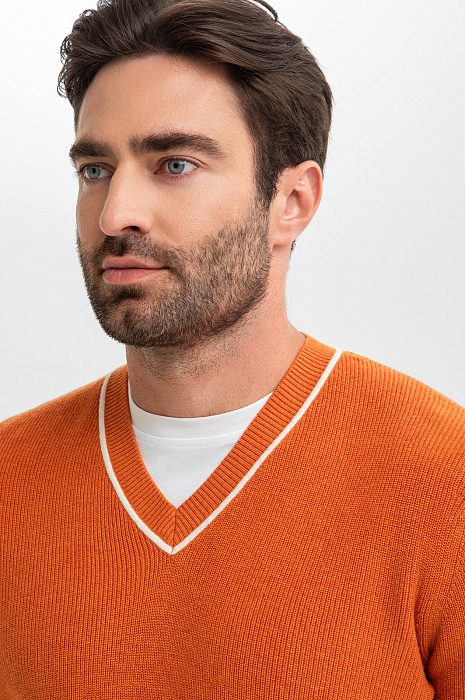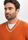 Джемпер KANZLER из хлопка и кашемира с треугольным вырезом – симбиоз делового стиля и кежуал. Мягкий и невесомый материал из натурального хлопка с добавлением кашемира обеспечивает оптимальный воздухообмен и терморегуляцию, устойчив к износу и сохраняет форму и цвет после многократных стирок. Оранжево-коричневый оттенок оживит образ и будет гармонично сочетаться с теплой гаммой. Крой подчеркивает мужественный силуэт, не ограничивая свободу движения. Модель подходит для создания многослойных образов с рубашкой или футболкой. Параметры модели: рост 192, 108-83-102 Размер на модели: M