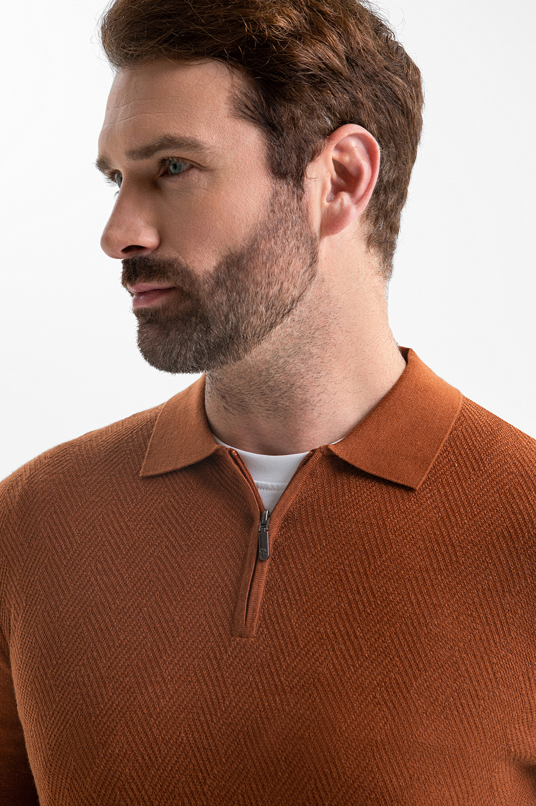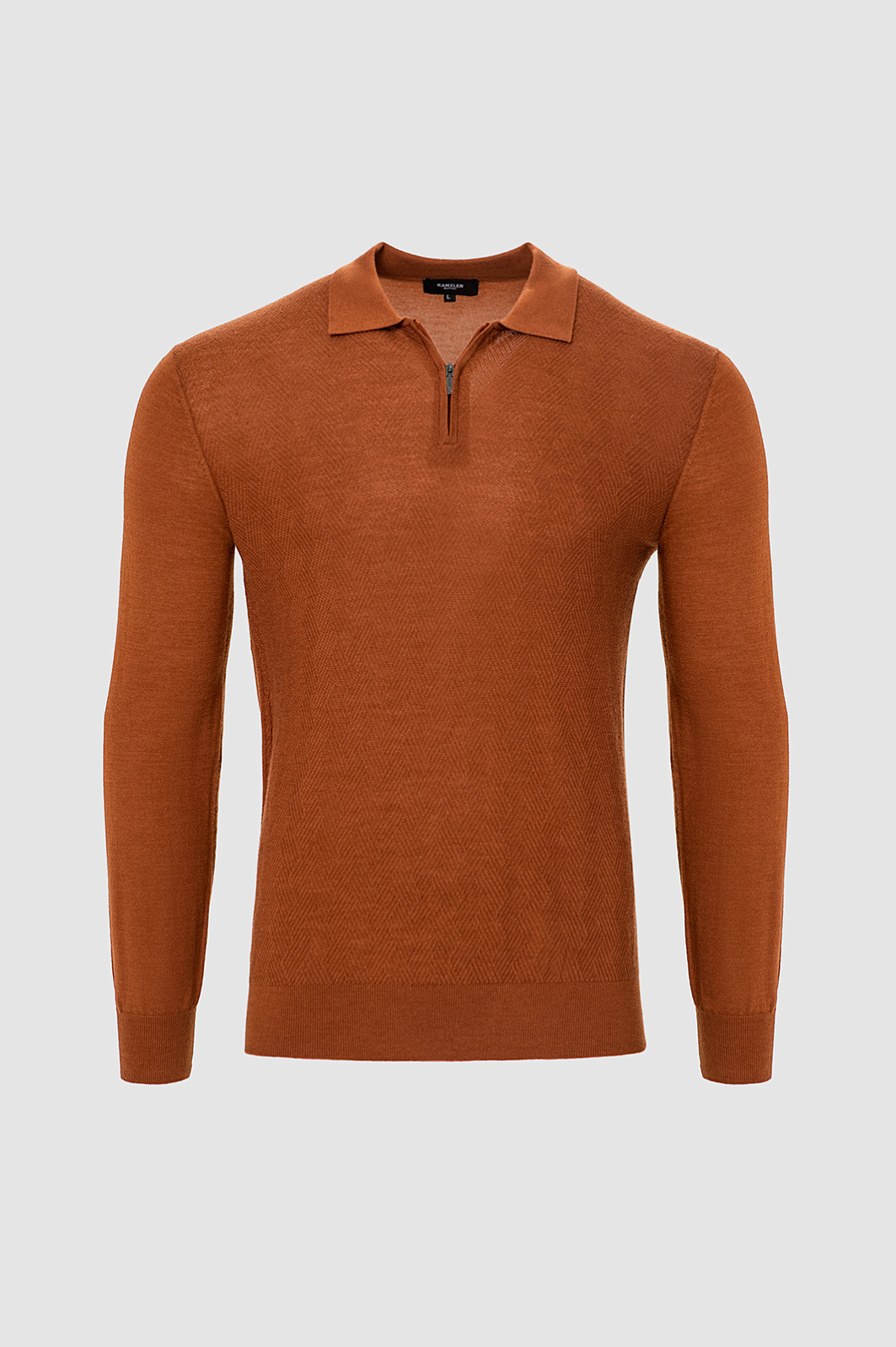 Джемпер поло KANZLER с молнией — гармония фактуры и цвета. Приятный охристый оттенок наполняет образ теплом и благородством, позволяя создавать как строгие, так и более расслабленные аутфиты для отдыха и путешествий. Передняя часть выполнена из фактурного трикотажа, который придаёт джемперу выразительность, создавая лёгкий объём. Спинка и рукава из гладкого трикотажа формируют аккуратный силуэт и подчёркивают чистоту линий, делая модель универсальной и современной. Мягкий воротник-поло добавляет элегантности. Состав из натуральных волокон обеспечивает идеальный баланс практичности и изысканности. Шерсть дарит тепло, прочность и комфорт, а шёлк добавляет ткани мягкость и лёгкий благородный блеск. Параметры модели: рост 189, 102-80-99 Размер на модели: M