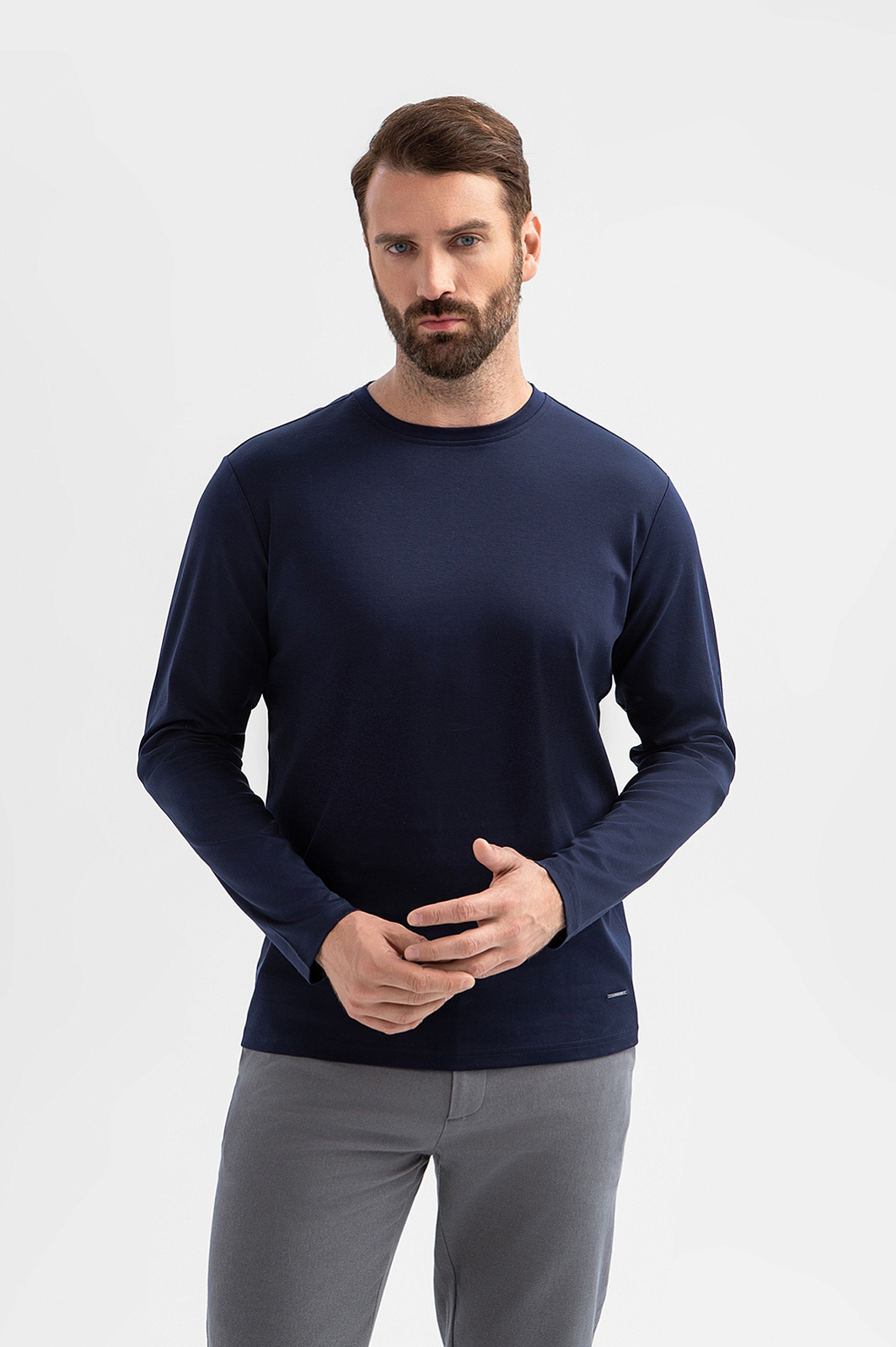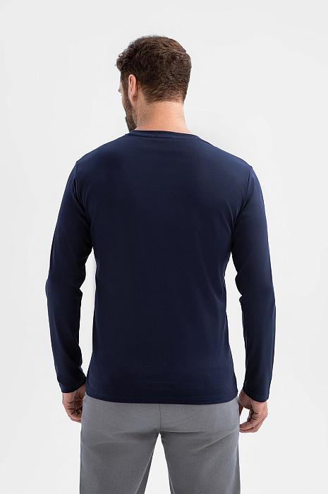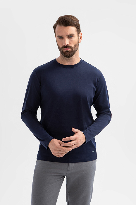 Темно-синий лонгслив KANZLER – универсальная база гардероба в превосходном исполнении. Модель выполнили из 100-процентного хлопка премиального качества. Материал обеспечивает идеальный воздухообмен и отводит влагу. Мерсеризованный хлопок плотного плетения с приятной фактурой сохраняет форму и цвет после многократных стирок. Темно-синий оттенок – выбор для множества образов, от кежуал до спортивных. Носите лонгслив как самостоятельный элемент или создавайте многослойные образы с кардиганом или рубашкой. Параметры модели: рост 189, 102-80-99 Размер на модели: M