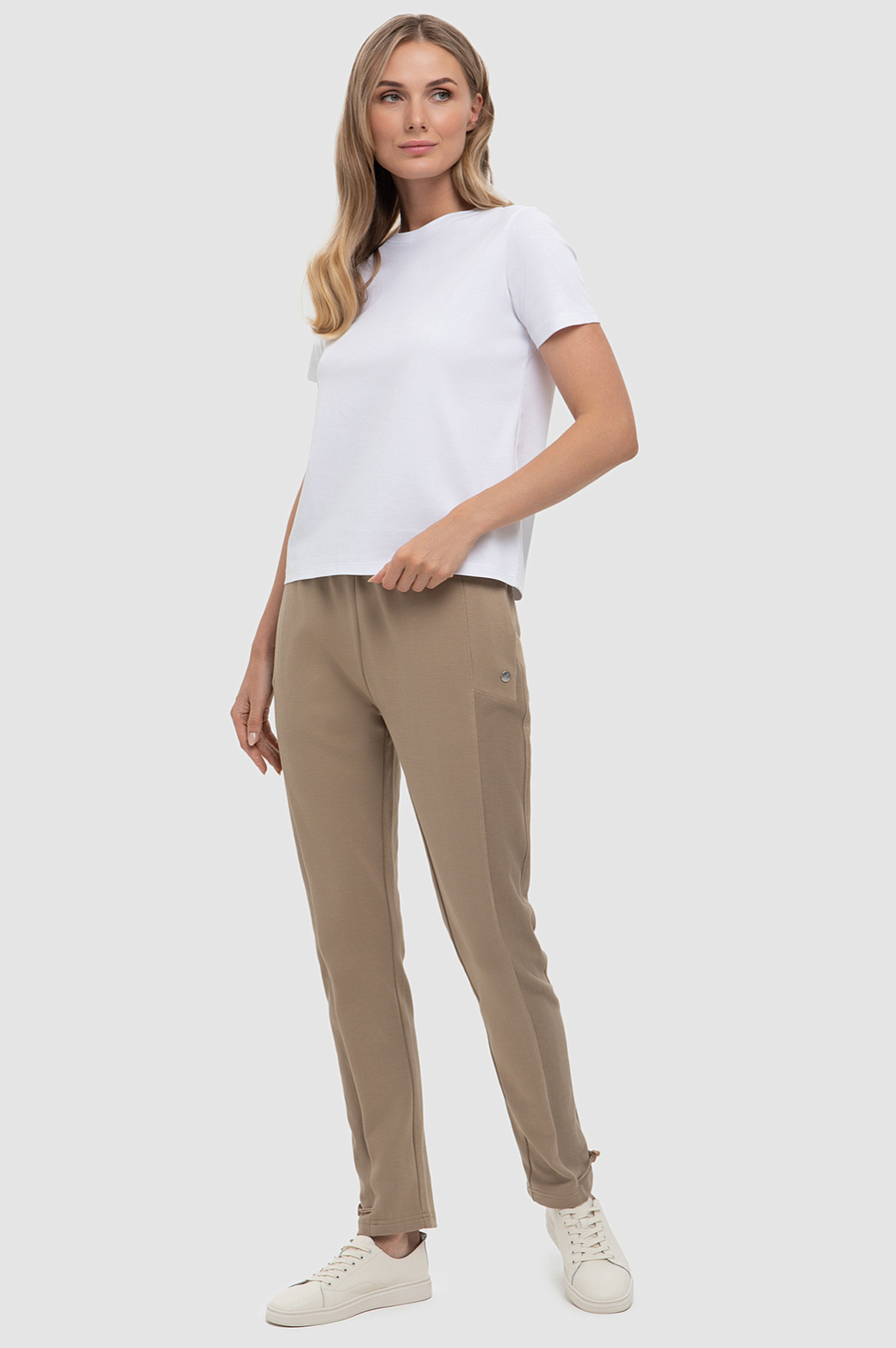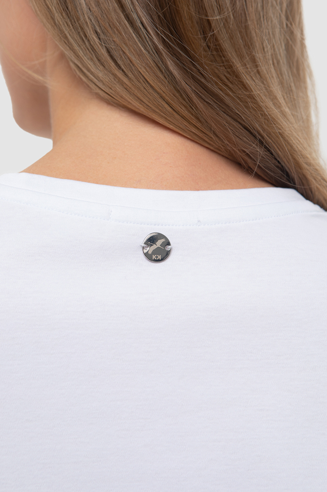 Белая футболка KANZLER из 100-процентного хлопка, украшенная деликатным круглым фирменным шильдиком сзади, — базовая вещь для аутфитов в повседневном и спортивном стилях, а также легких минималистичных современных образов. Полуприлегающий крой добавляет женственности, подчеркивая достоинства фигуры. Мягкий тянущийся трикотаж не ограничивает свободу действий. Натуральный хлопок заботится о комфорте тела, обеспечивая циркуляцию воздуха и отводя влагу. Качественный гладкий трикотаж устойчив к износу и неприхотлив в уходе. Параметры модели: рост 180, 87-61-91 Размер на модели: S