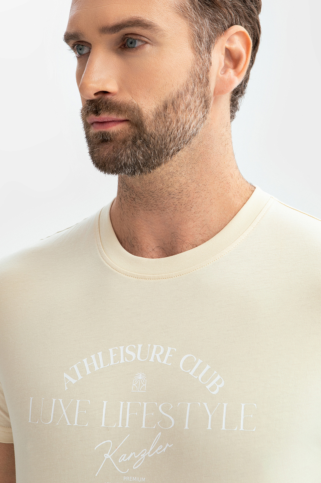 Футболка KANZLER нежно-бежевого оттенка из чистого хлопка с круглым вырезом украсит образ выходного дня. Это идеальная одежда, чтобы сочетать приятное с полезным — расслабленный отдых и физическую активность. Модель украшена надписью и логотипом. Слегка облегающий крой подчеркнет спортивную подтянутую фигуру. Мягкий натуральный трикотаж приятно носить весь день. Легкий воздушный 100-процентный гипоаллергенный хлопок создает ощущение нежного прикосновения и никогда не раздражает кожу. Параметры модели: рост 189, 102-80-99 Размер на модели: M
