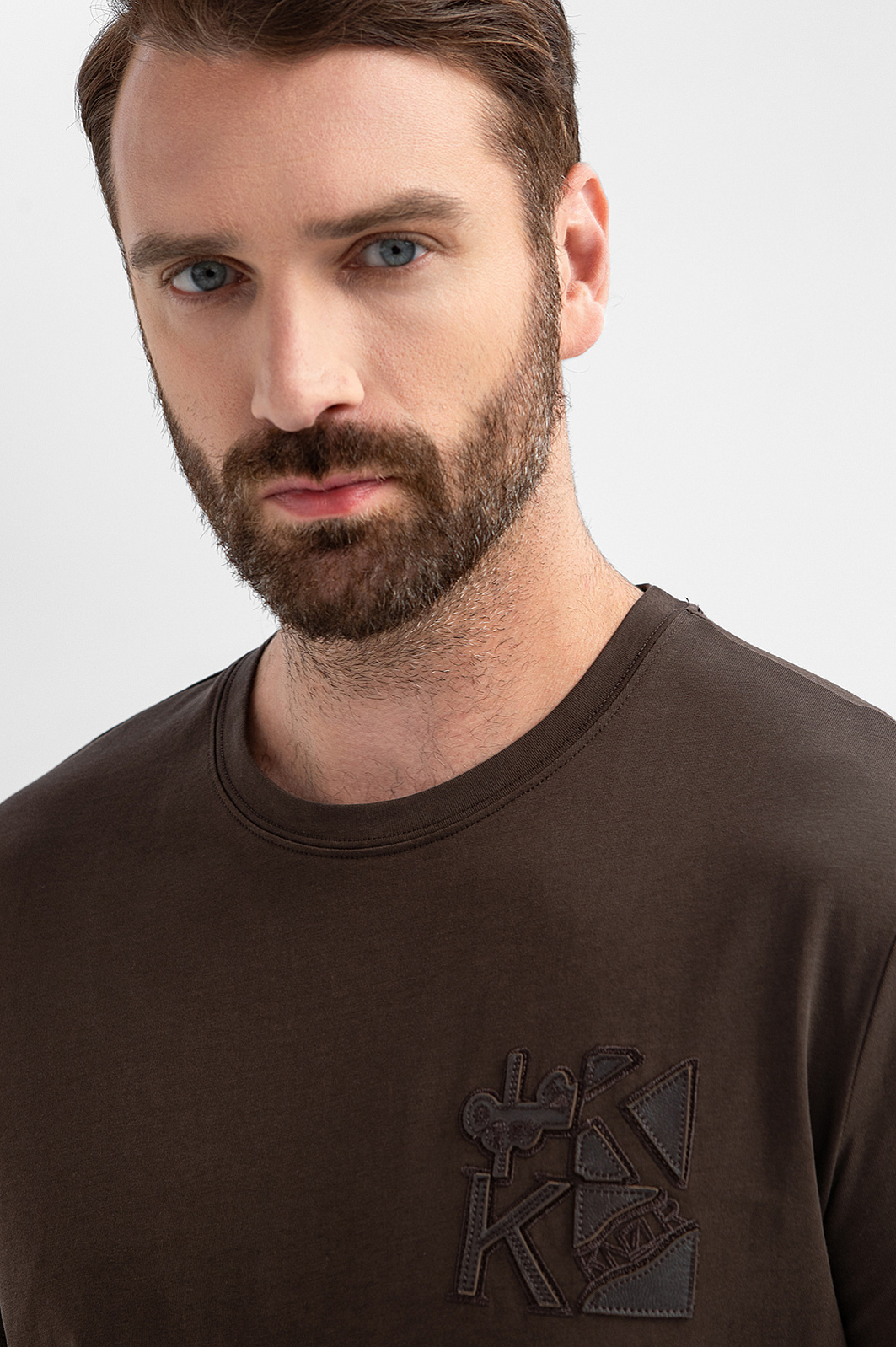 Футболка KANZLER шоколадного оттенка из чистого хлопка — стильная элегантная модель со спортивным характером, которая отлично сочетается с джинсами и джоггерами. Прилегающий силуэт подчёркивает линии тела, создавая современный динамичный образ. Оригинальная фирменная нашивка на груди служит акцентом, который превращает базовую футболку в стильную узнаваемую вещь. Эластичный трикотаж из чистого гипоаллергенного хлопка обеспечивает естественную мягкость, воздухопроницаемость и комфорт в течение дня. Параметры модели: рост 189, 102-80-99 Размер на модели: M