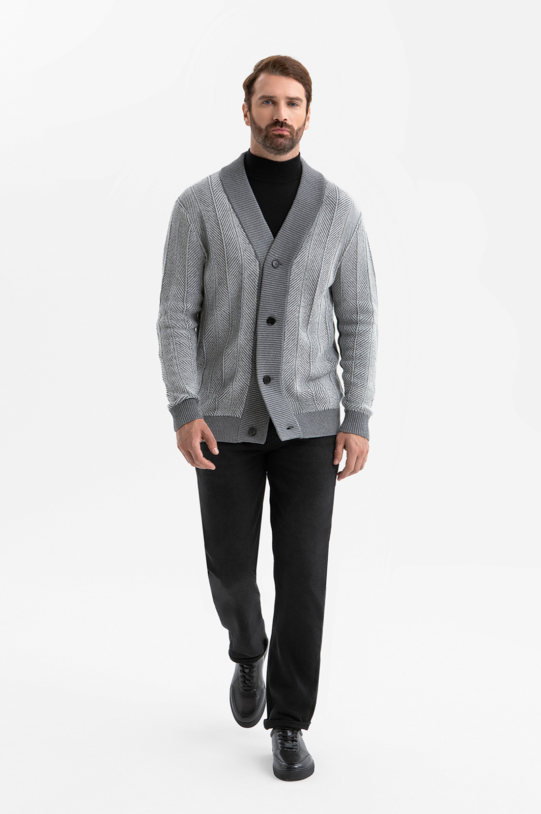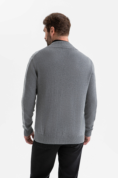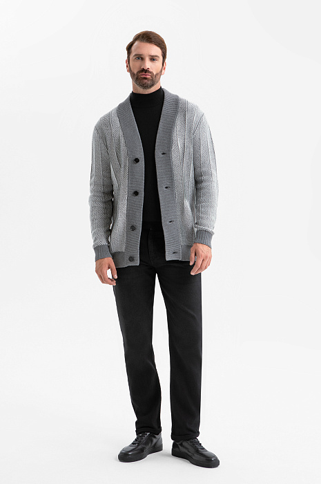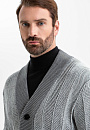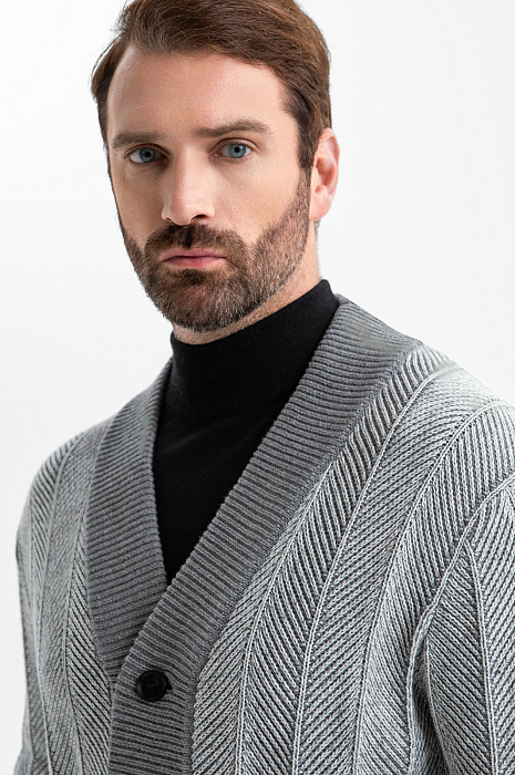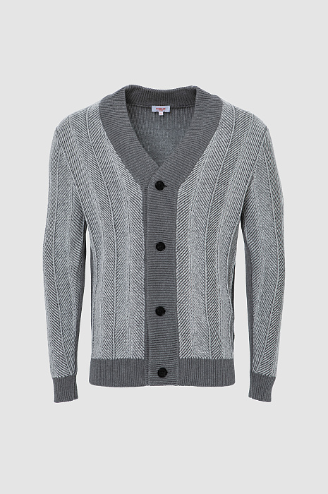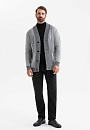 Серый кардиган KANZLER из хлопка и кашемира — воплощение комфорта и элегантности. Базовый элемент гардероба мужчины, который ценит качество, стиль и функциональность. Переднюю часть украшает рисунок, образованный диагональным рубчиком и чёткими вертикальными линиями, которые визуально вытягивают силуэт. Такой архитектурный дизайн подчёркивает строгость и аккуратность модели, делая её уместной как в деловом, так и в повседневном стилях. Более светлый оттенок передней части гармонично сочетается со спинкой и резинками среднего серого тона, создавая мягкий контраст. Треугольный вырез хорошо сочетается с рубашкой, футболкой и водолазкой. Вязаный трикотаж из натуральных волокон приятен к телу, мягко облегает тело и обеспечивает комфорт в течение дня. Кашемир придаёт ткани изысканный вид и нежность, а хлопок — прочность, воздухопроницаемость и практичность. Параметры модели: рост 189, 102-80-99 Размер на модели: M