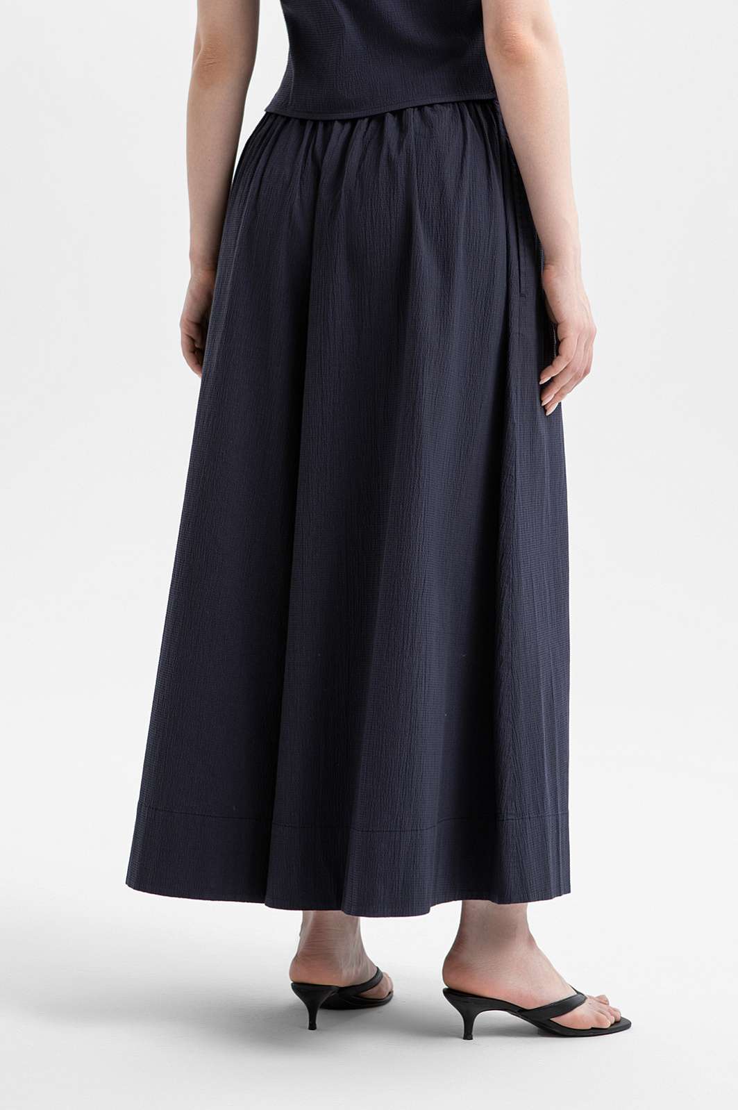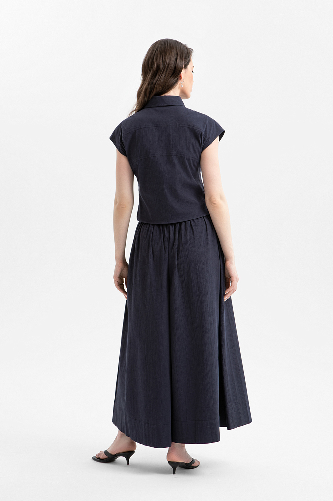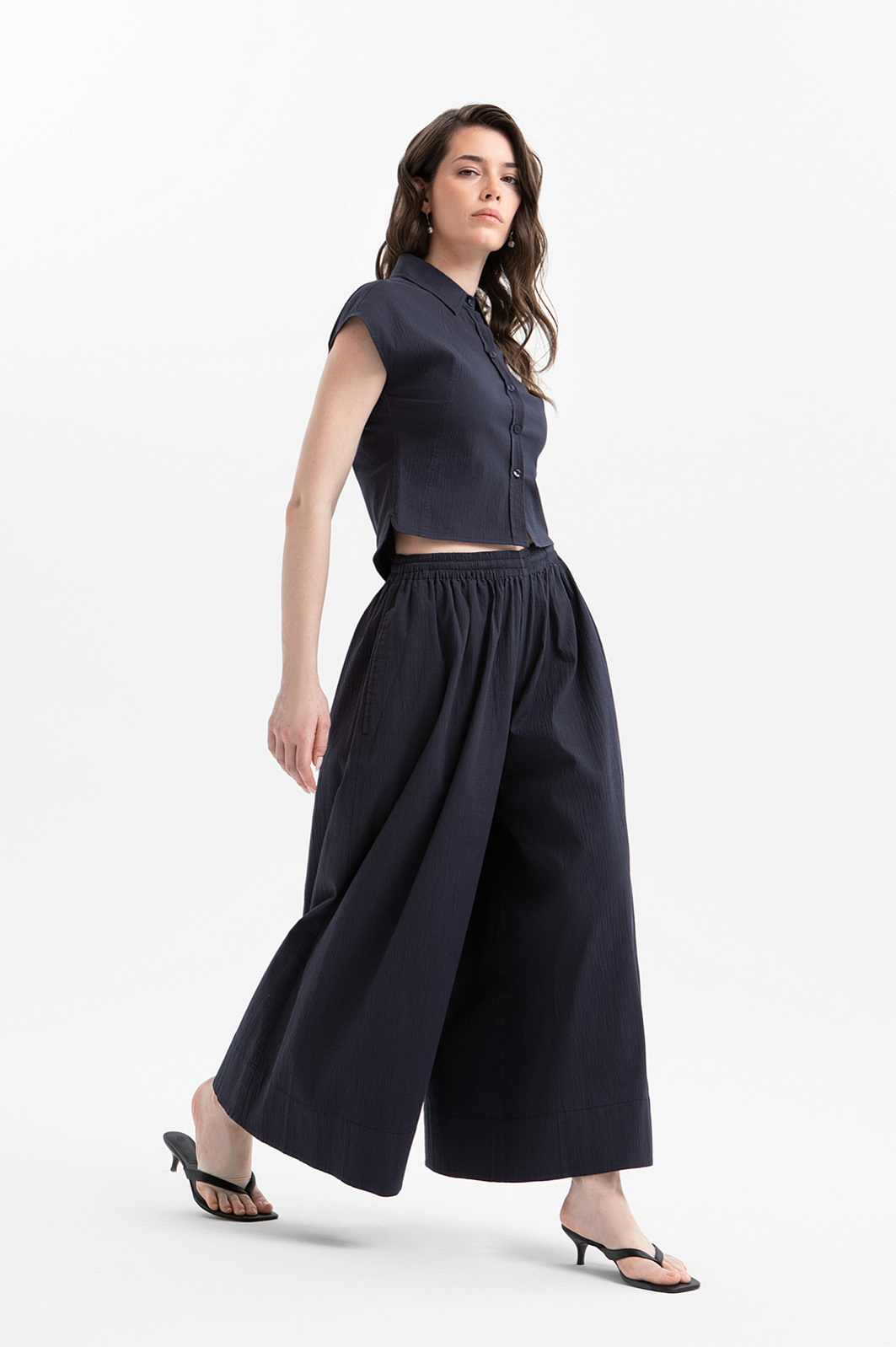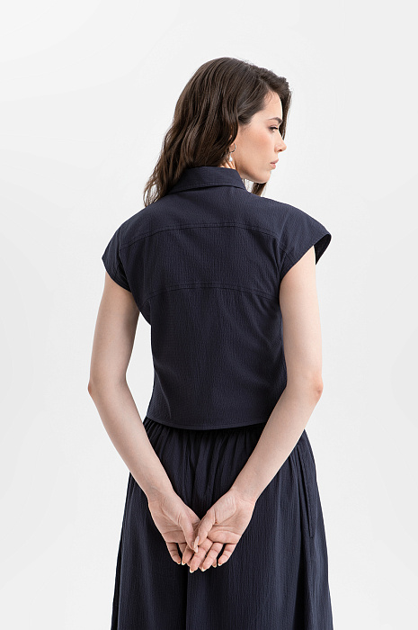 Эффектный сет KANZLER глубокого синего цвета — гармоничное сочетание лаконичной блузки и современных кюлотов, создающее стильный и комфортный образ для тёплого сезона. Блузка с небольшими рукавами-крылышками отличается Т-образным силуэтом и подчеркнутой зауженной талией. Кюлоты с широкими укороченными штанинами задают женственный силуэт и красиво раскрываются в движении, подчёркивая лёгкость и романтичность образа. Ткань с деликатной фактурой выполнена из натурального гипоаллергенного хлопка (97%) с добавлением спандекса (3%). Это приятный к телу и слегка эластичный материал, который поддерживает естественную циркуляцию воздуха и хорошо сохраняет форму.