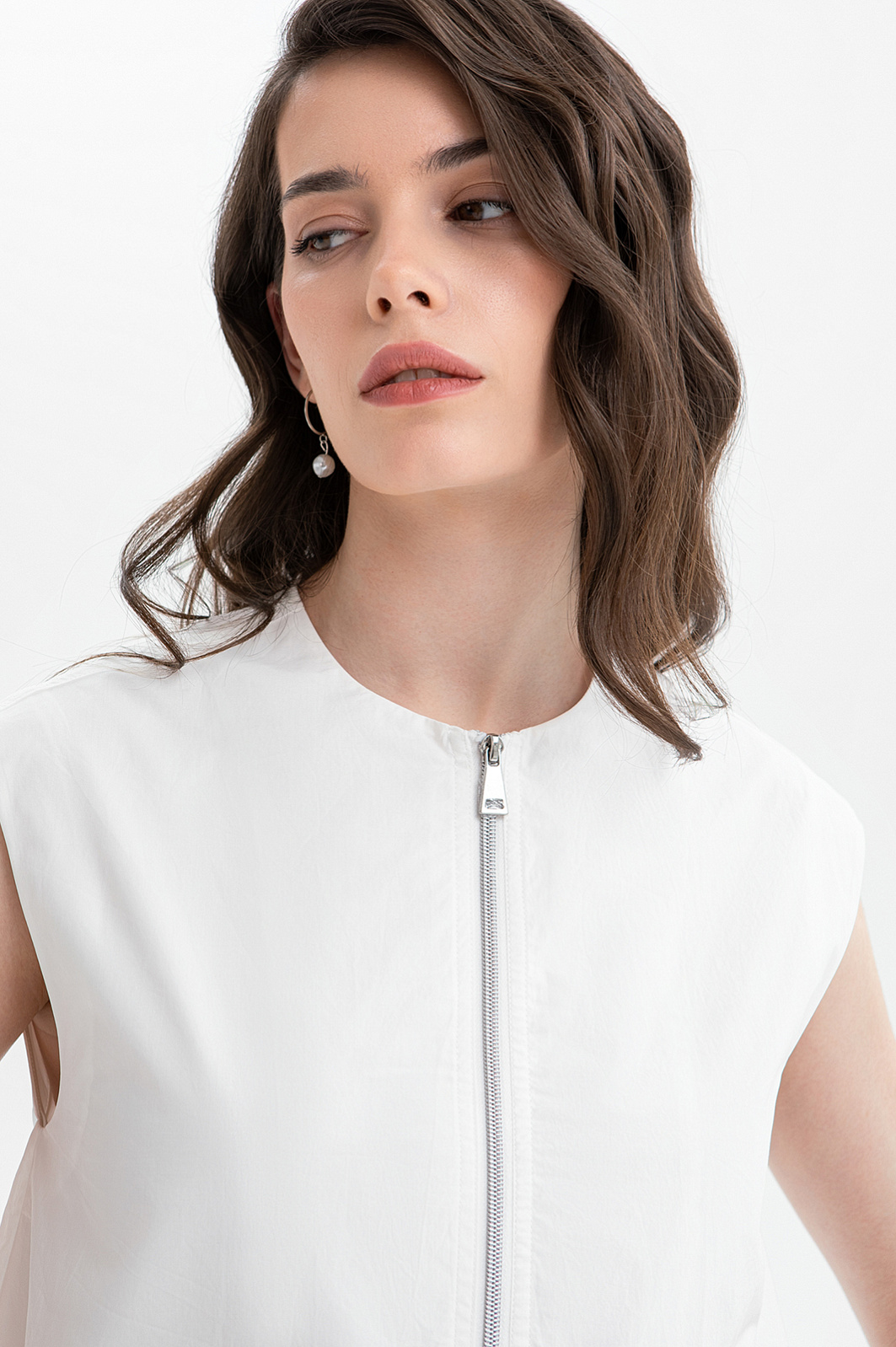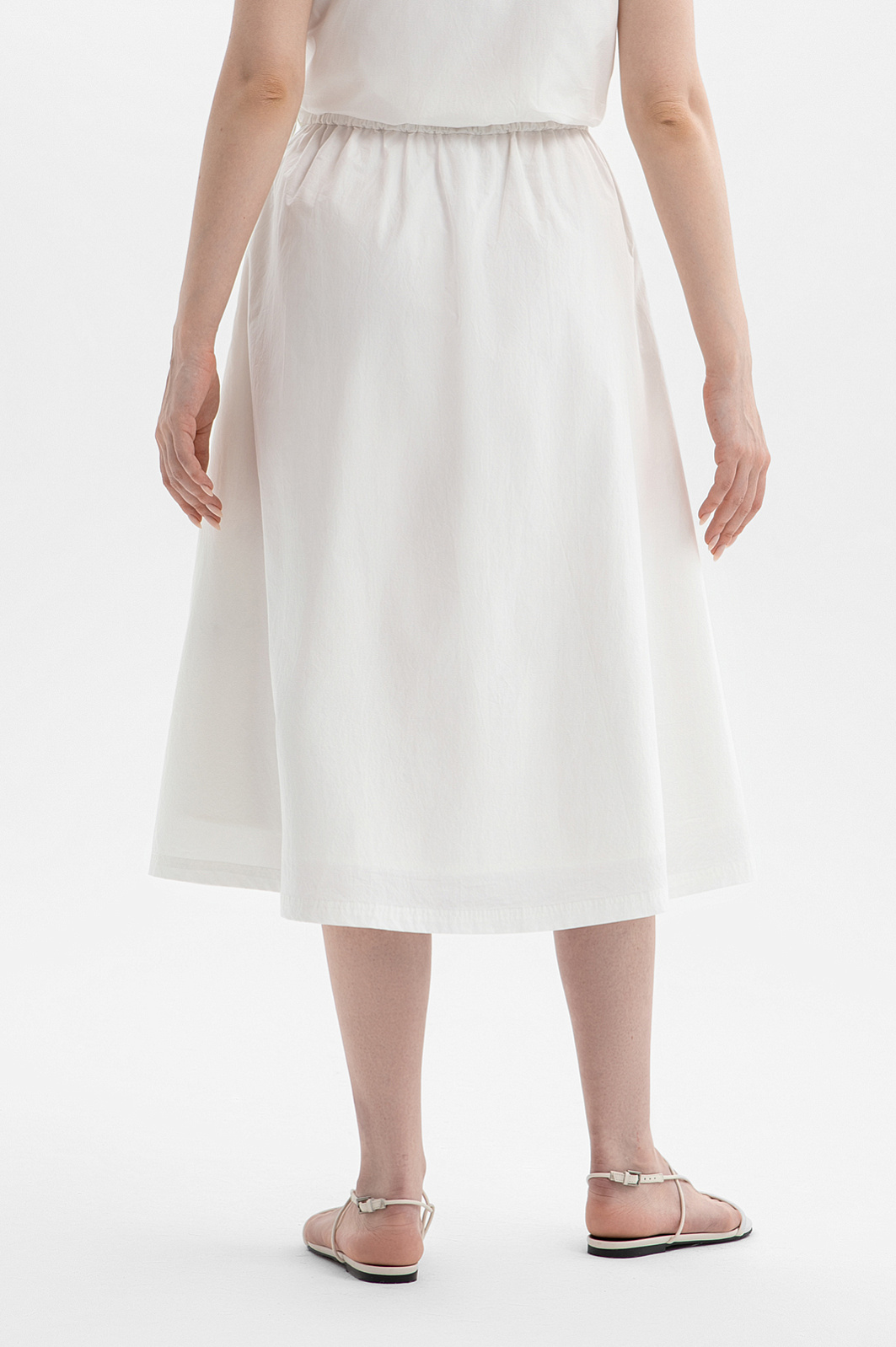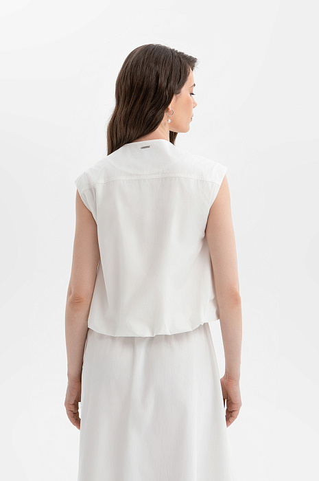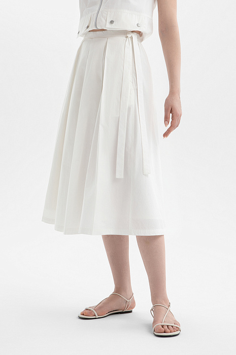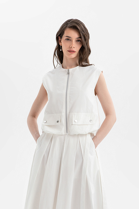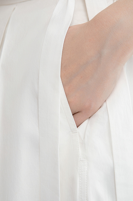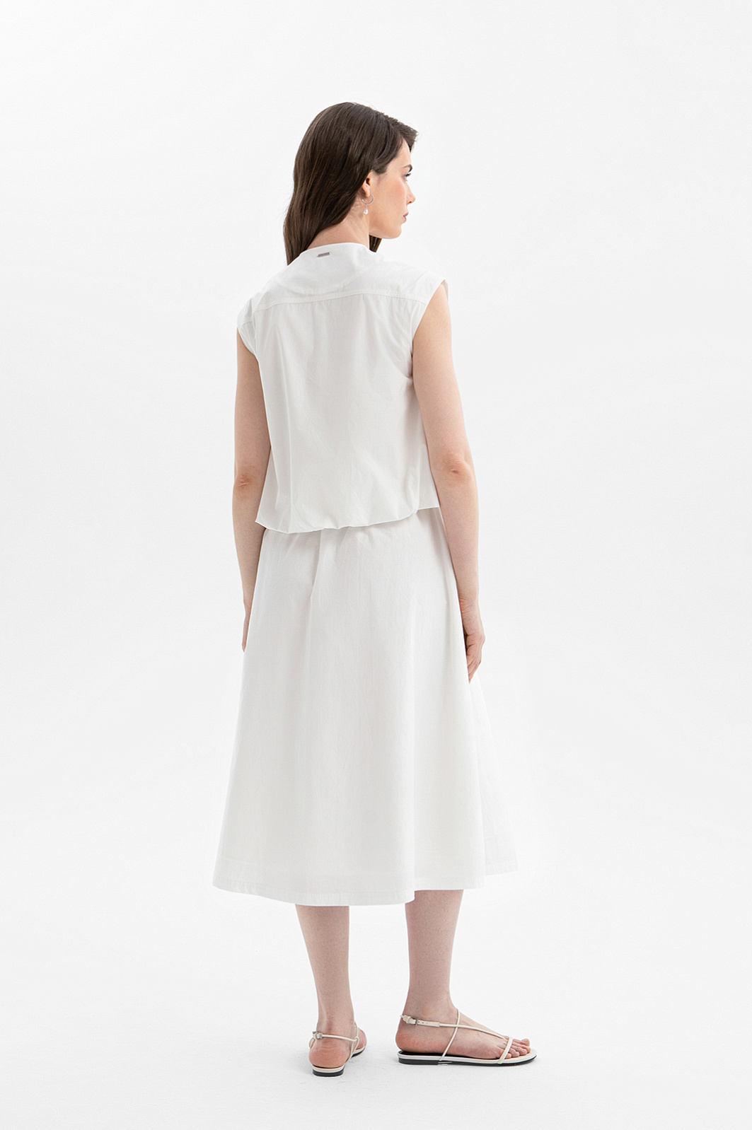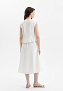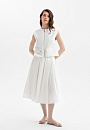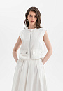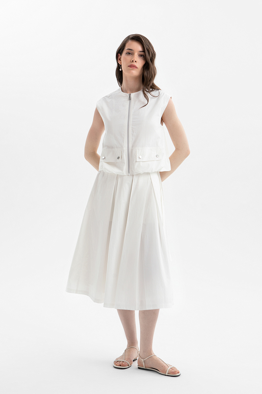 Минималистичный костюм KANZLER из чистого хлопка — ода лёгкости, женственности и непринуждённой элегантности. Белый цвет подчёркивает свежесть образа и создаёт ощущение воздушности, а натуральная ткань дарит комфорт даже в жаркие дни. Верх — жилет лаконичного спортивного кроя с присборенным подолом. Акцентную роль играют серебристая молния и кнопки на клапанах из белого металла. Низ — юбка-миди А-образного силуэта с широкими складками спереди и аккуратным поясом с длинными свободными концами. Хлопок (100%) придаёт комплекту сдержанный, естественный шик. Лёгкие гипоаллергенные волокна поддерживают естественную циркуляцию воздуха и берегут тело от перегревания.