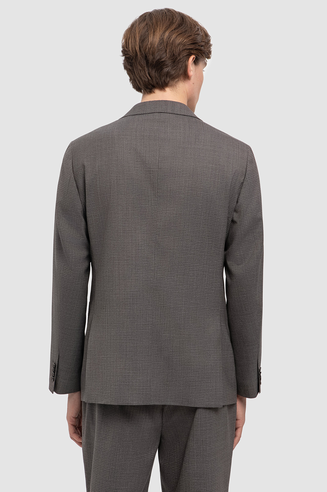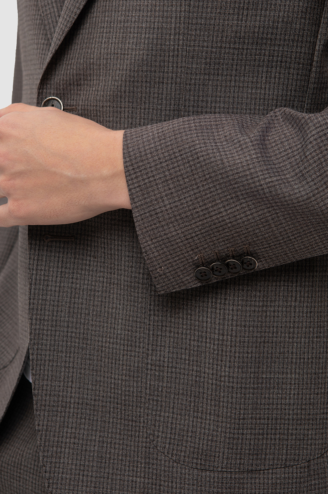 Коричневый костюм KANZLER в мелкую клетку из тонкой благородной шерсти излучает спокойствие, достоинство и уверенность. Он легко переносит длинный рабочий день, плавно переходящий в свободный вечер. Элегантная современная двойка состоит из однобортного полуприлегающего пиджака с двумя шлицами, аккуратными накладными карманами и брюк слегка зауженного силуэта с резинкой и шнурком на поясе — для безупречной посадки и удобства. Дорогая шерсть мериноса Супер 120S сохраняет тепло и защищает от перепадов температуры. Благодаря упругости волокон, ткань сохраняет форму в течение всего дня.