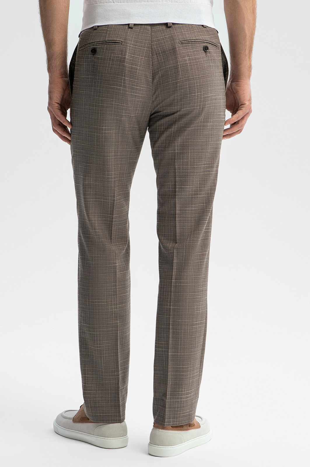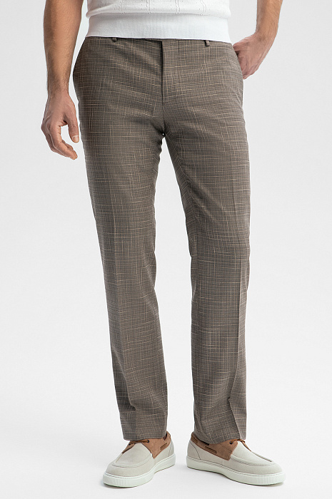 Светло-коричневый костюм KANZLER из шерсти, хлопка и льна с водоотталкивающей обработкой — союз современной элегантности, аристократической небрежности и комфорта. Двойка составлена из классического однобортного пиджака приталенного силуэта с естественной линией плеча и двумя шлицами сзади и слегка зауженных брюк со стрелками. Рисунок в тонкую клетку добавляет образу легкости. Натуральная смесовая ткань — воплощение роскоши и комфорта. Упругие волокна тонкой шерсти мериноса Cупер 120S (90%) хорошо держат форму и придают материалу благородный лоск. Хлопок и лен обеспечивают теплорегуляцию и свежесть тела. Особая обработка защищает ткань от капризов погоды и загрязнений.