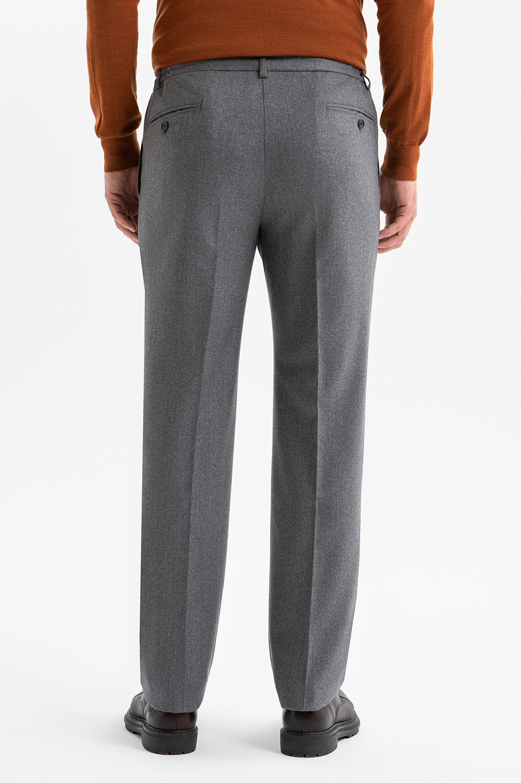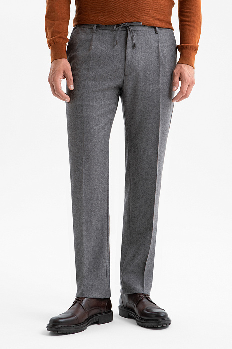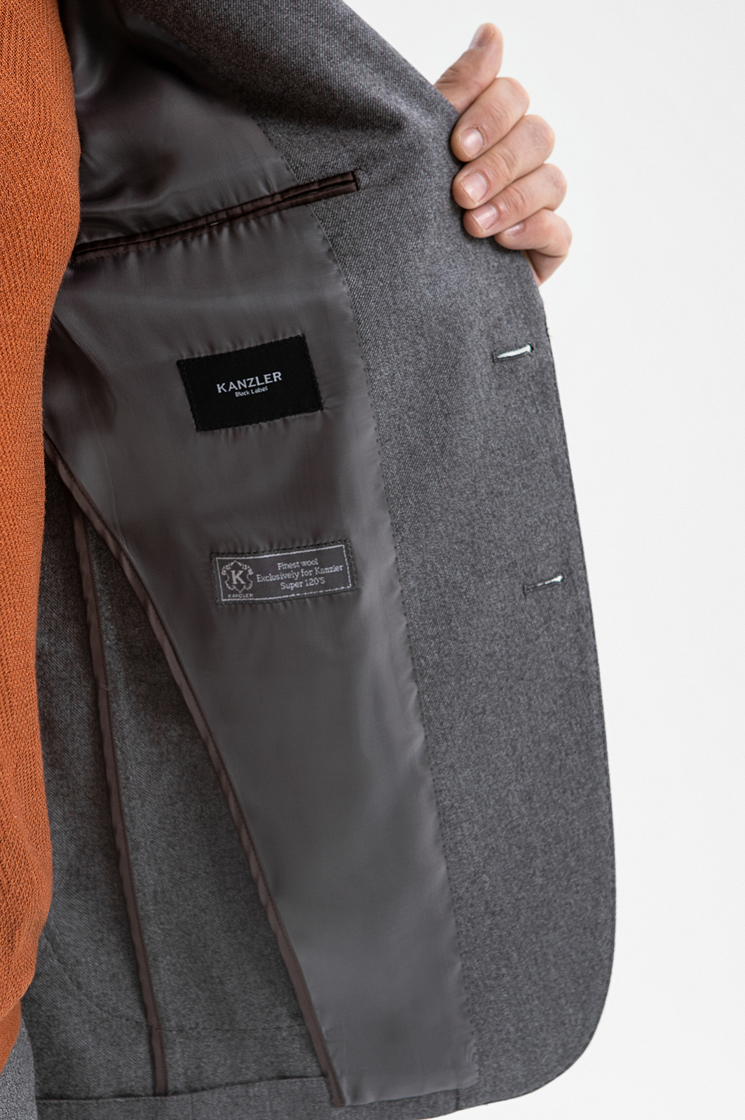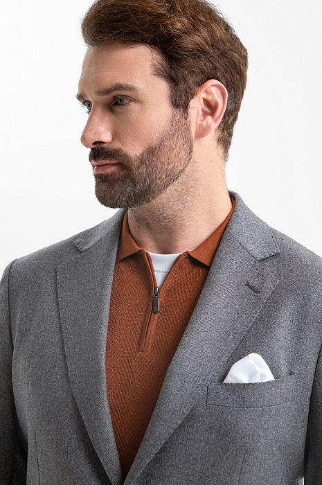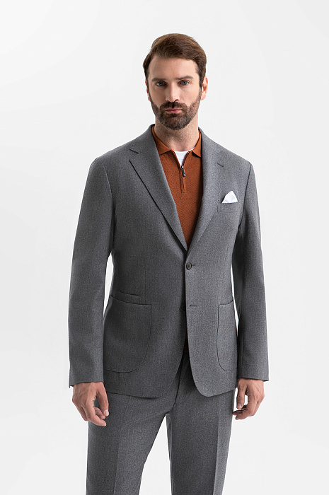 Элегантный костюм-двойка KANZLER спокойного серого цвета выполнен из дорогой высококачественной шерсти мериноса, которая обеспечивает комфорт, функциональность и современную эстетику. Прилегающий силуэт костюма мягко очерчивает контуры тела, создавая динамичный образ. Пара составлена из пиджака с накладными карманами и удобных брюк на кулиске со стрелками. Премиальная шерсть Супер 120S создана с применением передовых технологий: водоотталкивающая обработка защищает материал от переменчивой погоды. Его тончайшие ворсинки толщиной не более 18 микрон сохраняют естественное тепло и поддерживают оптимальную температуру тела.
