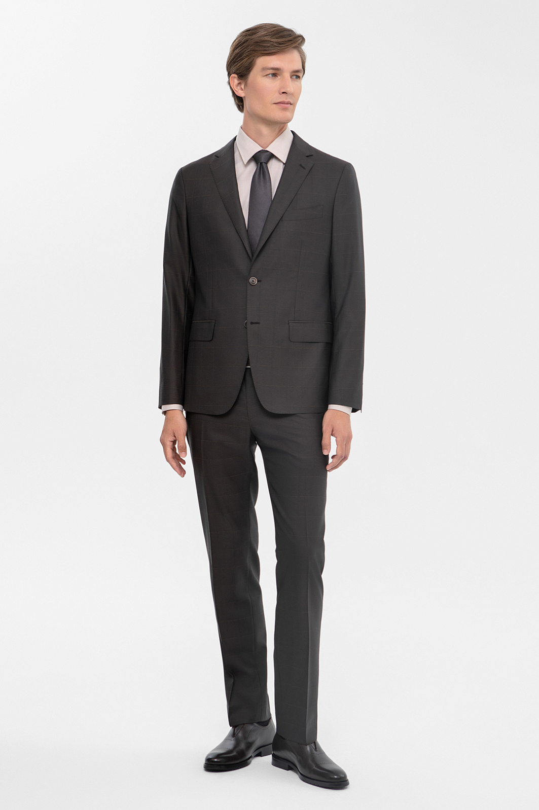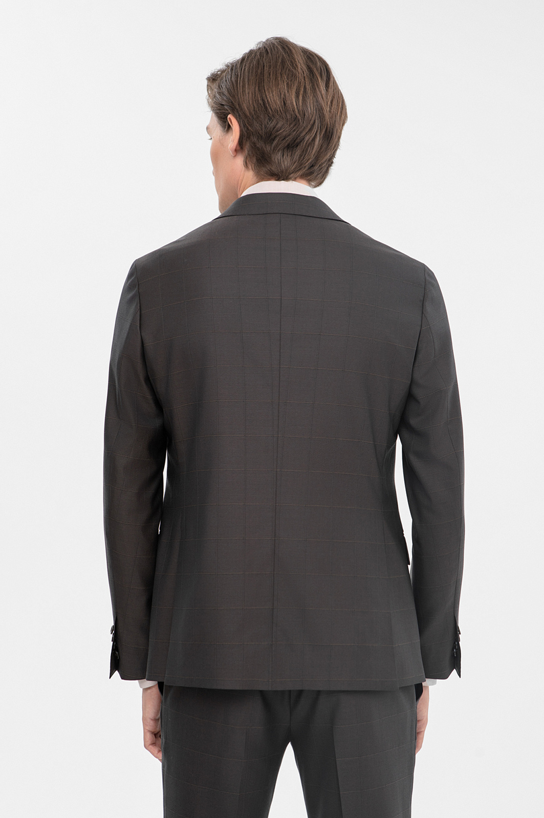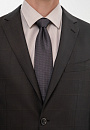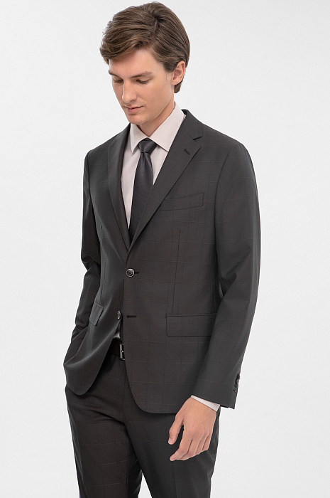 Костюм KANZLER спокойного серо-коричневого оттенка из тонкой шерсти мериноса Супер 140S объединяет черты консервативного делового стиля с небольшими вольностями — современным кроем и узором в неброскую тонкую клетку. Двойка состоит из однобортного пиджака с двумя шлицами, пуговицами в тон и брюк со стрелками. Благодаря зауженному силуэту любая фигура вытягивается и не выглядит приземленной. Естественные линии плечевого пояса обеспечивают хорошую посадку. Натуральная ткань мягко облегает тело, намечая основные константы — ширину плеч и линию талии. Для производства материала использовались тонкие волокна шерсти, которые придают ему дорогой вид и поддерживают комфортную для тела температуру и в теплые, и в холодные дни.