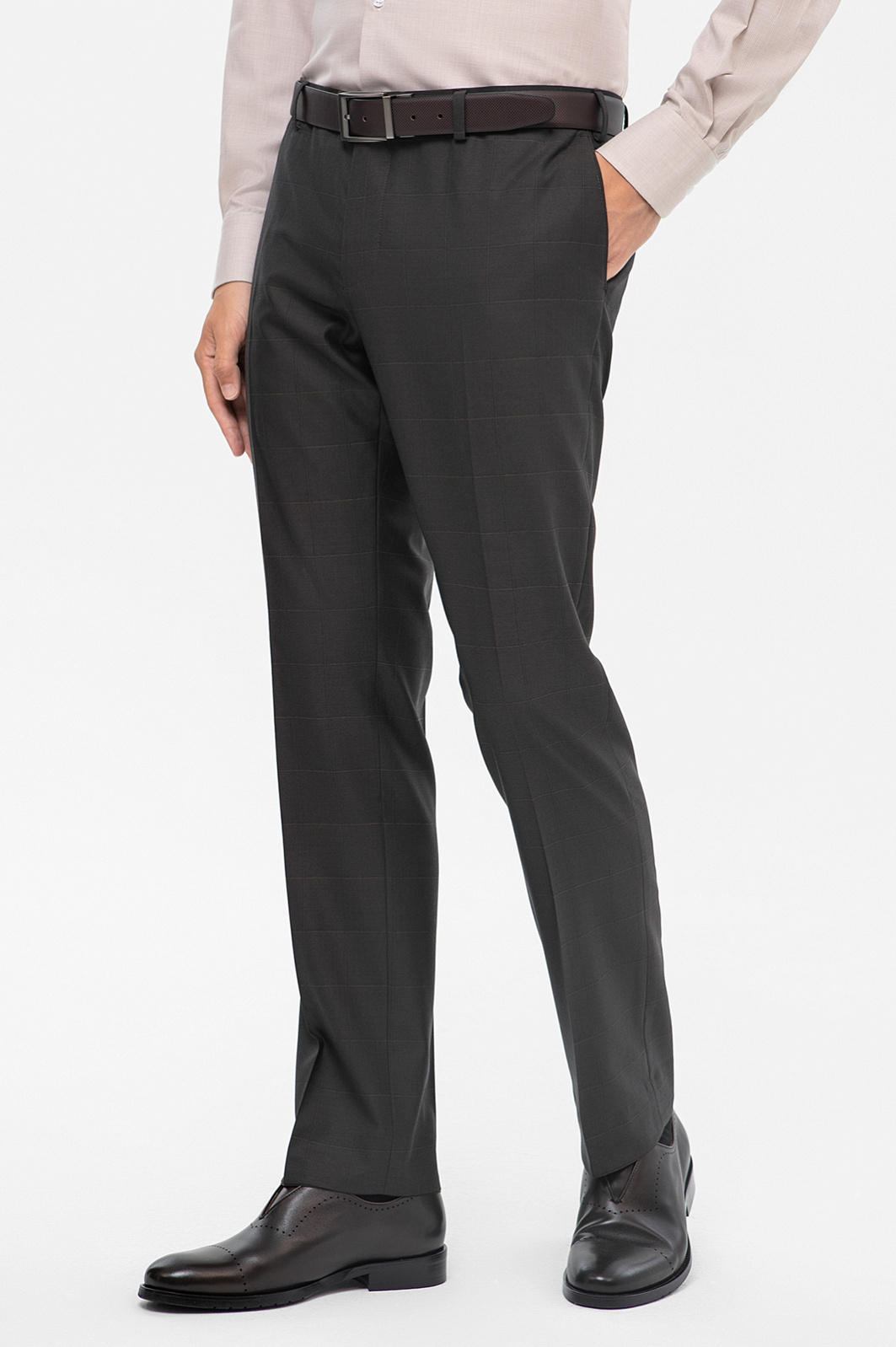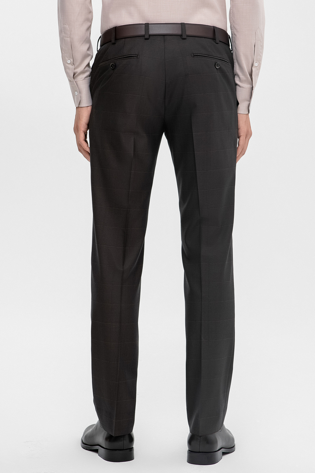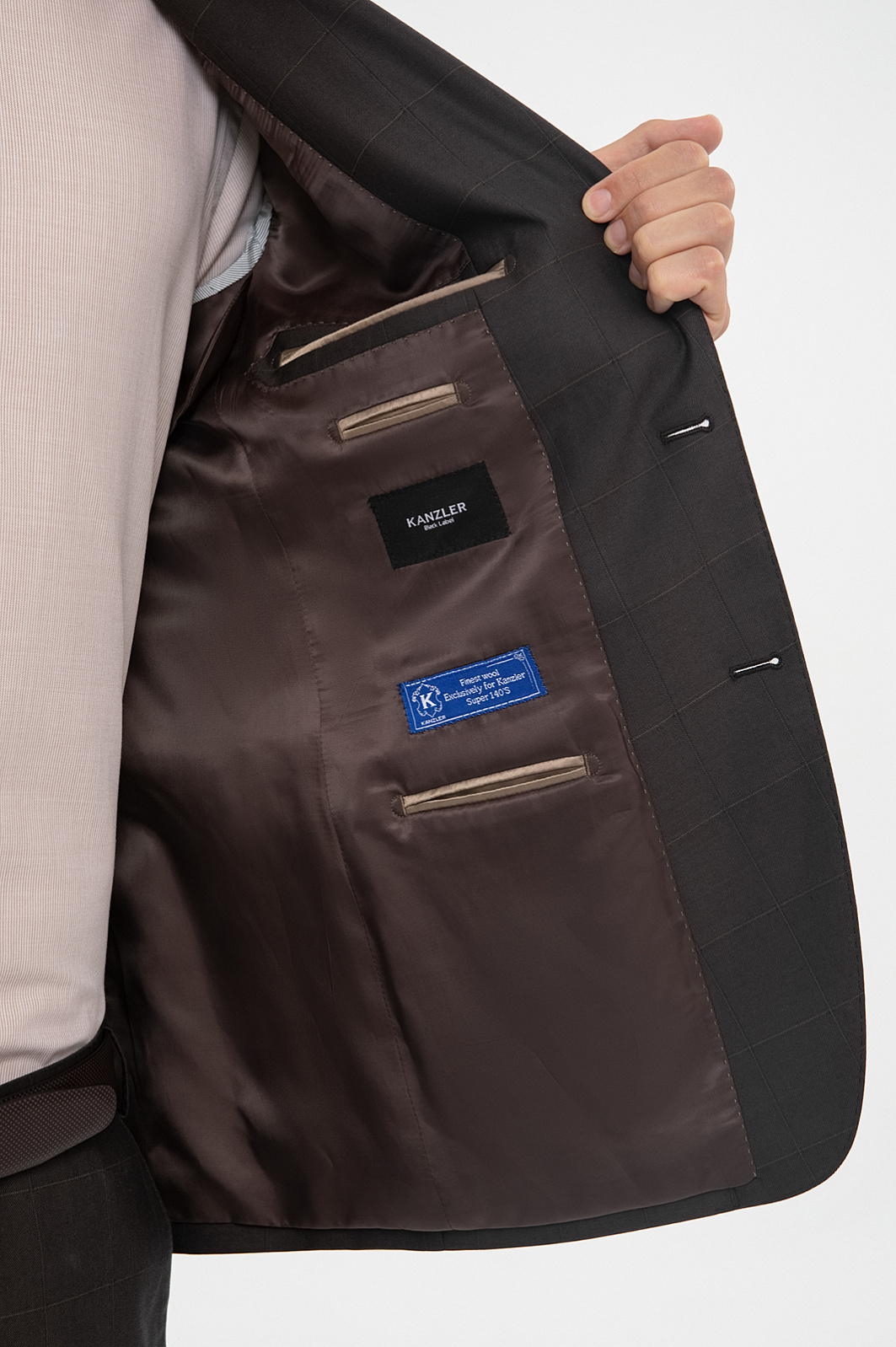 Костюм KANZLER спокойного серо-коричневого оттенка из тонкой шерсти мериноса Супер 140S объединяет черты консервативного делового стиля с небольшими вольностями — современным кроем и узором в неброскую тонкую клетку. Двойка состоит из однобортного пиджака с двумя шлицами, пуговицами в тон и брюк со стрелками. Благодаря зауженному силуэту любая фигура вытягивается и не выглядит приземленной. Естественные линии плечевого пояса обеспечивают хорошую посадку. Натуральная ткань мягко облегает тело, намечая основные константы — ширину плеч и линию талии. Для производства материала использовались тонкие волокна шерсти, которые придают ему дорогой вид и поддерживают комфортную для тела температуру и в теплые, и в холодные дни.