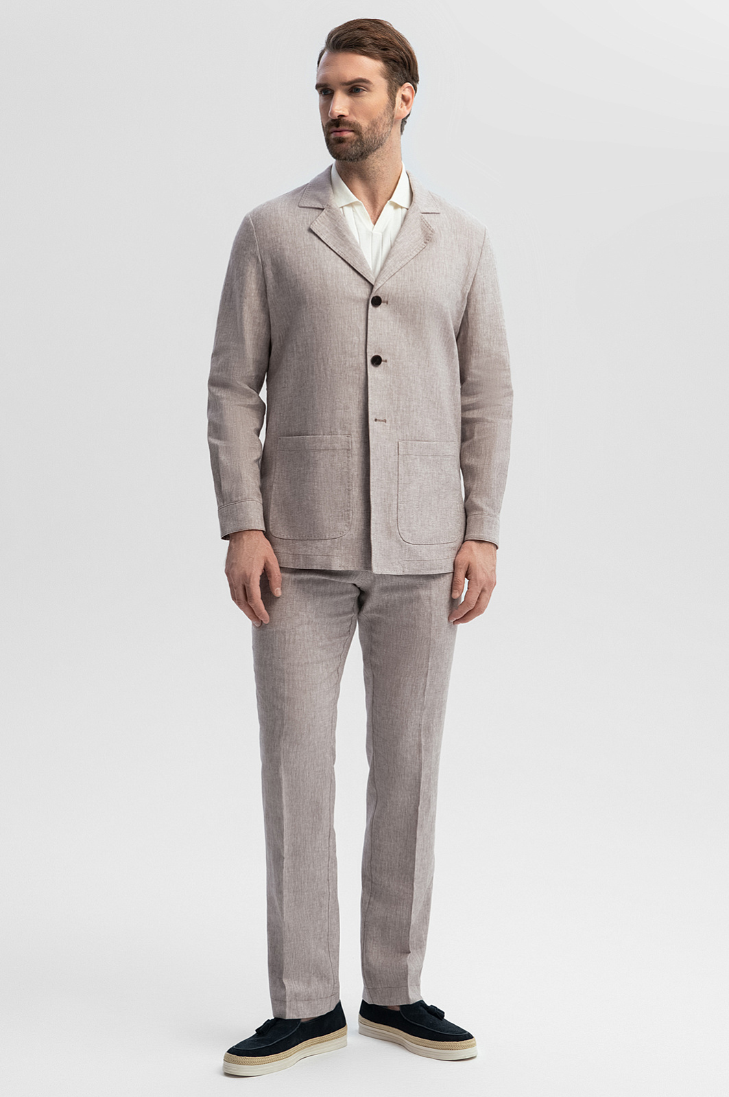 Микс классических и спортивных деталей в светло-бежевом костюме KANZLER из хлопка и льна выглядит стильно и оригинально. Небольшими акцентами на светлом фоне служат пуговицы шоколадного оттенка. Пара составлена из облегченного пиджака с манжетой на пуговицах и аккуратными накладными карманами, который может выполнять функцию «второй рубашки», и удобных брюк на кулиске. Натуральный смесовый материал полотняного переплетения, созданный из легкого воздушного хлопка и прочного износоустойчивого льна, — наилучший выбор для теплого сезона. Ткань сохраняет оптимальную для тела температуру и создает ощущение прохлады в жаркие дни.