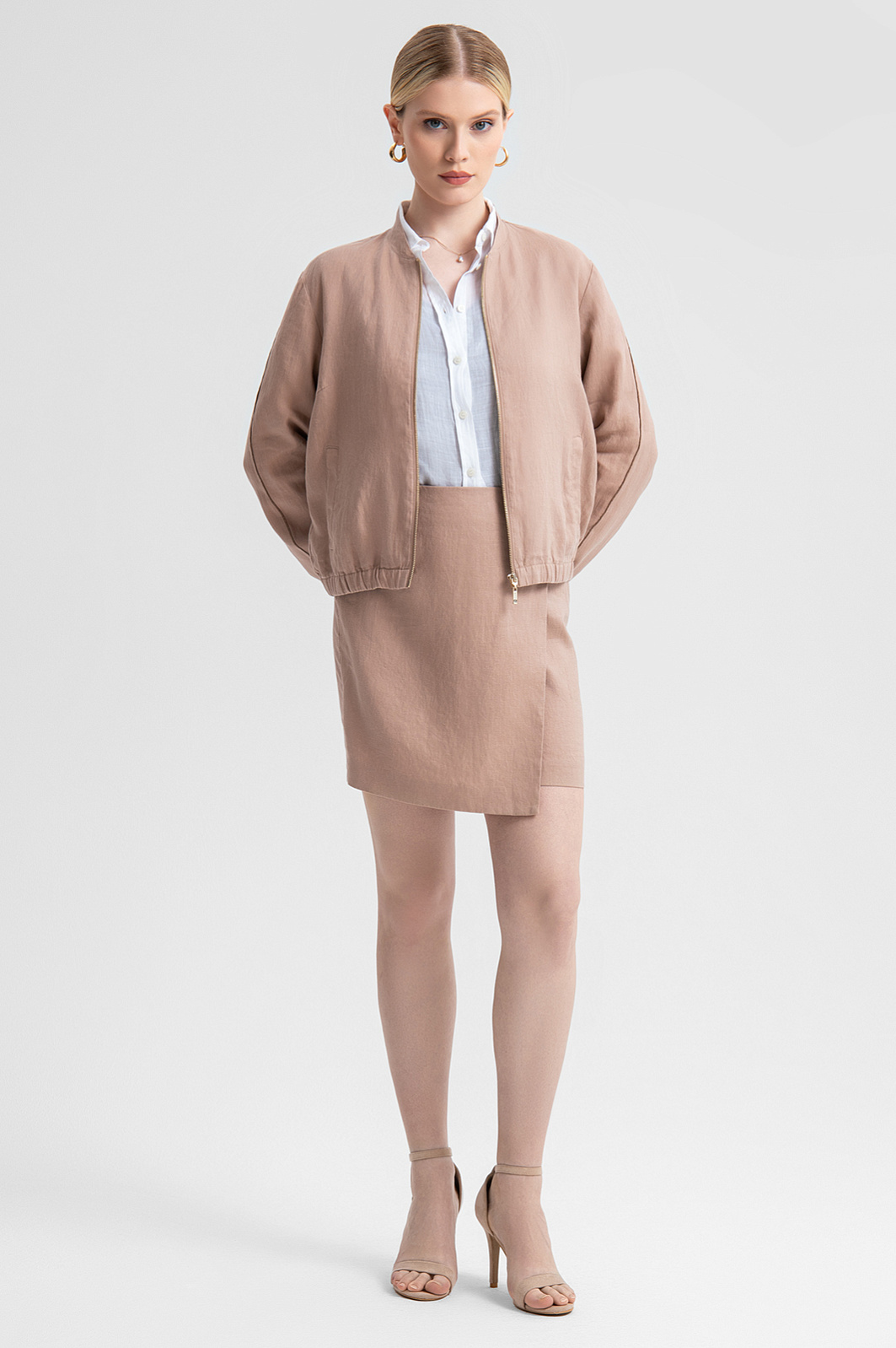 Костюм из 100% льна в пудровом цвете — выбор в пользу комфорта и элегантности. Комплект состоит из легкого бомбера и мини-юбки. Бомбер выполнен в классическом фасоне с эластичными манжетами, застежкой-молнией и боковыми карманами. Юбка – с имитацией запаха и акцентной перламутровой пуговицей. Натуральный лен – благородный материал, известный повышенной прочностью, легкостью, воздухопроницаемостью и способностью создавать идеальный микроклимат: в костюме не будет жарко под палящим солнцем, а в прохладную погоду ткань сохранит тепло. Универсальный пудровый оттенок позволяет костюму гармонично сочетаться с другими элементами гардероба, создавая стильные образы для офиса, прогулок или вечеринок.