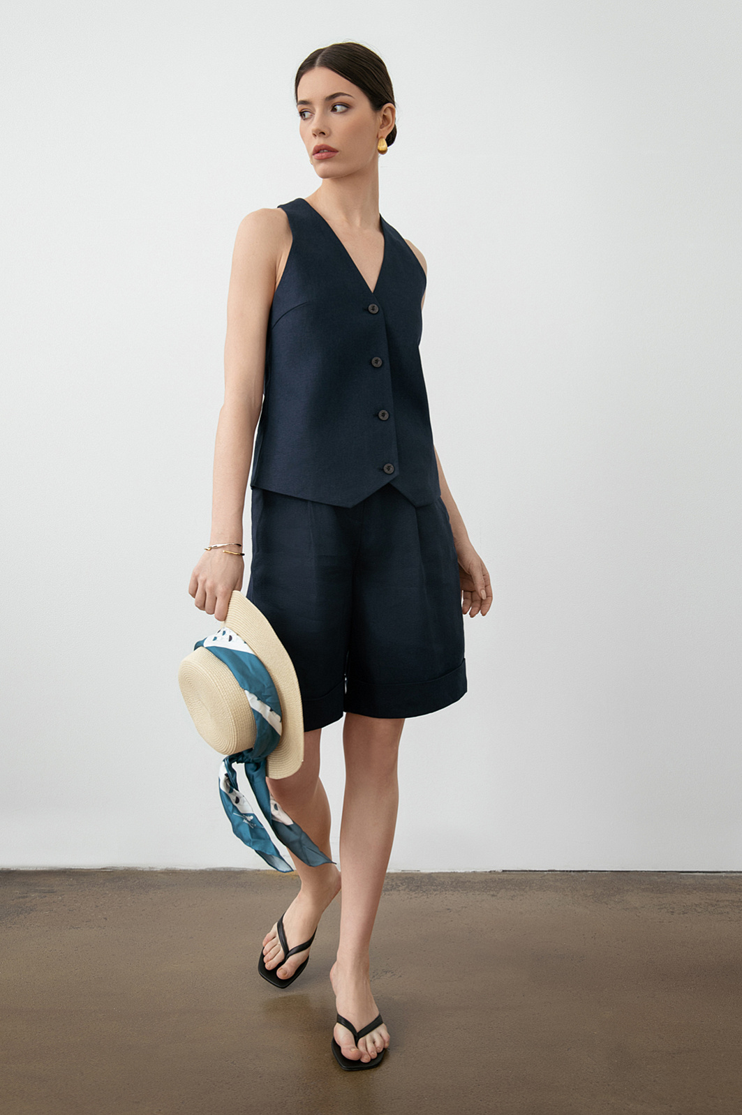 Темно-синий костюм KANZLER изо льна — заявление об элегантности и выдержанном стиле, который сочетает классические и современные черты. Чтобы выглядеть изящно на отдыхе, не обязательно дожидаться поездки на море — роскошную льняную пару можно носить и в повседневной жизни в городе. В комплекте — жилет прилегающего кроя с пуговицами в тон и бермуды с широкими отворотами, мягкими защипами и подкладкой из гладкой прочной ткани. Натуральный материал из 100-процентного льна практически не нагревается в жаркие дни — гипоаллергенные волокна обеспечивают циркуляцию воздуха и отводят влагу, поддерживая свежесть тела.
