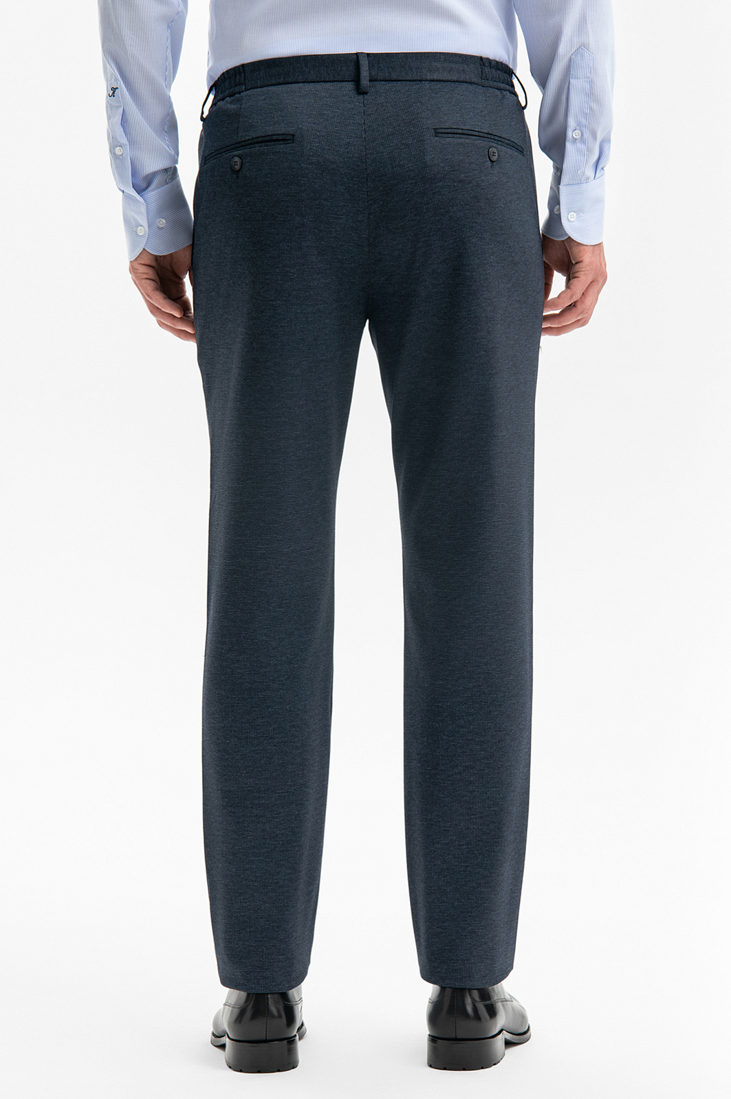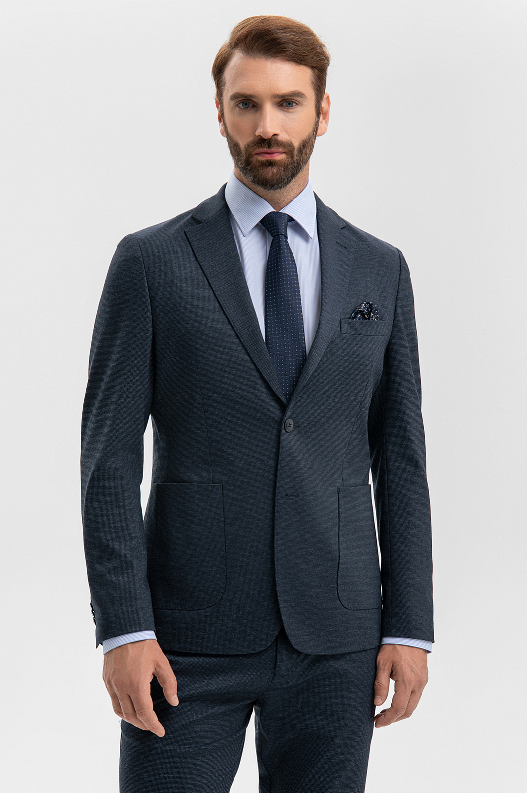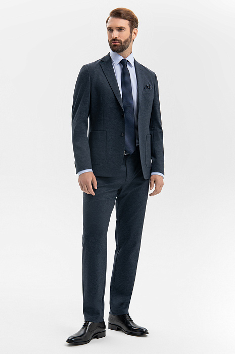 Современный повседневный костюм KANZLER сдержанного синего цвета может стать комфортной базой для офиса и одеждой для неформальных выходов, требующих элегантности и собранности. Элегантная двойка составлена из однобортного пиджака без подкладки с накладными карманами и удобных брюк с регулируемым поясом на кулиске. Силуэт подчеркивает плечи и линию талии и визуально вытягивает фигуру. Практичный костюм сшит из технологичной смесовой ткани в микроклетку. Полиэстер обеспечивает долговечность и прочность, район — циркуляцию воздуха, гигроскопичность и мягкость, а небольшая добавка спандекса — сохранение формы и аккуратную посадку.