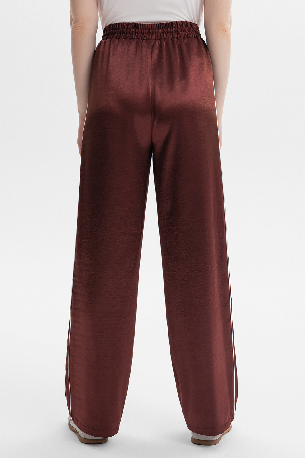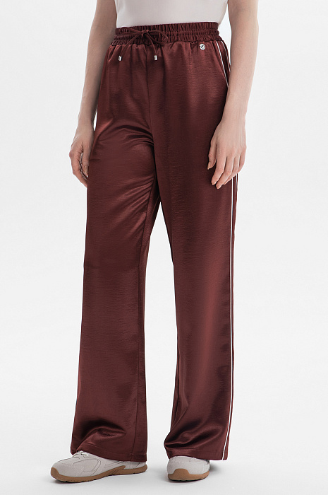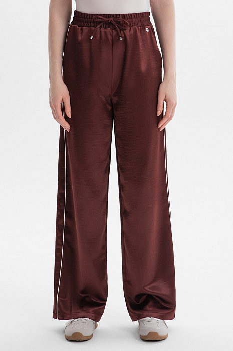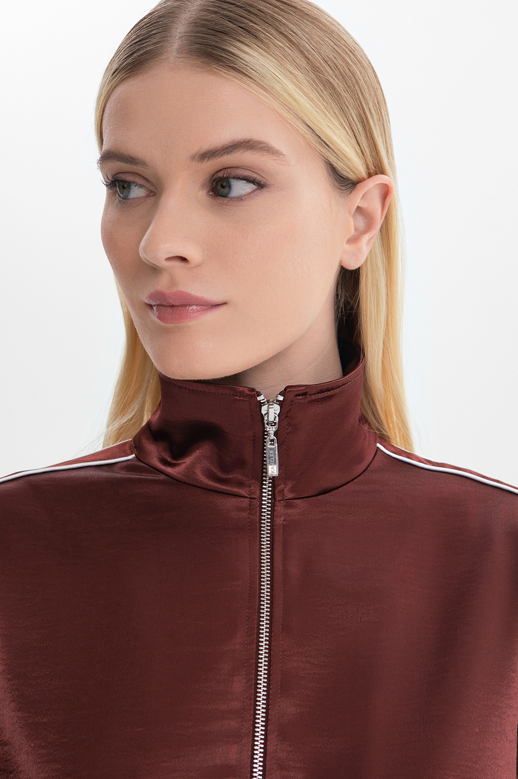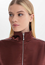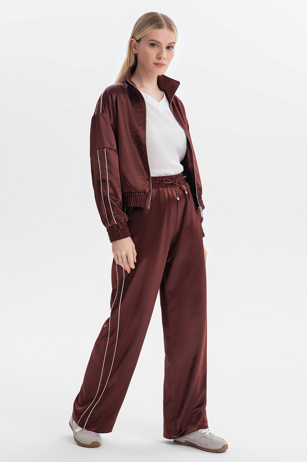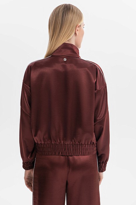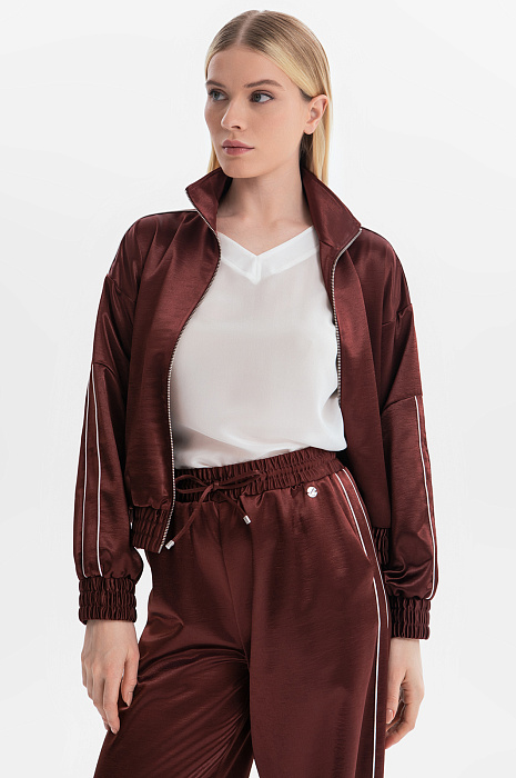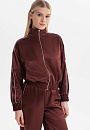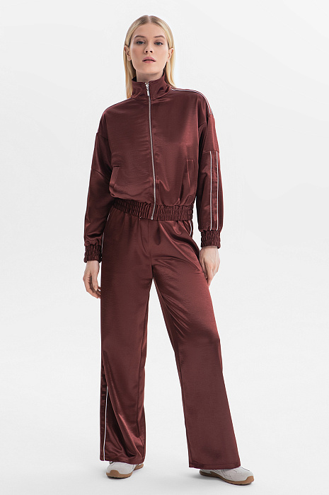 В роскошном атласном костюме KANZLER шоколадного оттенка можно с комфортом провести день, занимаясь делами и шопингом, а вечером отправиться в спортзал. Тонкие белые вставки добавляют динамики и подчеркивают спортивный характер пары. Верх костюма — короткая куртка на молнии со спущенным плечом, воротником-стойкой и резинками на рукавах и по нижнему краю, низ — свободные брюки на кулиске с лампасами. Струящийся атласный материал драпируется на теле красивыми мягкими складками. Легкие прочные волокна полиэстера не деформируются со временем и отличаются износоустойчивостью.