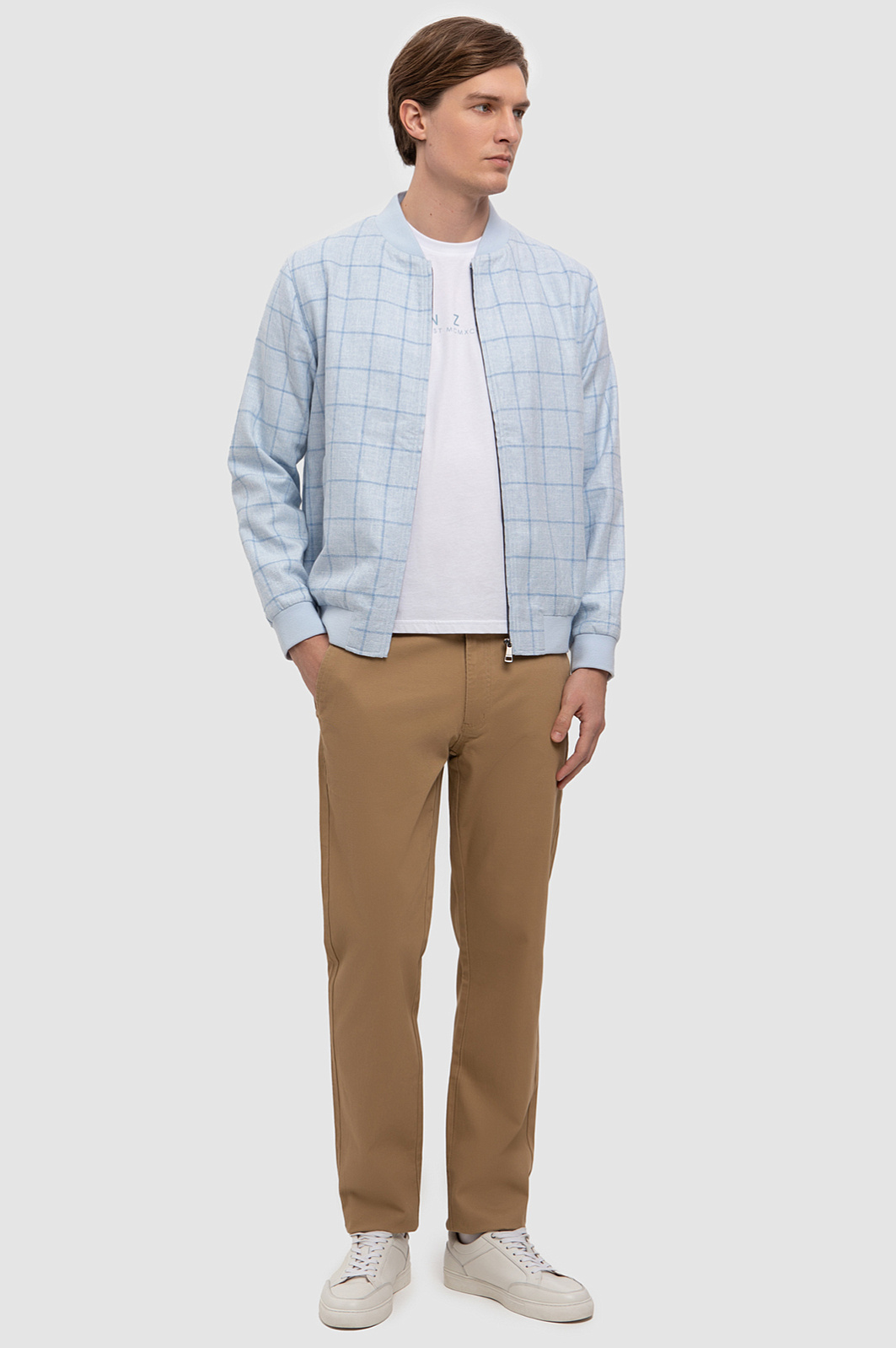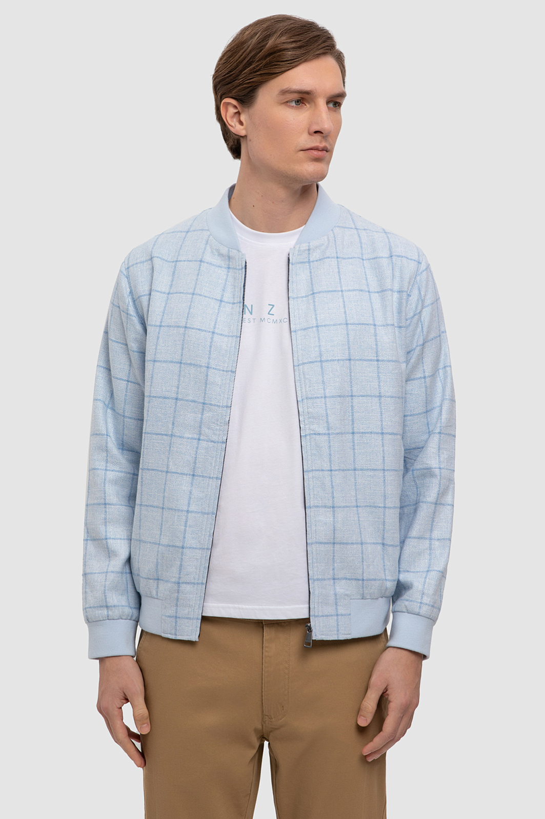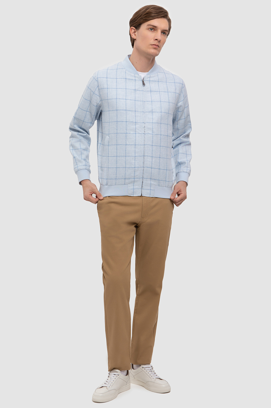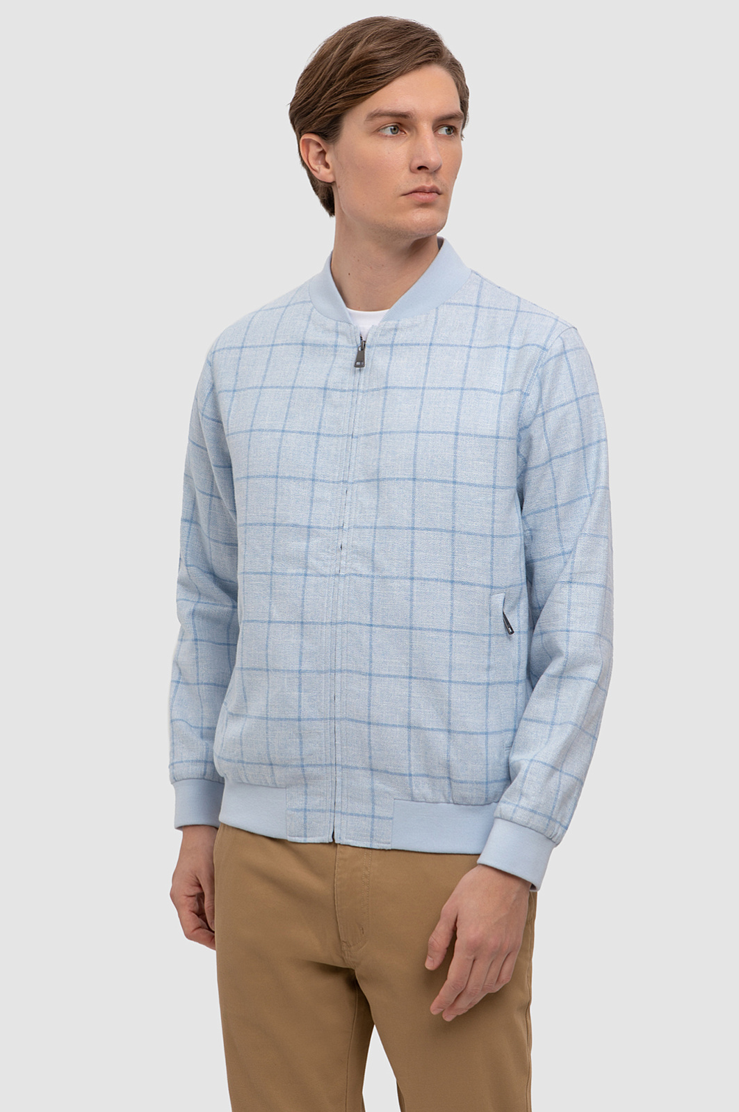 Светло-голубой бомбер KANZLER украшен широкой клеткой, которая привносит в образ лаконичность и элегантность. Остальные черты классического бомбера на месте: дизайнеры сохранили традиционный крой и детали (застежка-молния, широкие трикотажные резинки на манжетах и подоле, мягкий аккуратный воротник). В составе ткани — натуральные волокна льна и хлопка с добавлением нитей вискозы (для прочности и устойчивости к загрязнению). Лен обеспечивает приятные тактильные свойства ткани и ощущения легкой прохлады при соприкосновении с кожей. Хлопок — воздухопроницаемость и легкость. Боковые карманы застегиваются на молнию. Вместительный внутренний карман сохранит важные мелочи. Прочная гладкая подкладка из смесового материала облегчает надевание и бережет внешний слой от износа. Параметры модели: рост 191, 97-77-99 Размер на модели: 50