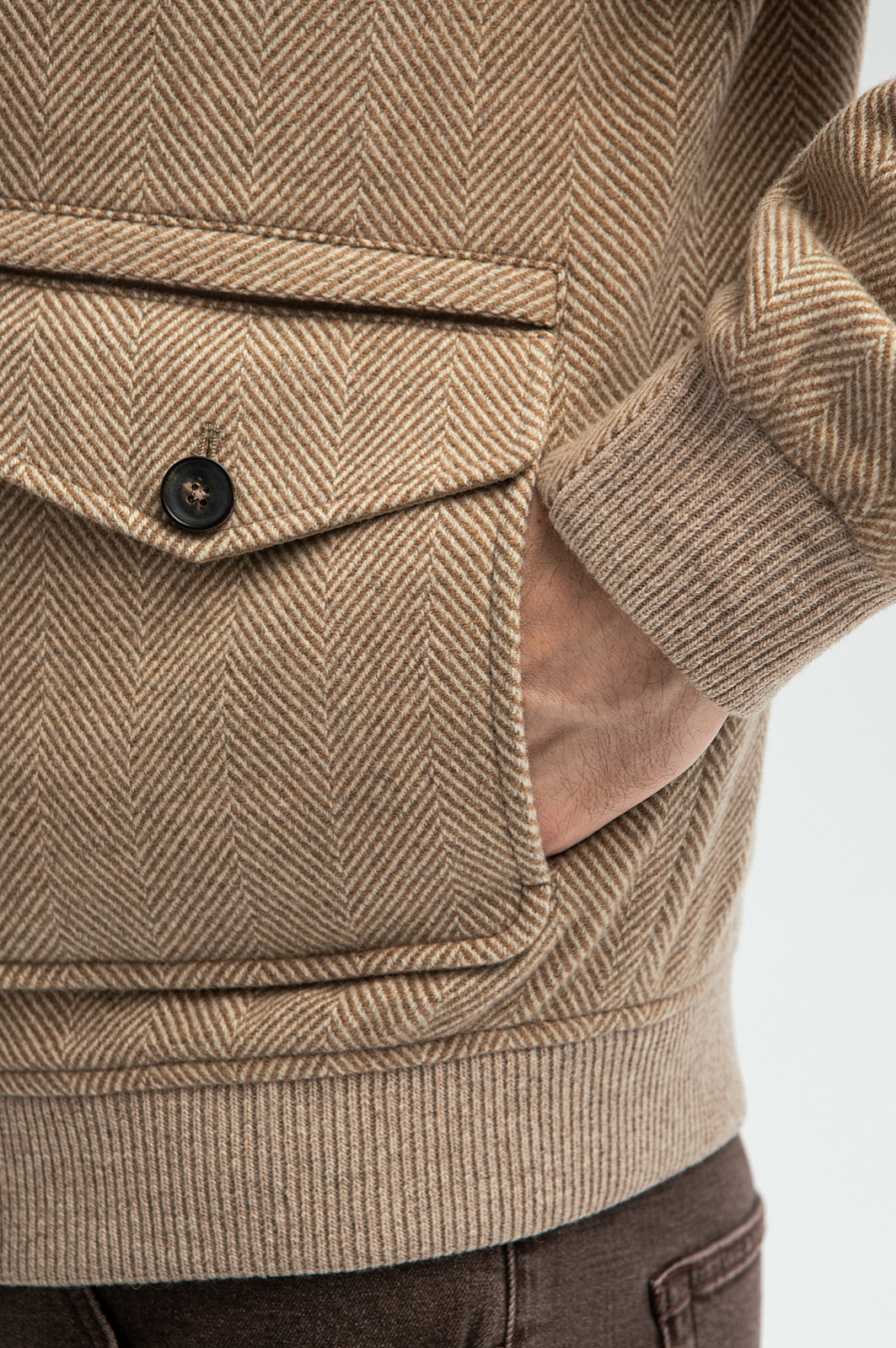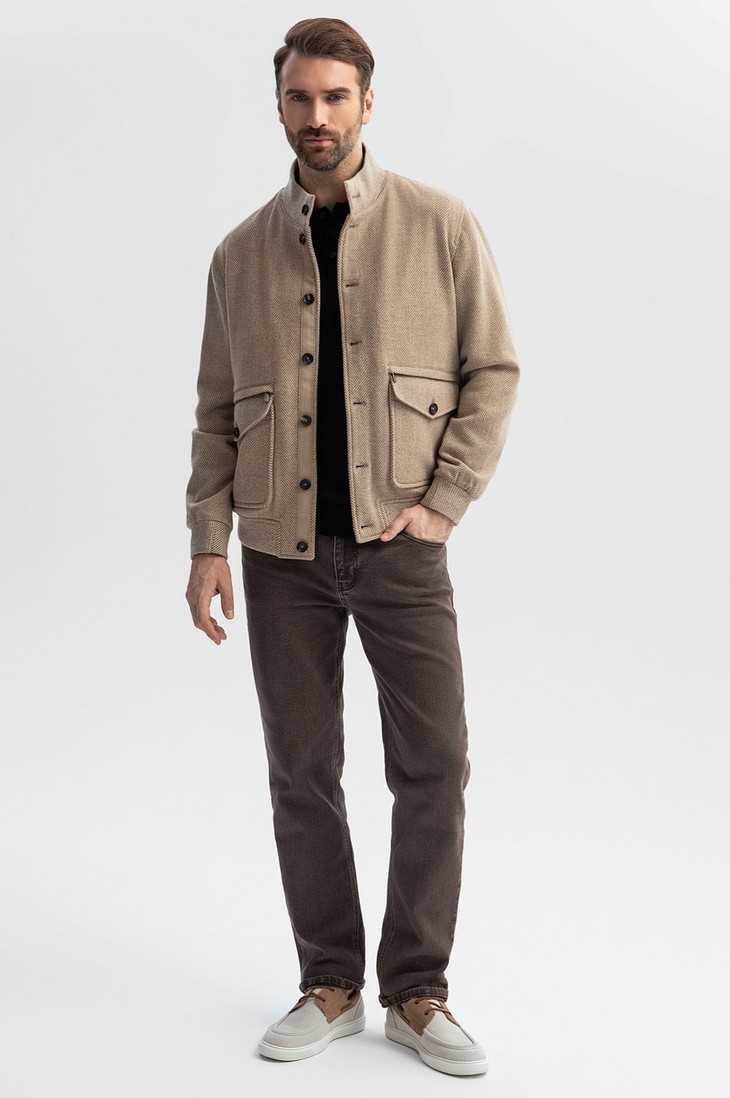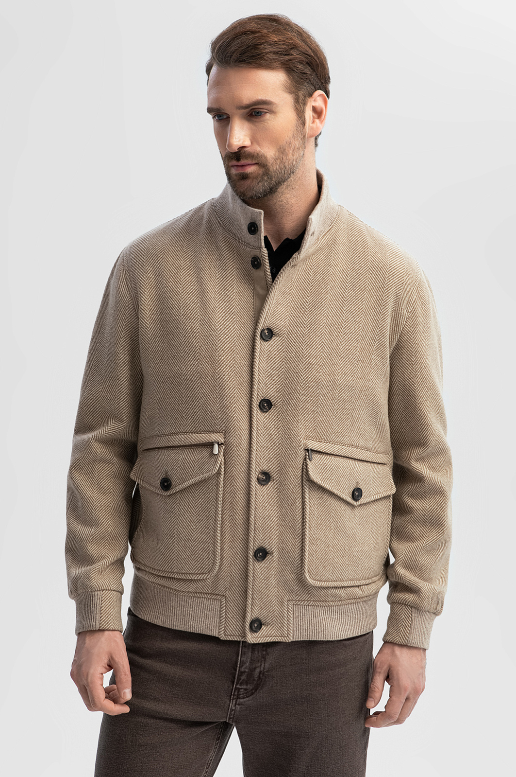 Куртка KANZLER из лимитированной коллекции — роскошный вариант бомбера, который воплощает элегантность и сдержанность. Стильная модель из шерсти и кашемира будет уместно смотреться в первом классе самолета и на прогулке в самом дорогом и престижном районе города. Куртка классического силуэта с резинками на воротнике, манжетах и снизу сшита из материала знаменитой итальянской компании Drago, которая создает ткани из превосходной шерстяной и кашемировой пряжи. Особое внимание привлекают рисунок «елочка» и детали — крупные пуговицы шоколадного оттенка и крупные накладные карманы с клапаном и молнией. Шерсть с кашемиром — дорогой натуральный материал с мягкой, приятной на ощупь структурой, который всегда выглядит безупречно и является частью делового дресс-кода. Параметры модели: рост 189, 102-80-99 Размер на модели: 50