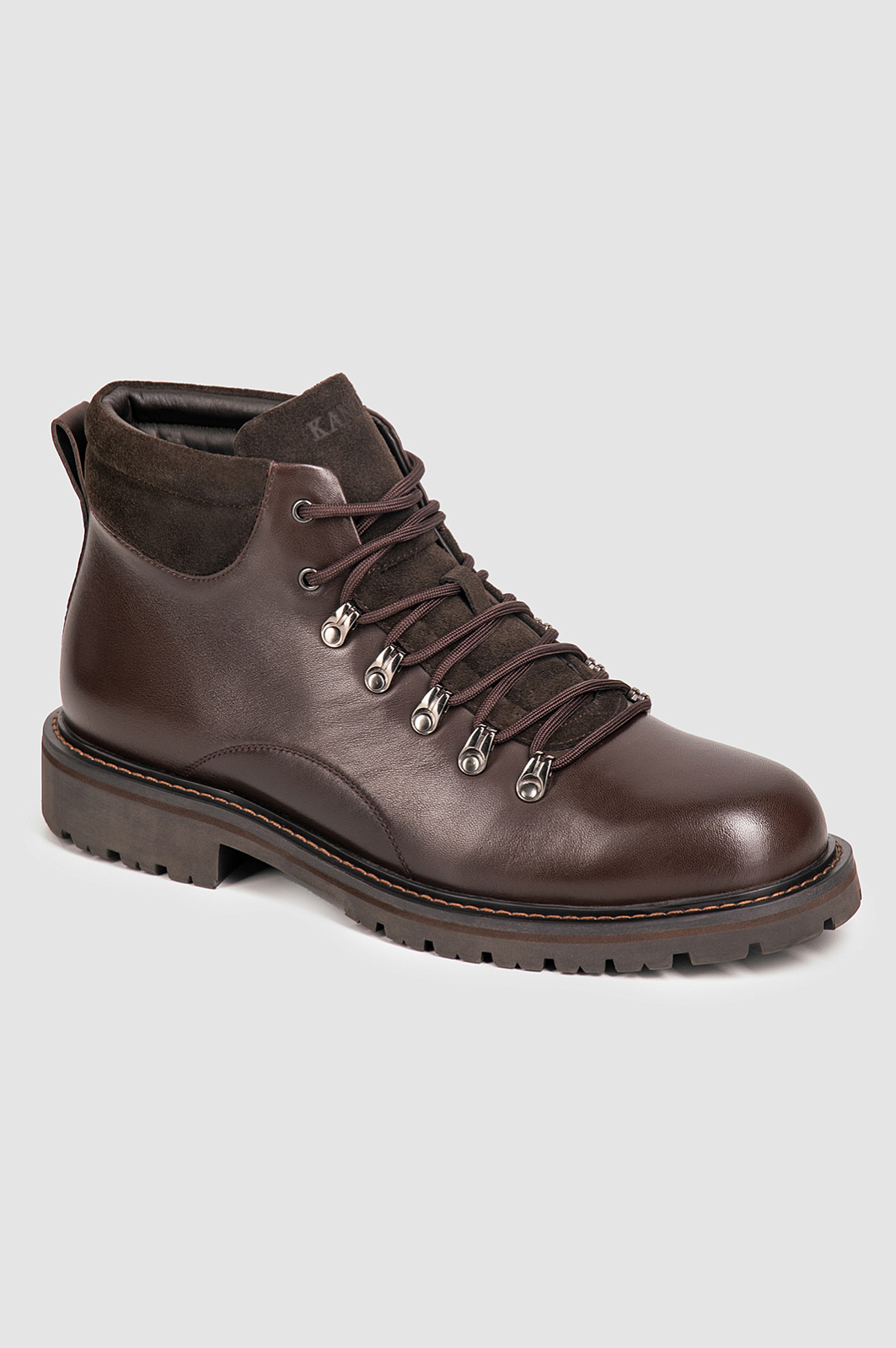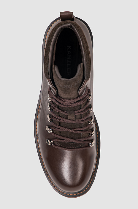 Ботинки KANZLER шоколадного оттенка из прочной гладкой кожи с замшевыми деталями — самая удобная повседневная обувь как для поездок и путешествий, так и жизни в городе в условиях переменчивой погоды. Надежная универсальная модель не теряет качеств горных ботинок благодаря прочному верху из качественной кожи и толстой рифленой подошве из резины, которая обеспечивает хорошее сцепление с любой поверхностью. Ботинки можно носить с комфортом длительное время: внутренняя кожаная подкладка не препятствует циркуляции воздуха. Стелька сделана из микрофибры — износоустойчивого материала, который хорошо впитывает влагу.