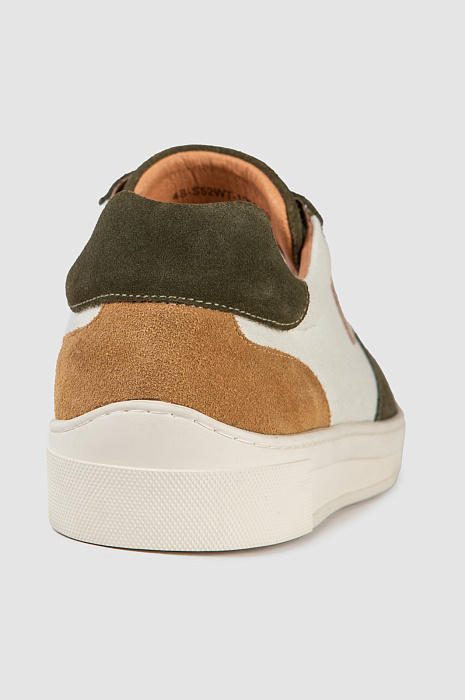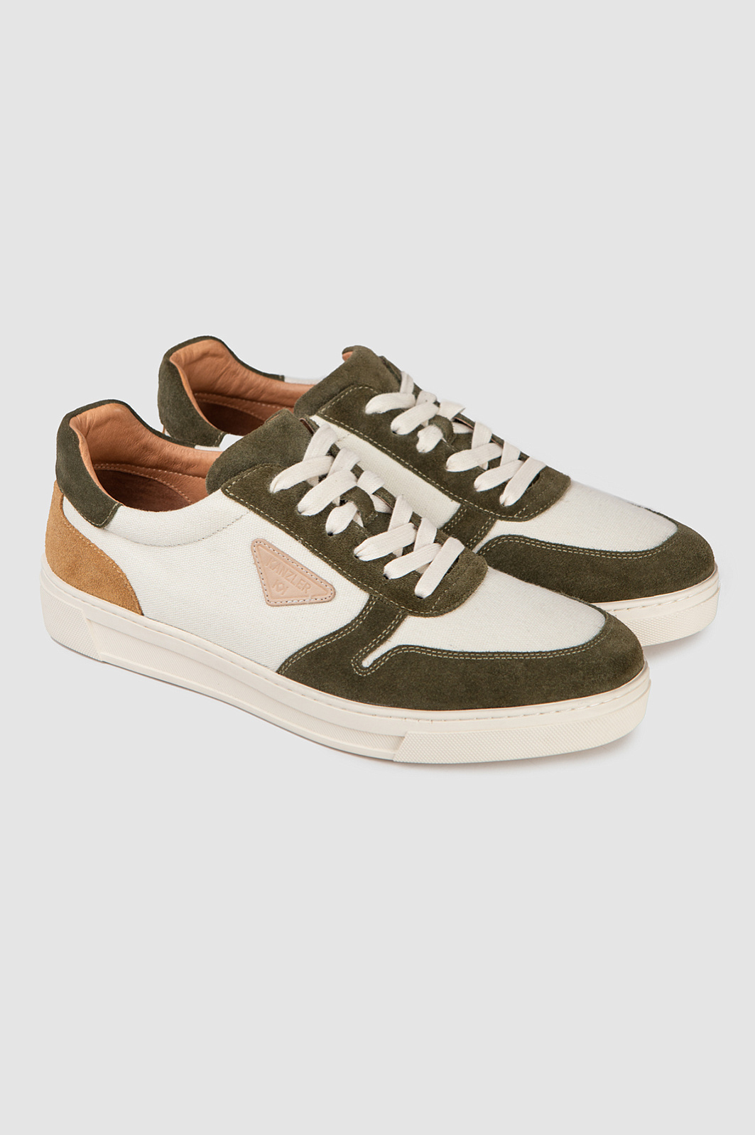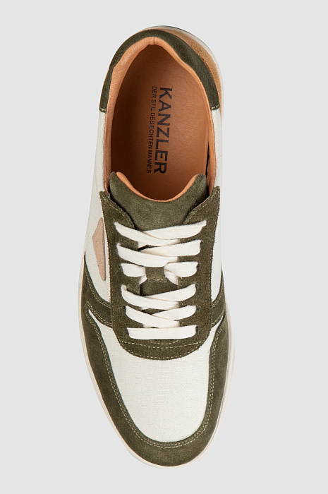 Белые стильные кеды KANZLER из практичного прочного текстиля украшены деталями из натуральной замши темно-оливкового и песочного оттенков и небольшим треугольником фирменной нашивки. В результате получился шедевр спортивной моды и современного урбанистического стиля. Подкладка и стелька из натуральной кожи обеспечивают воздухопроницаемость и комфорт. Утолщенная подошва из качественной плотной резины не стирается даже при длительной и повседневной ходьбе, обеспечивает устойчивость и уверенность при движении. В невероятно удобных кедах KANZLER можно не только легко пройти рекомендуемую дневную норму в 10 тысяч шагов, но и удвоить дистанцию.