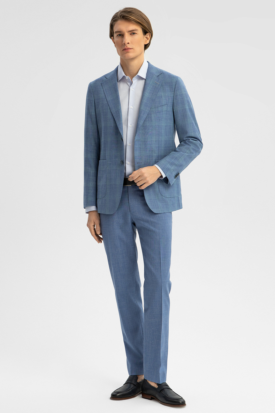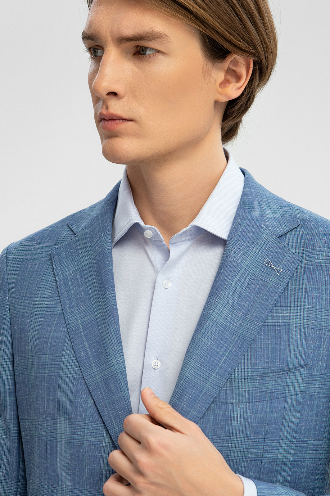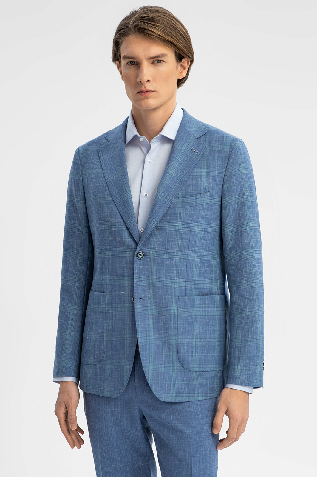 Изящный однобортный пиджак KANZLER василькового оттенка в тонкую широкую клетку из шерсти, льна и шелка — способ привнести легкость и непринужденность в деловые будни и элегантность — в неофициальные мероприятия. Облегченная модель слегка зауженного силуэта без подкладки идеально подходит для теплого сезона. Традиционные детали сочетаются с легкими накладными карманами и небольшой декоративной вышивкой на лацкане. Дорогая натуральная ткань объединила все лучшее сразу. В составе — тонкая овечья шерсть Супер 120S, лен и шелк. Упругие волокна шерсти держат форму и берегут естественное тепло тела, прочный износоустойчивый лен обеспечивает циркуляцию воздуха и отводит влагу, легкий шелк придает ткани благородный лоск. Параметры модели: рост 191, 97-77-99 Размер на модели: 50