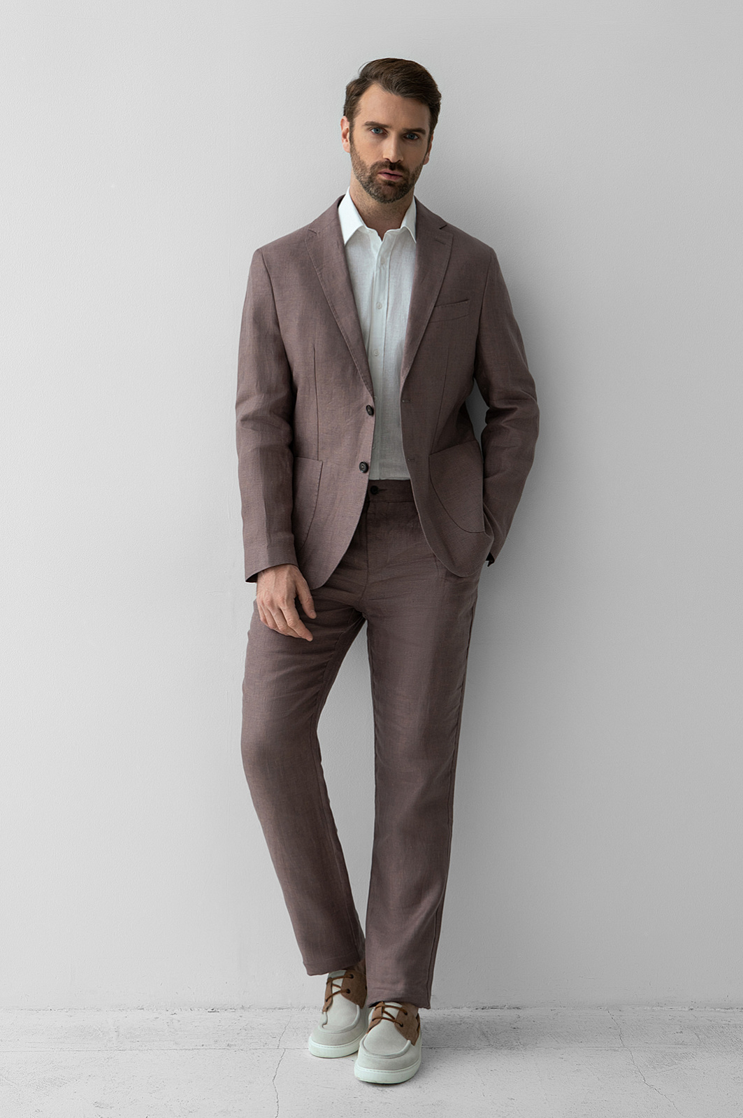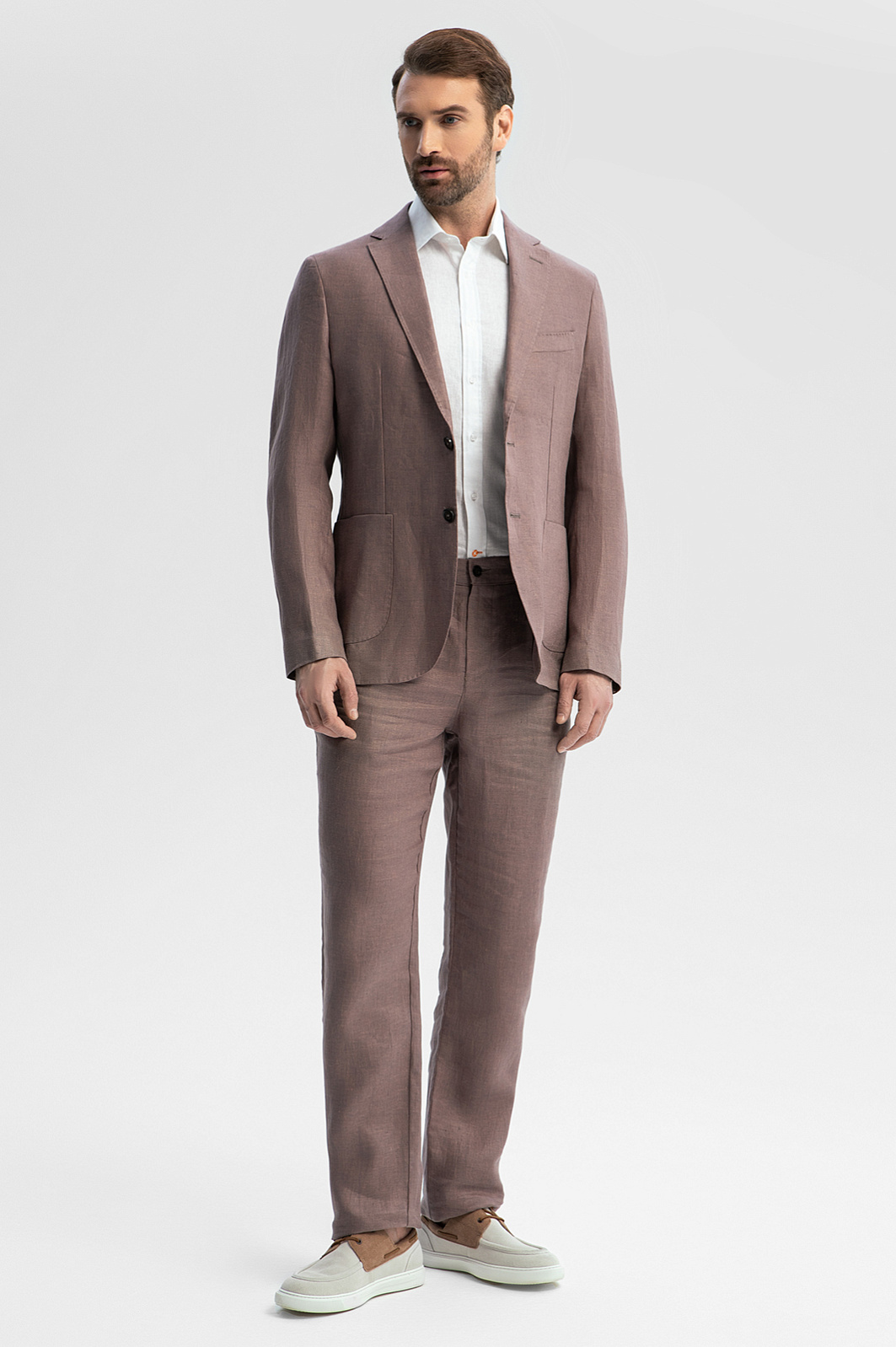 Купили мужу этот льняной костюм. Качество хорошее, достаточно плотный лен. Очень понравился цвет - бежевый с лиловым подтоном, очень освежает и что-то новенькое)