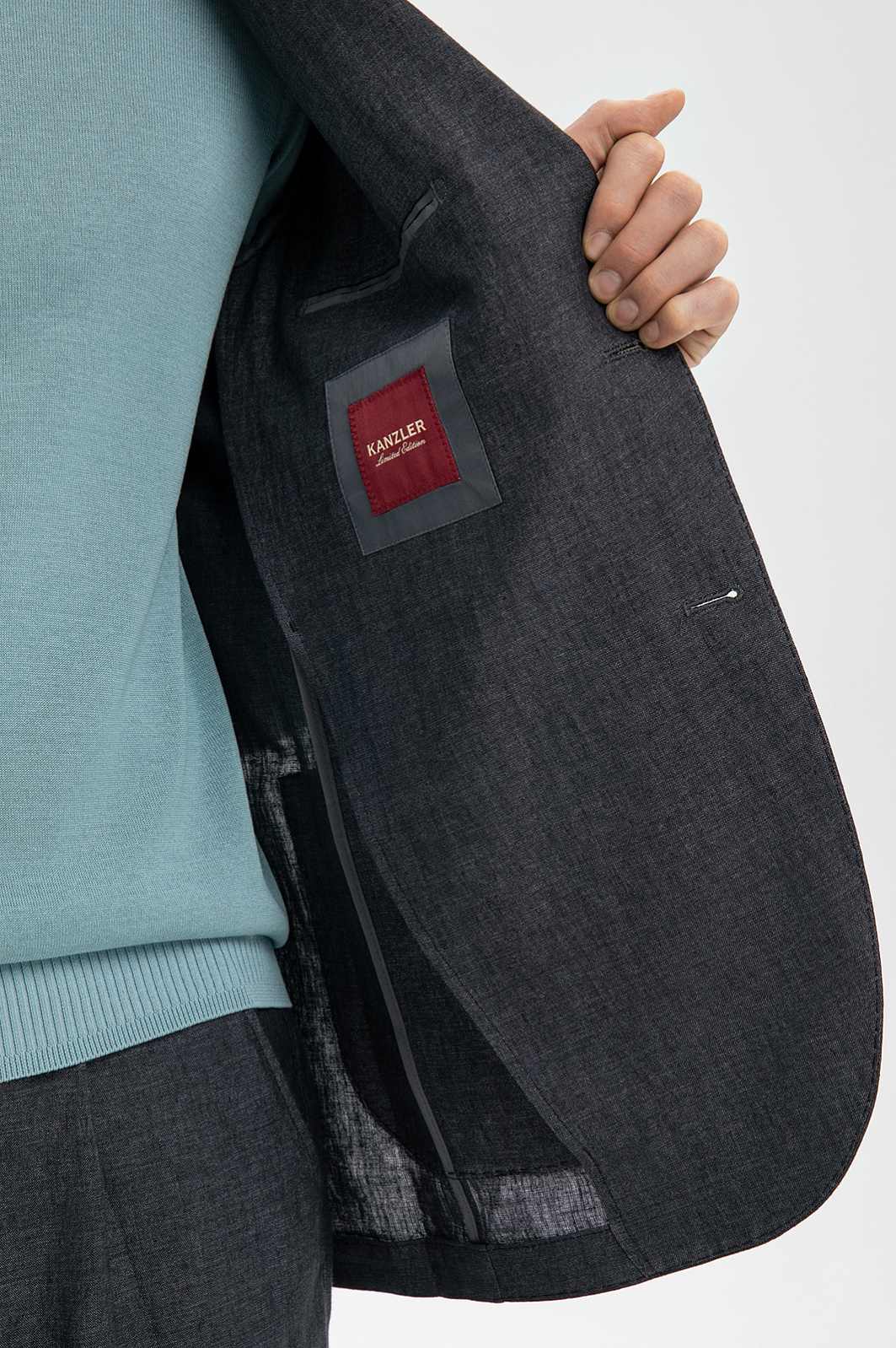 Темно-серый пиджак KANZLER изо льна — украшение лимитированной коллекции. В нем сочетается современный дизайн и высшая степень утонченного классического стиля, проверенного временем. Облегченная модель прилегающего кроя с накладными карманами и двумя шлицами сзади идеально подходит для теплого межсезонья и лета. Высококачественная ткань, произведенная в Италии старинной фамильной мануфактурой Vitale Barberis, — узнаваемая кончиками пальцев роскошь. Ее отличает прочность и естественная фактурность. Натуральные гипоаллергенные волокна льна поддерживают циркуляцию воздуха и создают освежающее ощущение в теплые дни. Параметры модели: рост 189, 91-78-95 Размер на модели: 50