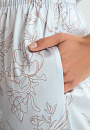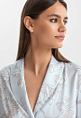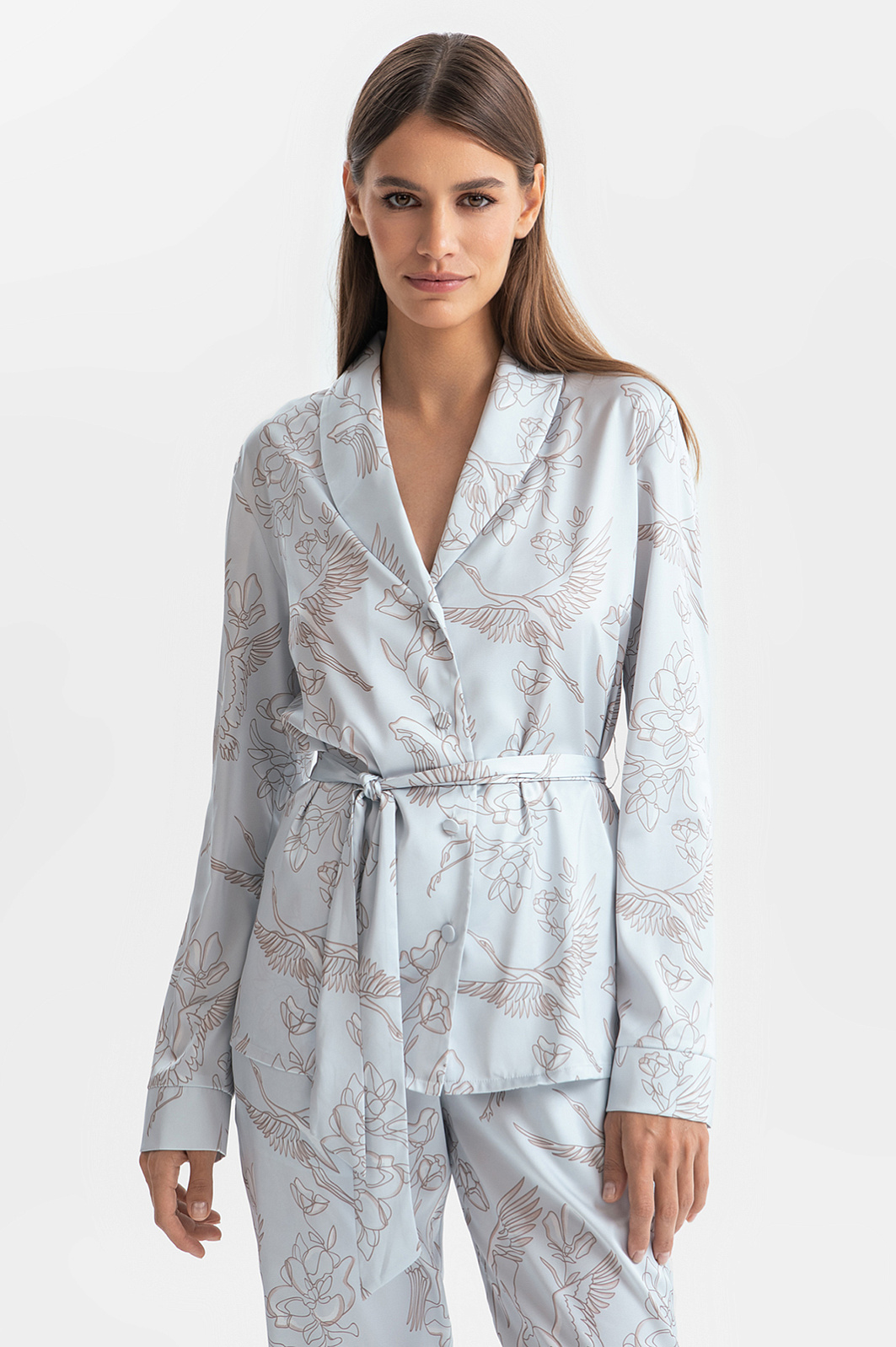 Пижама в мягком светло-сером оттенке, который идеально подходит любому цветотипу, освежает образ и создаёт атмосферу спокойствия. Верх пижамы — удобная рубашка со свободным поясом, который красиво выделяет линию талии. Низ — брюки с практичной кулиской на поясе. Ткань премиального качества отличается необыкновенной мягкостью, нежно окутывает кожу, даря ощущение свежести и уюта. Узор с журавлями, символизирующий душевное спокойствие и внутреннюю свободу, добавляет экзотический штрих, превращая повседневную пижаму в произведение искусства. Это идеальный вариант для неспешного утра с чашкой любимого кофе или расслабленного вечера дома.