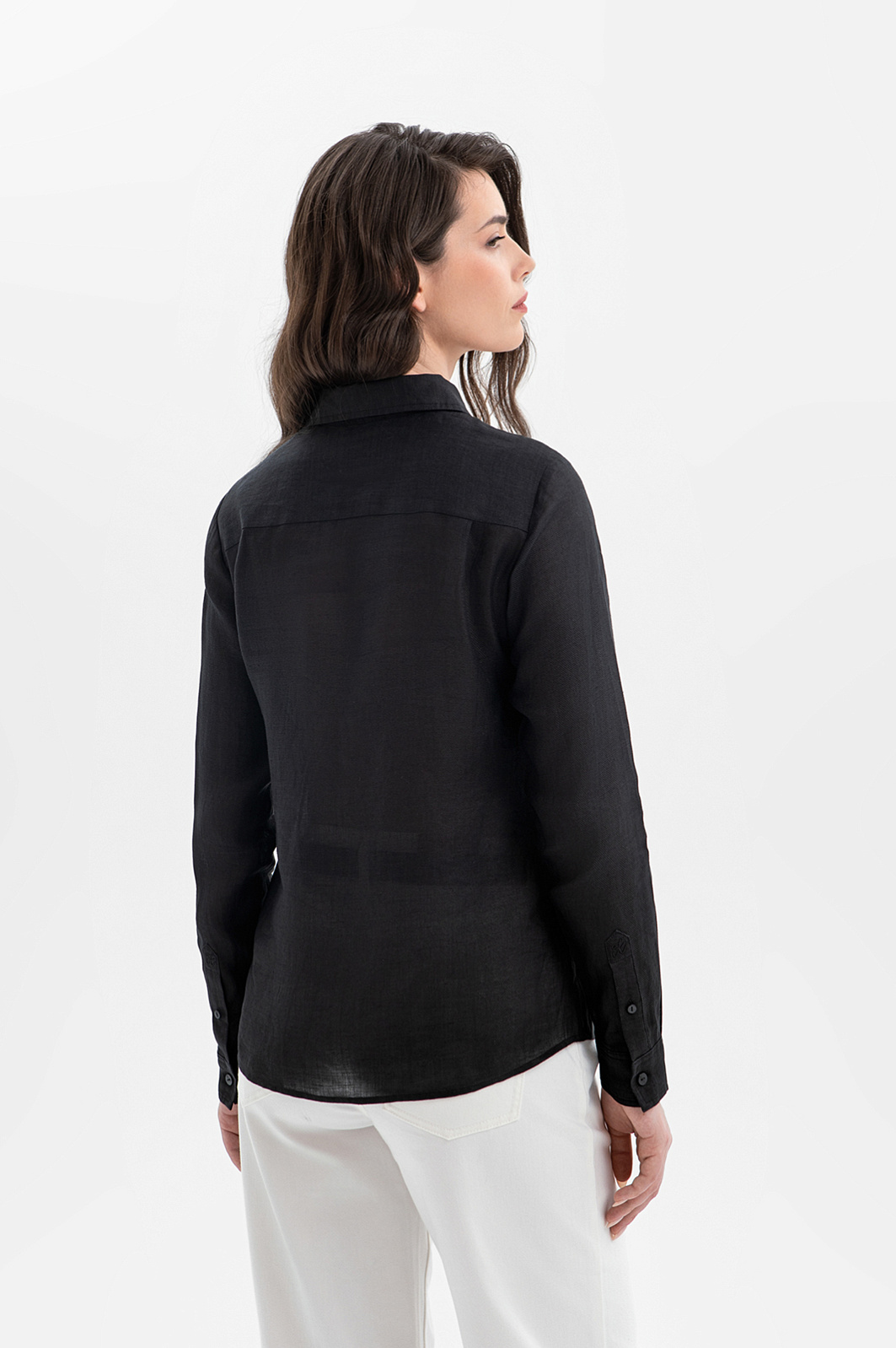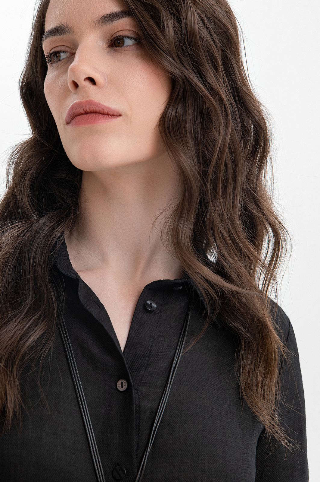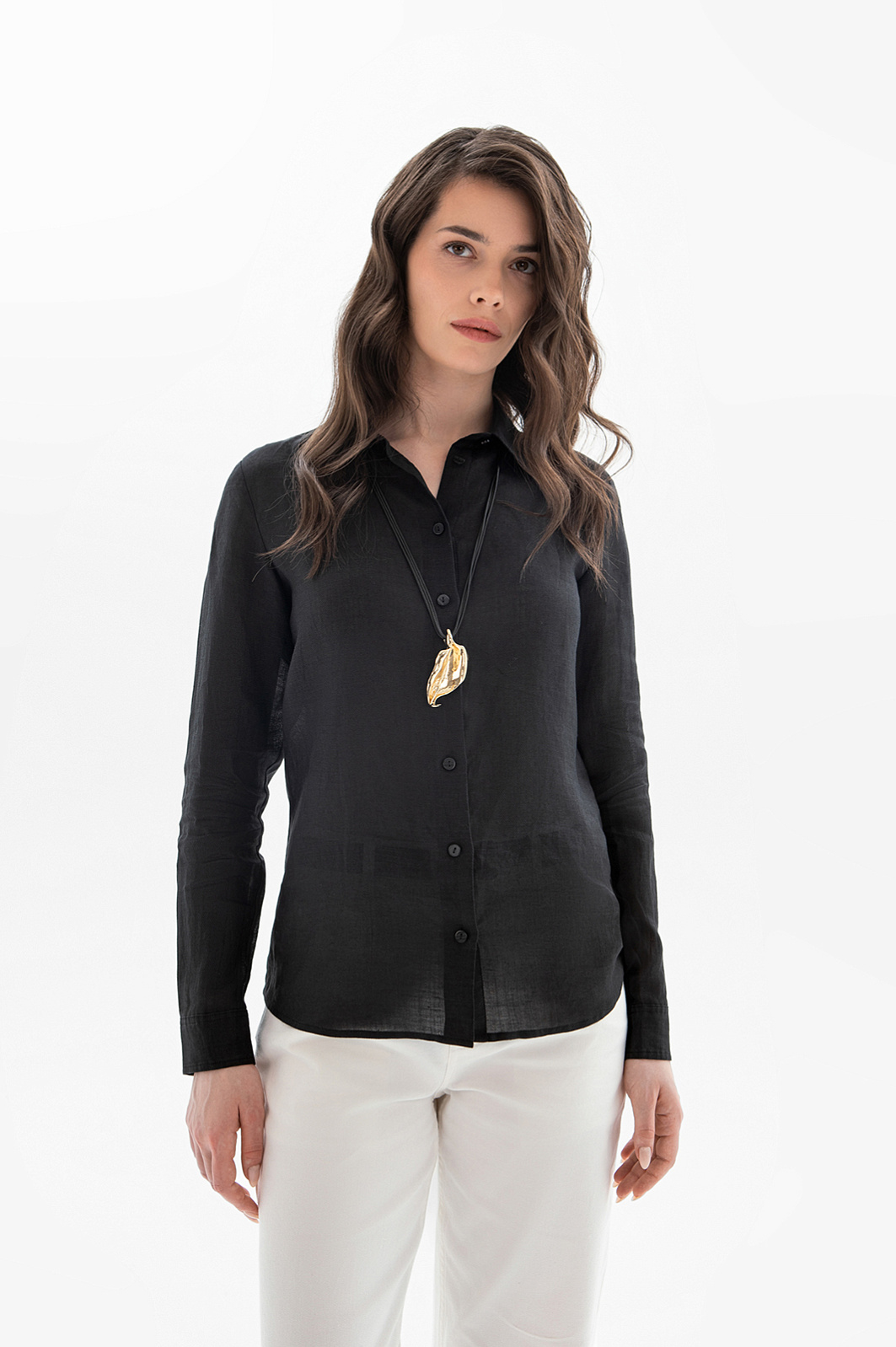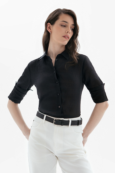 Чёрная рубашка KANZLER из рами — элегантная и универсальная модель, которая легко впишется как в офисный гардероб, так и в повседневные аутфиты для свободного времени. Носите её заправленной в юбку или брюки для создания лаконичного силуэта или оставляйте навыпуск — для более расслабленного или вечернего образов. Сочетание лаконичного кроя и невесомой ткани с деликатной прозрачностью выглядит невероятно женственно. Естественная структура полотна из рами придаёт вещи благородную фактурность и выразительность. Натуральные волокна, которые получают из стеблей одноимённого растения, обладают прочностью, воздухопроницаемостью и гипоаллергенными свойствами. Такая ткань легко сохраняет форму и практически не подвержена усадке.