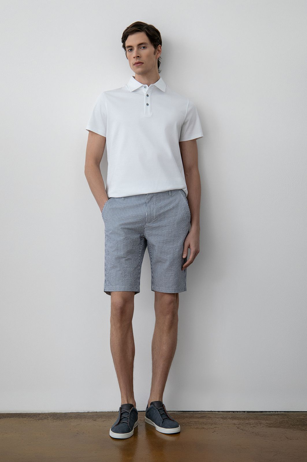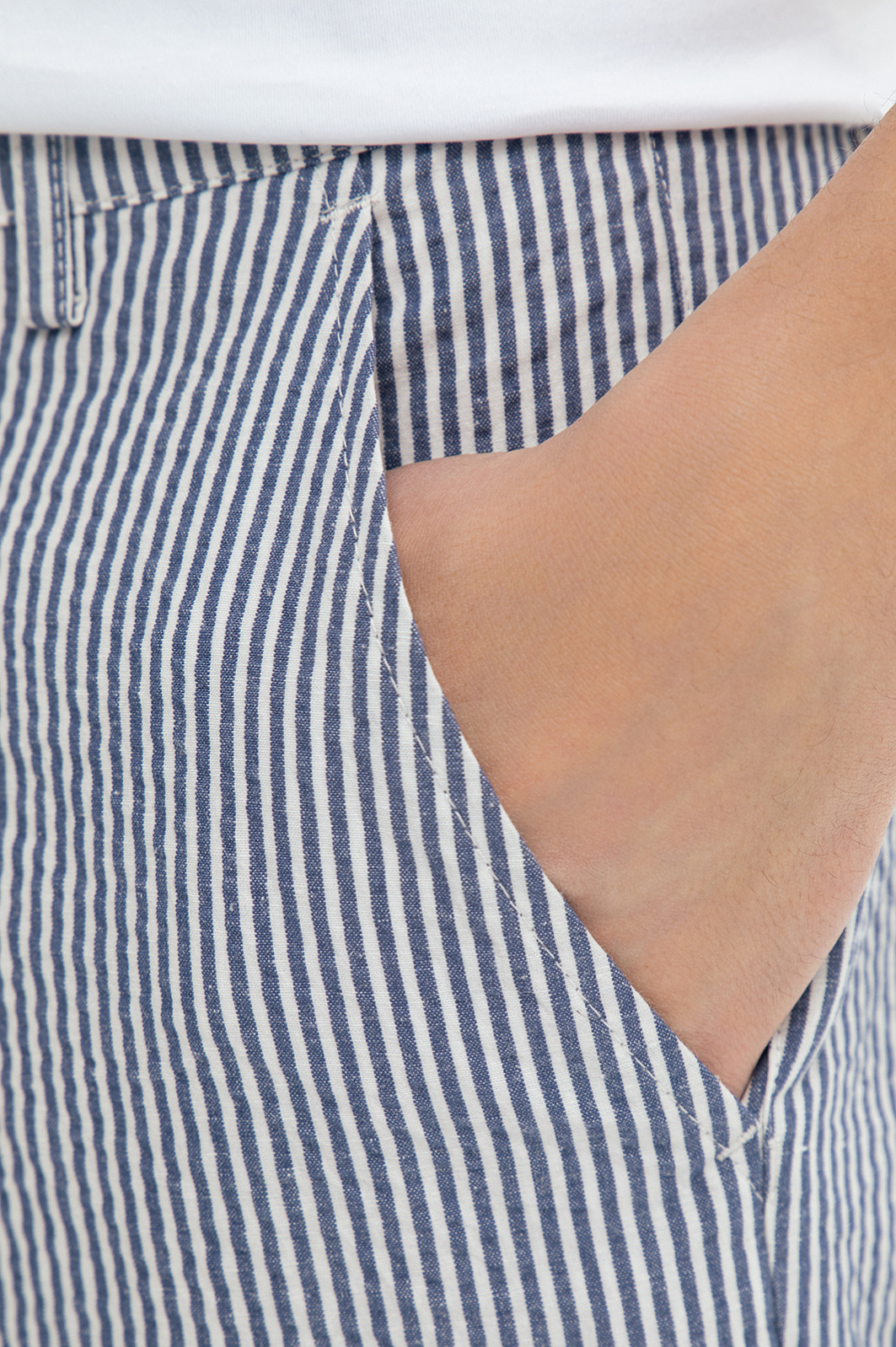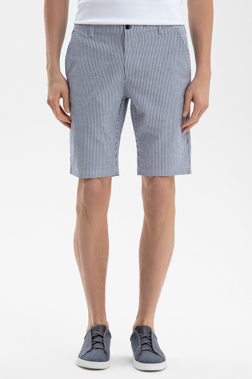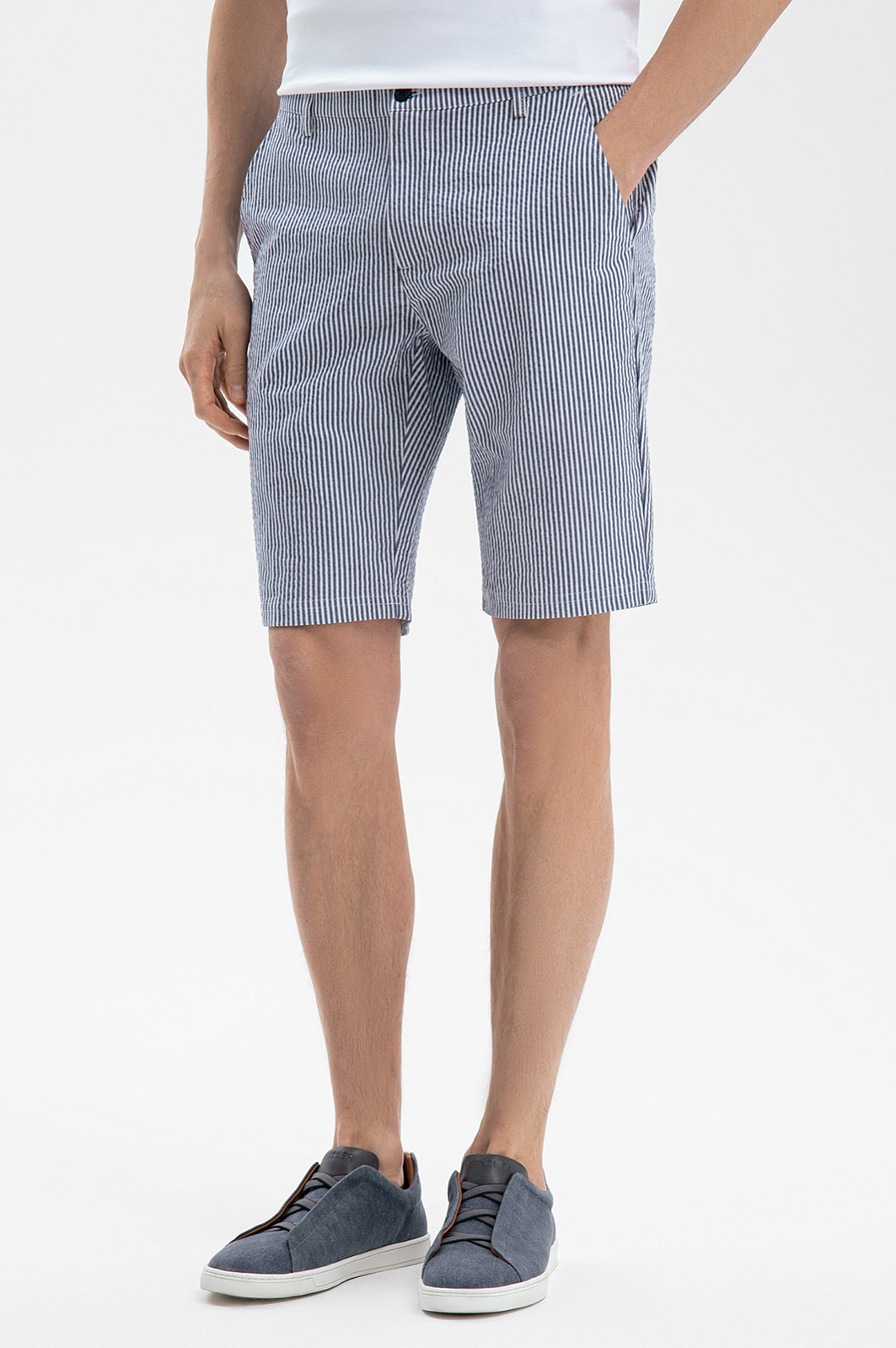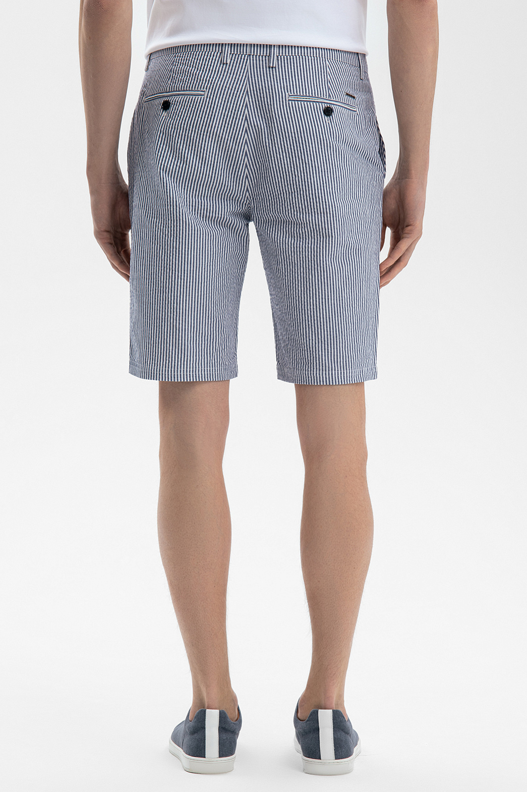 Синие бермуды KANZLER из хлопка и льна в полоску воплощают эстетику морских путешествий, вдохновляя на покорение новых горизонтов. Это универсальный выбор для самых разных активностей – прогулки по набережной, пикника в парке или игры в гольф. Для создания модели выбрали натуральный дышащий материал из хлопка (77%) и льна (23%). Гигроскопичная ткань отводит влагу, быстро сохнет и сохраняет ощущение прохлады даже под палящим солнцем. Классический крой с универсальной длиной до колена обеспечивает комфортную посадку и подходит любому типу фигуры. Тонкая вертикальная полоска визуально стройнит. Сочетайте бермуды с поло пастельных оттенков и кедами для городского образа или с гавайской рубашкой и эспадрильями – для вечеринки или путешествия. Параметры модели: рост 189, 91-78-95 Размер на модели: 50