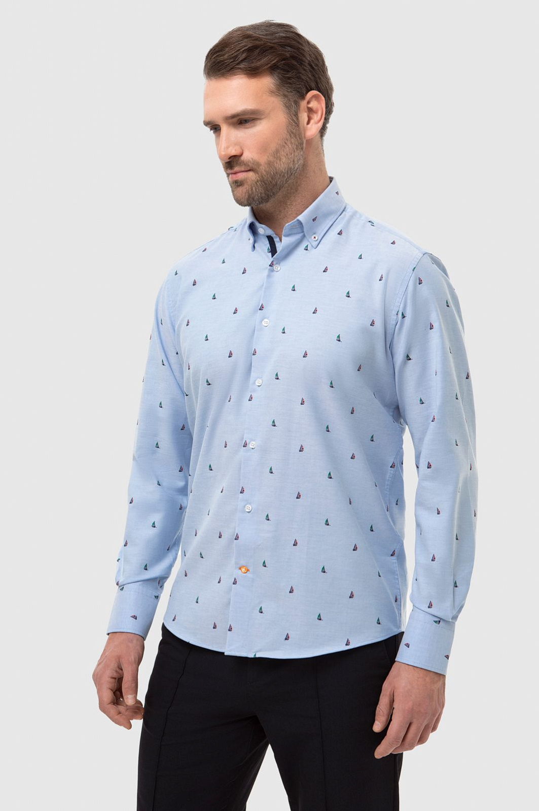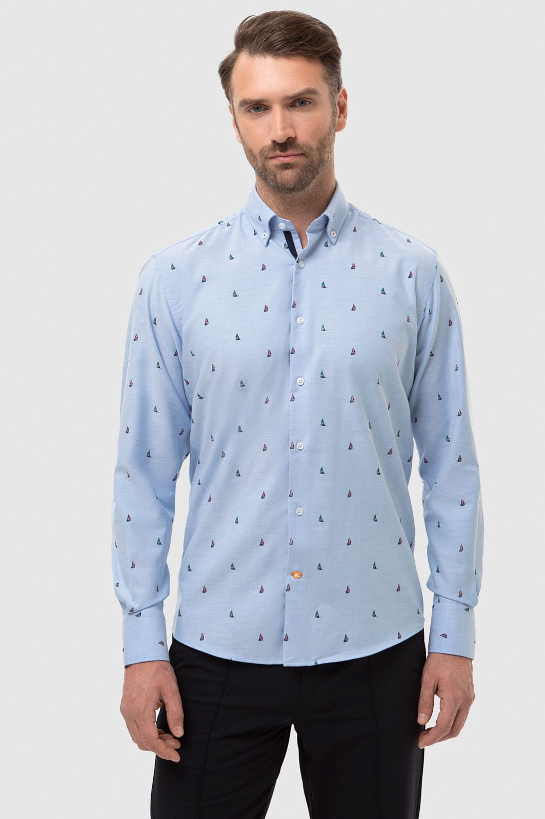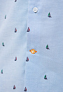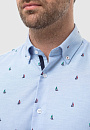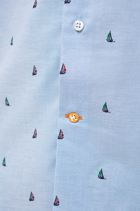 Голубая рубашка KANZLER с длинными рукавами. Пуговицы на воротнике подчеркивают неформальный стиль рубашки: это прослеживается в морской тематике изделия и расслабленном прямом крое. Модель сшита из гладкого хлопкового трикотажа - материал хорошо пропускает воздух и обеспечивает комфорт. Морской рисунок с безмятежными яхтами расположился на границе спорта и отдыха и сформировал образ, который впишется как в курортный аутфит, так и повседневный городской контекст. Советуем сочетать приталенную модель с джинсами или брюками в синем оттенке и классическими белыми кедами. Параметры модели: рост 189, 102-80-99 Размер на модели: 40