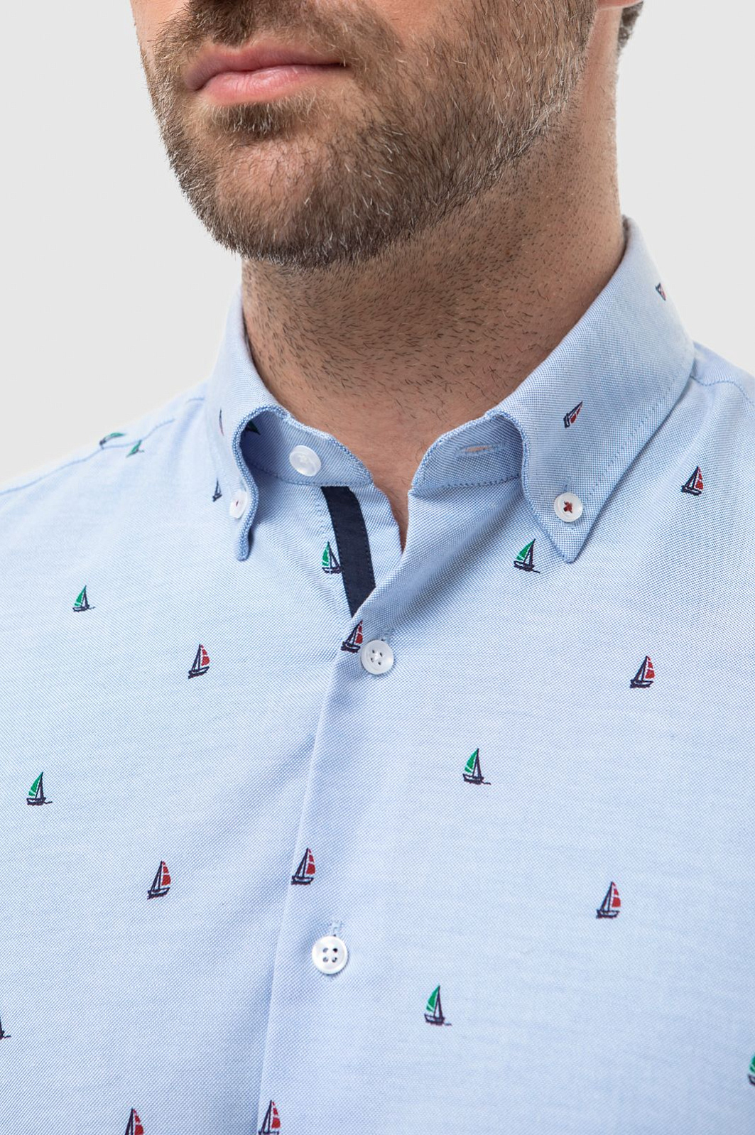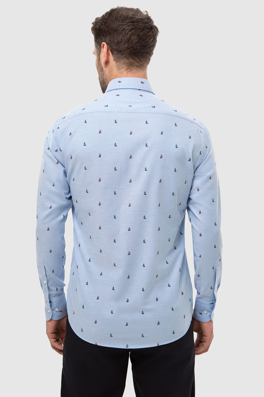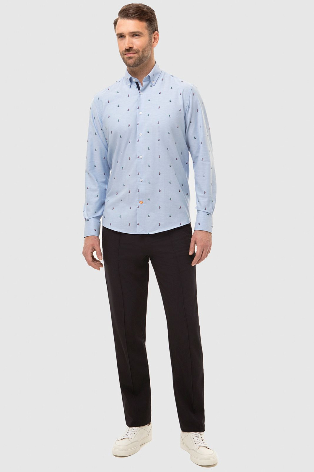 Голубая рубашка KANZLER с длинными рукавами. Пуговицы на воротнике подчеркивают неформальный стиль рубашки: это прослеживается в морской тематике изделия и расслабленном прямом крое. Модель сшита из гладкого хлопкового трикотажа - материал хорошо пропускает воздух и обеспечивает комфорт. Морской рисунок с безмятежными яхтами расположился на границе спорта и отдыха и сформировал образ, который впишется как в курортный аутфит, так и повседневный городской контекст. Советуем сочетать приталенную модель с джинсами или брюками в синем оттенке и классическими белыми кедами. Параметры модели: рост 189, 102-80-99 Размер на модели: 40