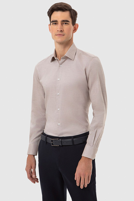 Сорочка - незаменимый элемент делового мужского стиля. Серо-бежевая сорочка с классическим воротником снизит градус формальности образа с деловым костюмом и сможет подружиться с кежуал брюками. Для пошива модели использовали тонкую ткань из отборного хлопка с шероховатой фактурой. Легкий дышащий материал сохранит свежий вид на весь день и обеспечит комфорт в течение дня. Наши стилисты предлагают дополнить пастельный оттенок изделия однотонными вещами: темно-синими брюками песочными топсайдерами. Параметры модели: рост 192, 101-76-97 Размер на модели: 40