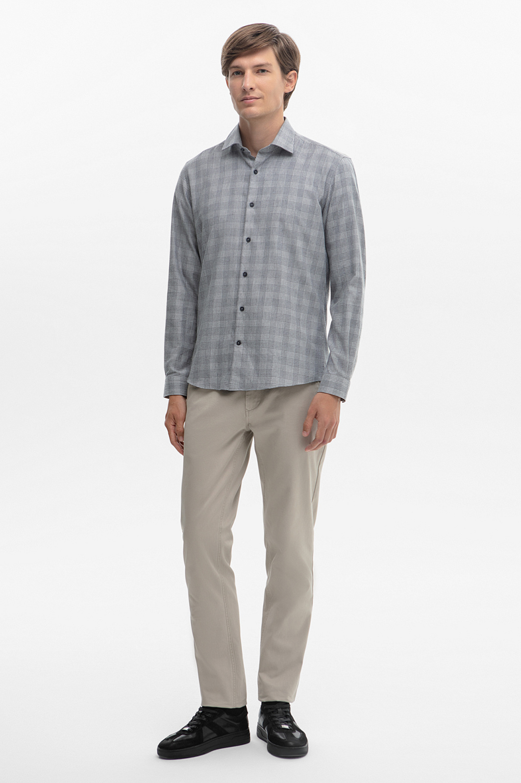 Роскошная сорочка в клетку из легчайшего хлопка от европейского лидера в производстве натуральных тканей Getzner (Австрия) — воплощение высокого качества и комфорта. Ткань от Getzner славится своей износостойкостью и сохраняет безупречный вид даже после частых стирок. Натуральный хлопок премиального класса обеспечивает её исключительную мягкость и воздухопроницаемость. Гипоаллергенная ткань делает её идеальной для ежедневной носки и обеспечивая ощущение свежести на протяжении всего дня. Принт в серую клетку придаёт изделию элегантный и сдержанный вид и легко вписывается в любой гардероб. Классический силуэт подчёркивает фигуру, не ограничивая движений, что обеспечивает свободу и комфорт. Модель прекрасно сочетается со светлыми брюками, джинсами или брюками для повседневного стиля. Параметры модели: рост 191, 97-77-99 Размер на модели: 40