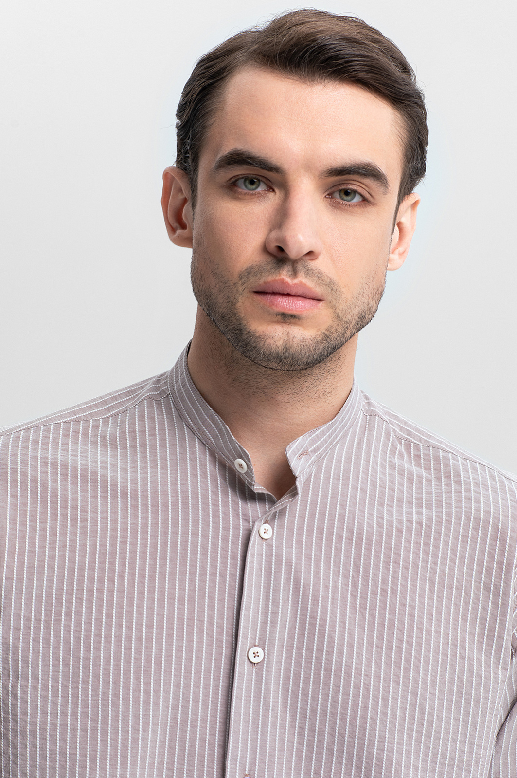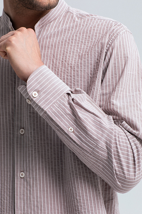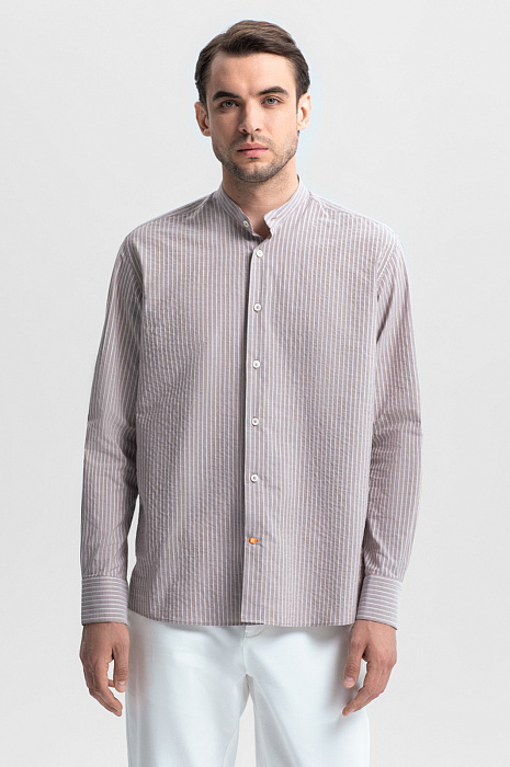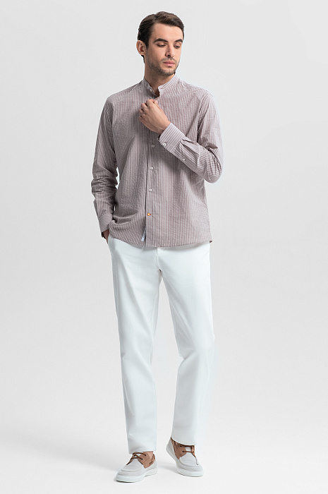 Для создания светло-коричневой сорочки KANZLER выбрали ткань от Canclini – итальянской мануфактуры с вековой историей, одного из признанных лидеров в производстве сорочечных тканей. 100-процентный гипоаллергенный хлопок, мягкий и дышащий, дарит ощущение комфорта в жаркий день. Узор в вертикальную полоску добавляет образу динамики и визуально стройнит. Жатая фактура создает эффект утонченной непринужденности и маскирует складки, делая сорочку идеальным выбором для путешествий и активных дней. Модель с элегантным воротником-стойкой легко интегрируется в деловой и повседневный гардероб. Дополните образ светлыми брюками и замшевыми топсайдерами. Параметры модели: рост 191, 101-79-101 Размер на модели: 40