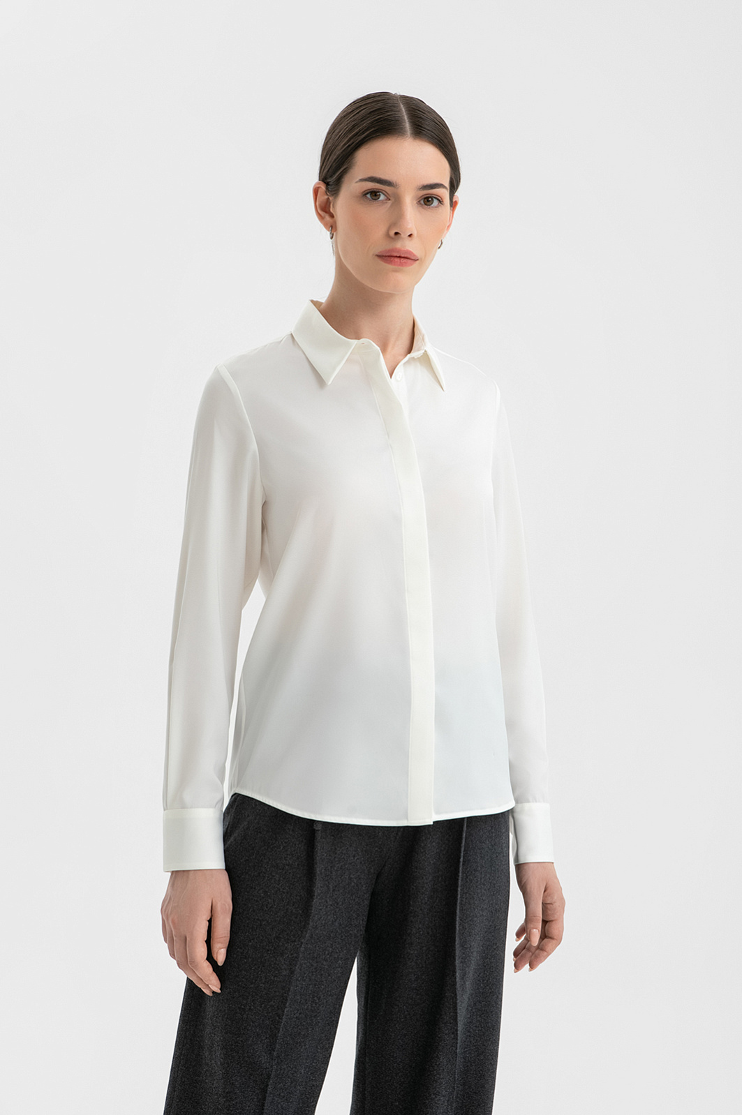Белоснежная сорочка KANZLER — базовая вещь в деловом гардеробе для создания нарядных офисных образов с костюмом, формальными брюками, жилетом или кардиганом, а также лаконичных повседневных аутфитов с джинсами или юбкой. Благодаря классическому крою и планке со скрытыми пуговицами она выглядит аккуратно и элегантно, а полукруглый низ позволяет носить сорочку как заправленной, так и навыпуск. Материал — прочная практичная эластичная ткань (92% полиэстер, 8% спандекс) — почти не мнётся, хорошо держит форму и слегка тянется, не ограничивая свободу движений.